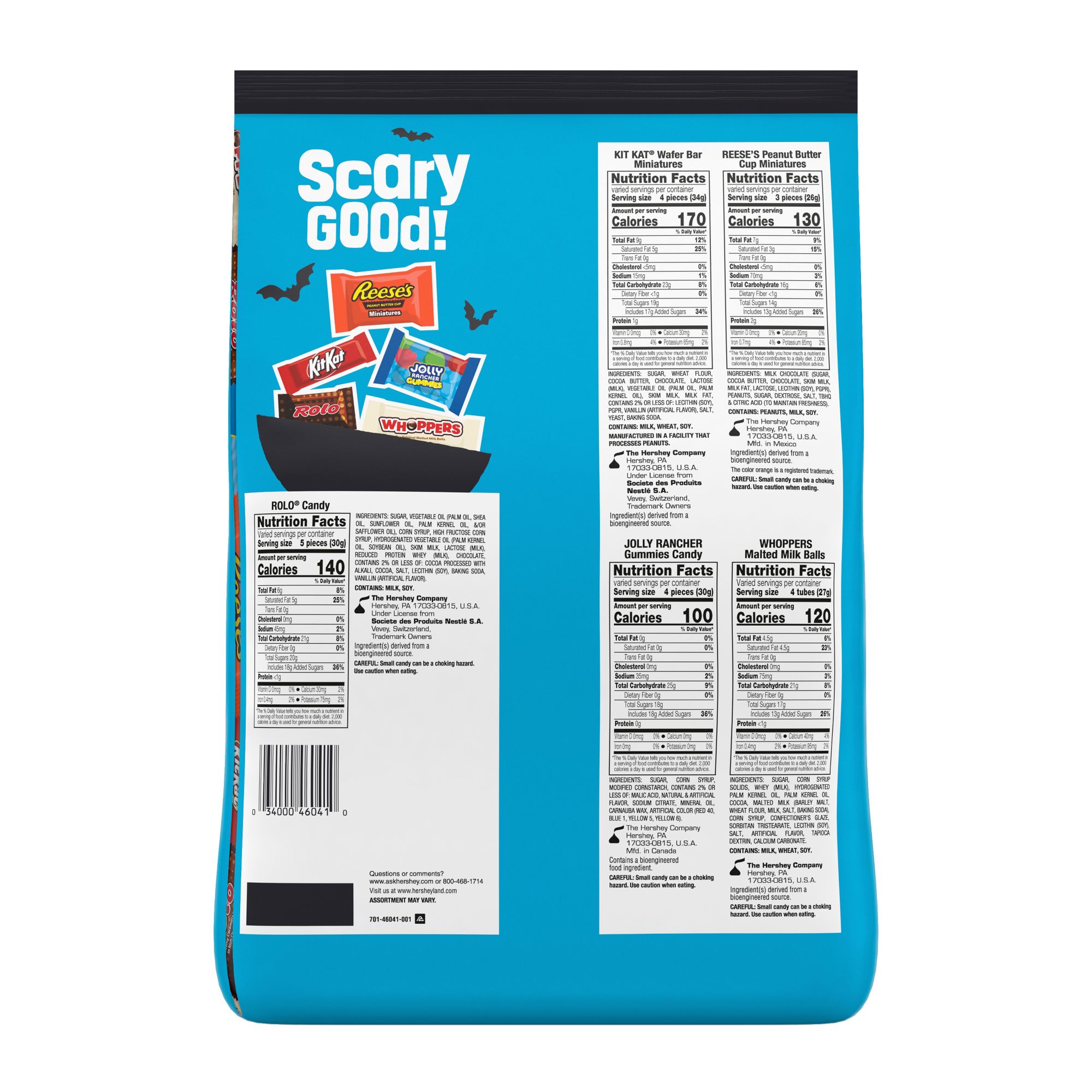 Enjoy a delicious treat anywhere and anytime with Hershey assorted flavored candy in a variety bag. Offering five crowd pleasing favorites, this candy assortment is perfect for sharing with family, friends and Halloween night trick or treat and trunk or treat visitors. Take this bulk variety candy bag into the office break room, pour some individually wrapped candies into your jar at home or take a bag to your next costume party to make an impression. This variety bag includes Reese's milk chocolate peanut butter cups candy, Whoppers malted milk balls candy, Kit Kat milk chocolate wafer candy bars, Rolo rich chocolate caramel candy and Jolly Rancher gummies assorted fruit flavored candy. Hershey candy is also great for parties, holidays, desserts, picnics, lunch boxes, tailgate events and more. You really can't go wrong when you have a variety of chocolatey and fruit flavored sweets on hand. Feeling creative in the kitchen? Add a few pieces of candy on top of your favorite cookies, cupcakes and other sweet treats. Add them to your Halloween festivities, too. Pass these candies out to trick or treaters or award the entire bag to the winner of your Halloween party costume contest. Just don't forget to save a few miniature pieces for yourself!