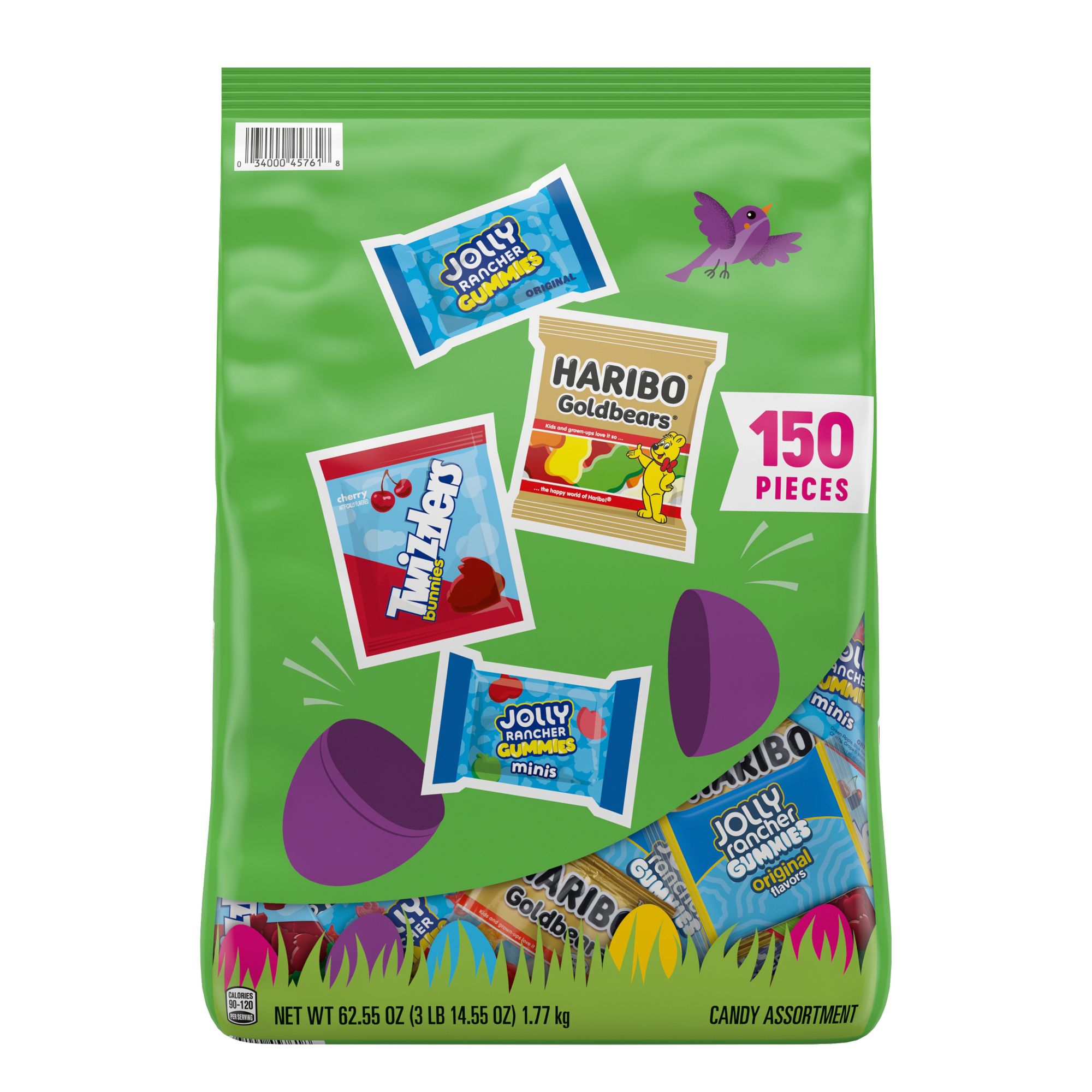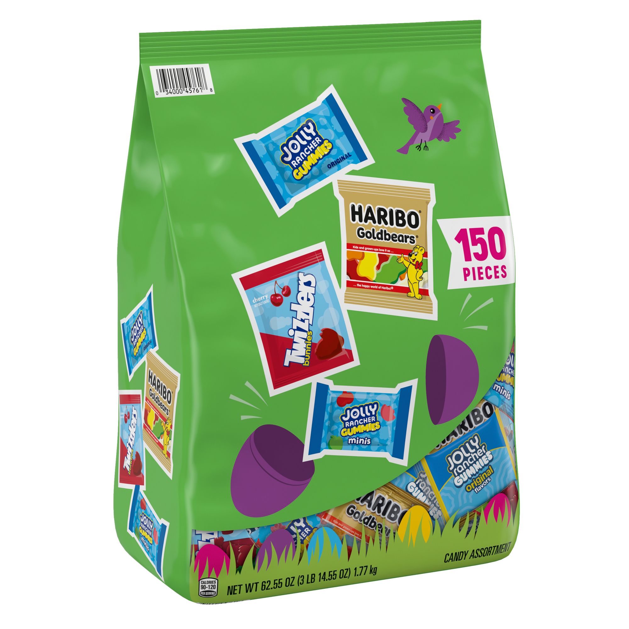 Contains one (1) 62.55-ounce, 150-piece bulk variety bag of Haribo, Jolly Rancher and Twizzlers Assorted Fruit Flavored Candy
