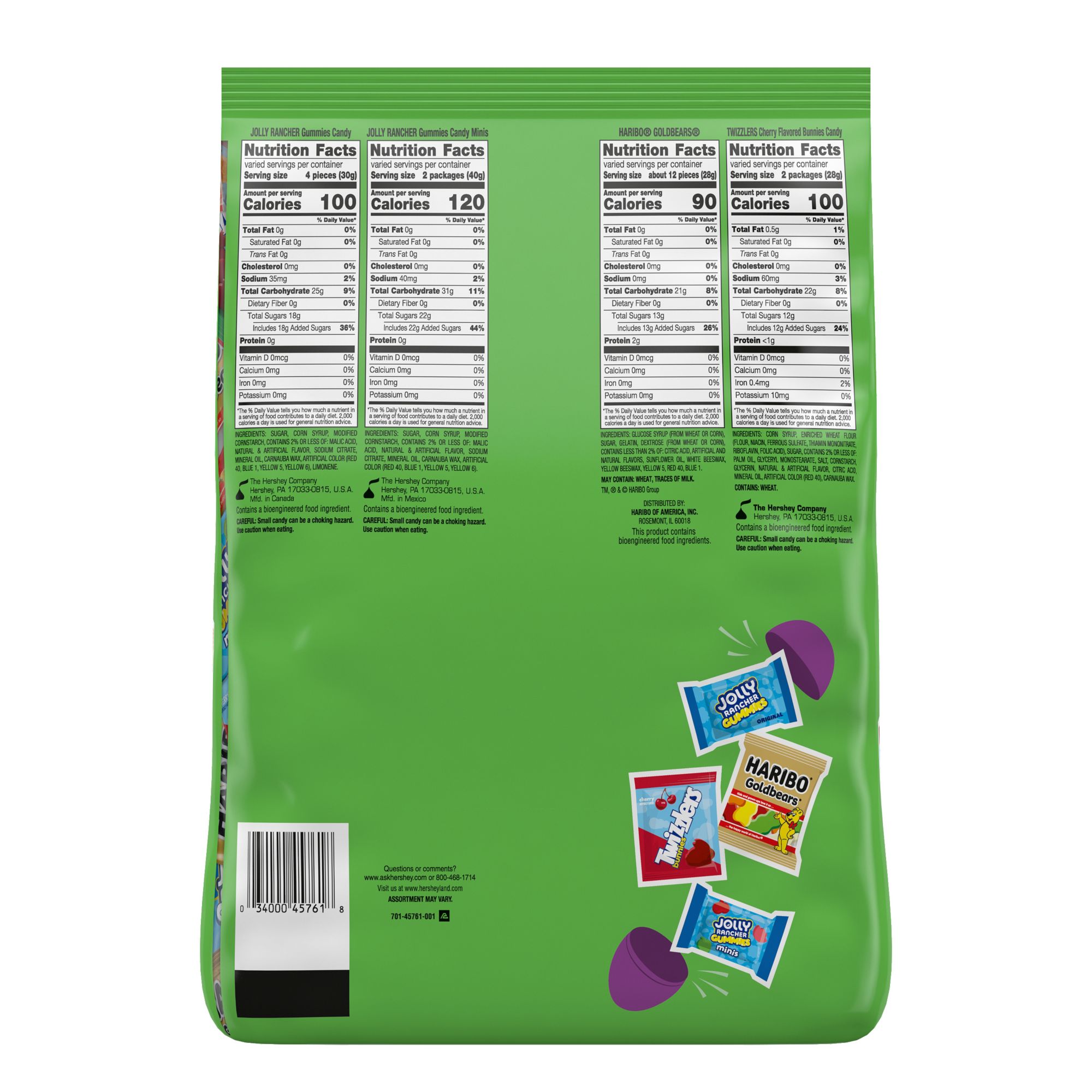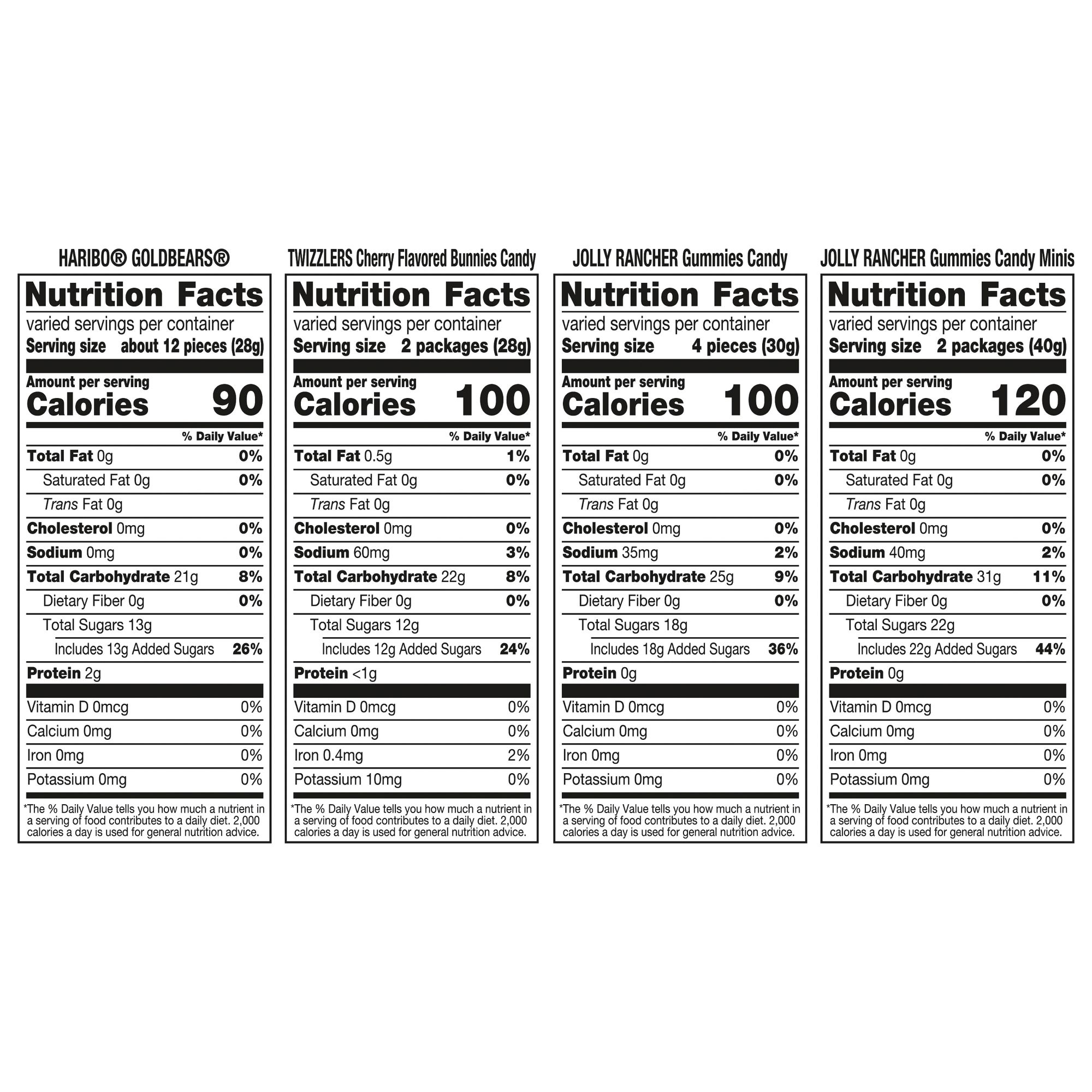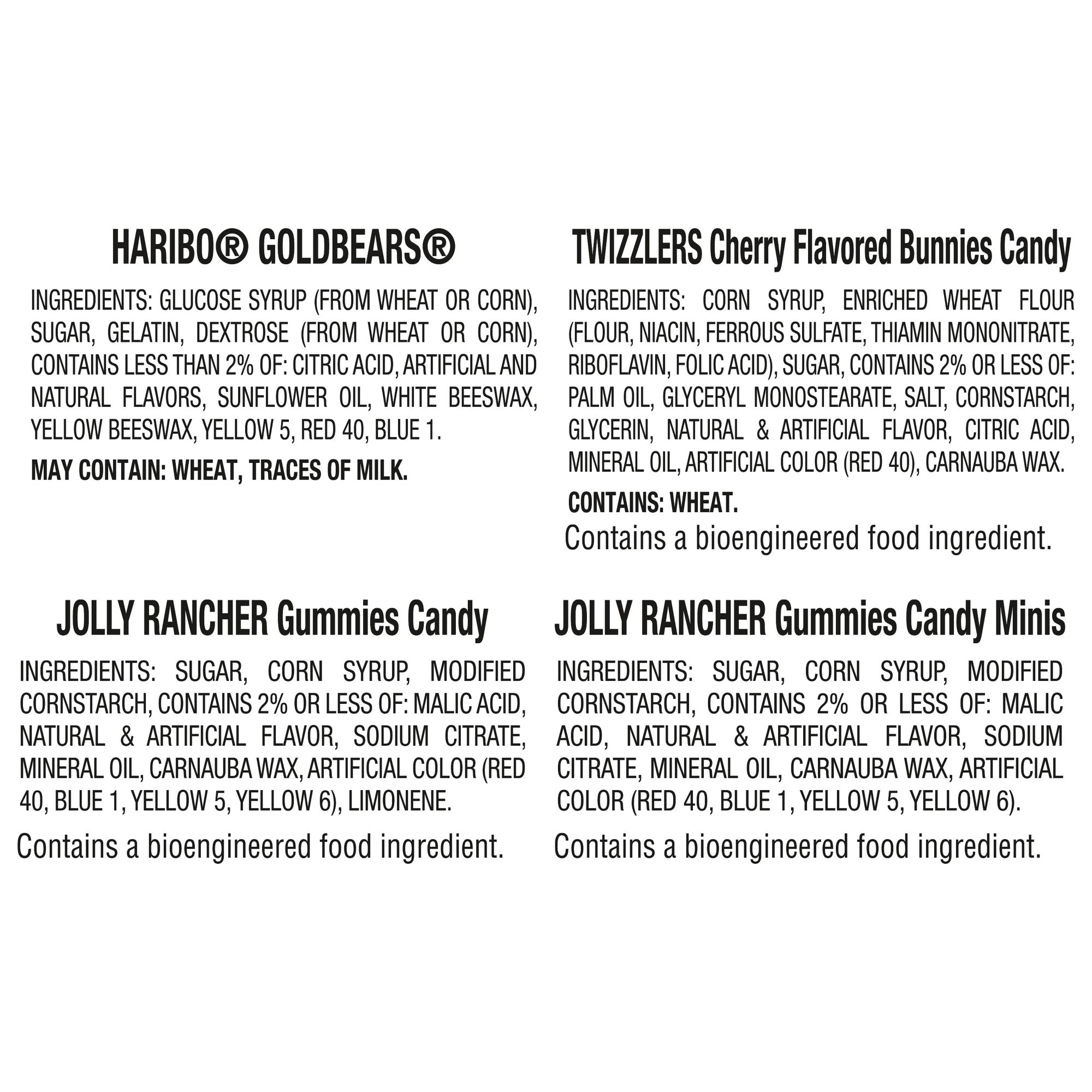 Haribo Goldbears gummy candy, Twizzlers cherry flavored bunnies candy, Jolly Rancher gummies candy and Jolly Rancher gummies minis candy