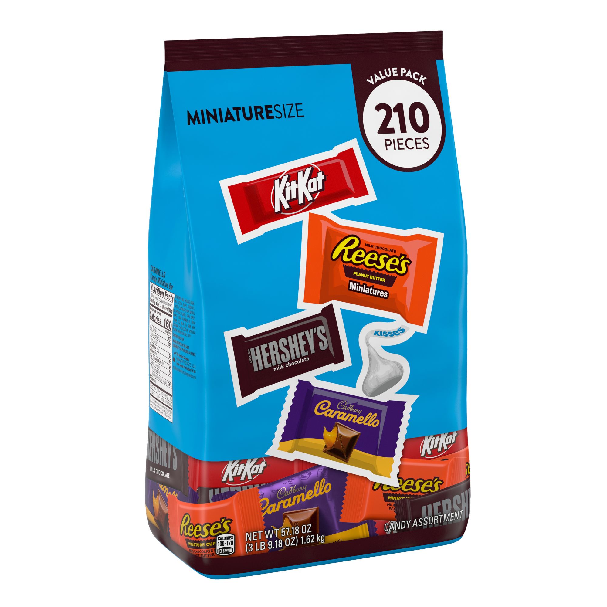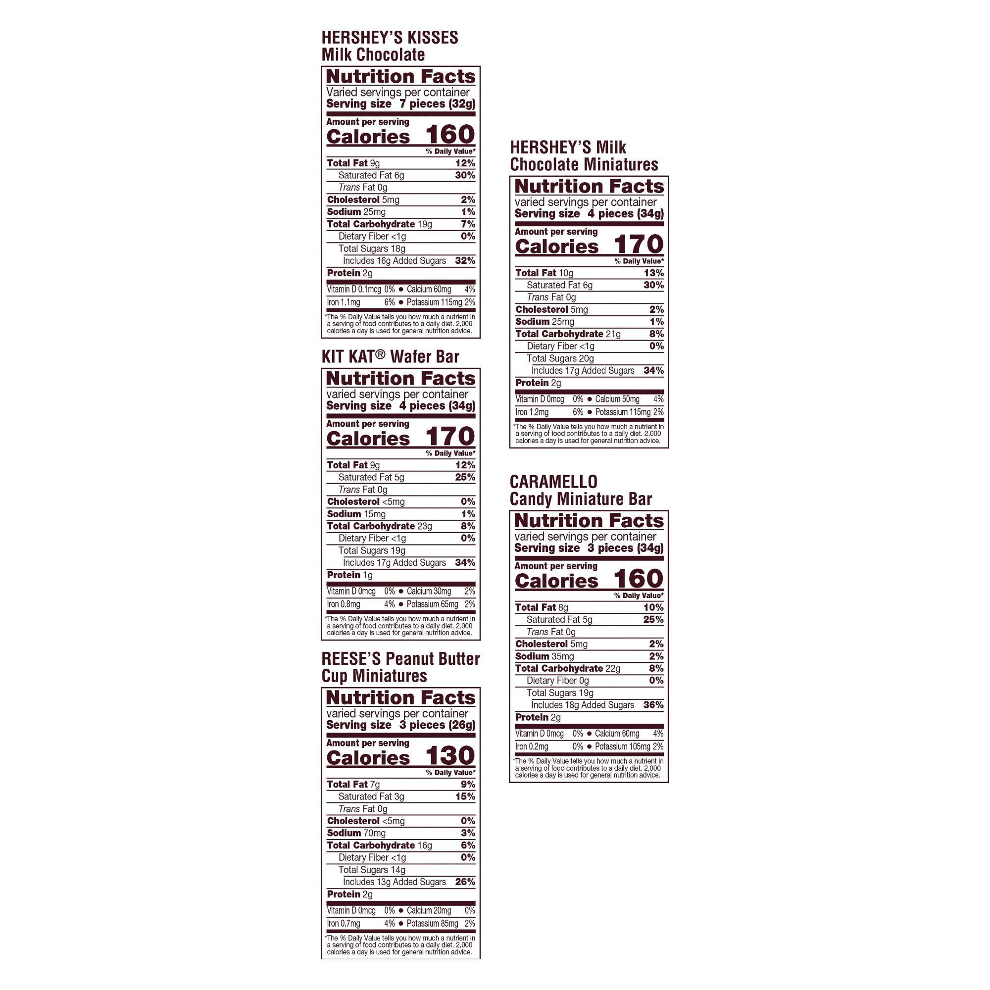 Includes Kit Kat milk chocolate wafer candy, Reese's milk chocolate peanut butter cups, Hershey's milk chocolate candy bars, Hershey's Kisses milk chocolate & Cadbury Caramello milk chocolate caramel candy bars