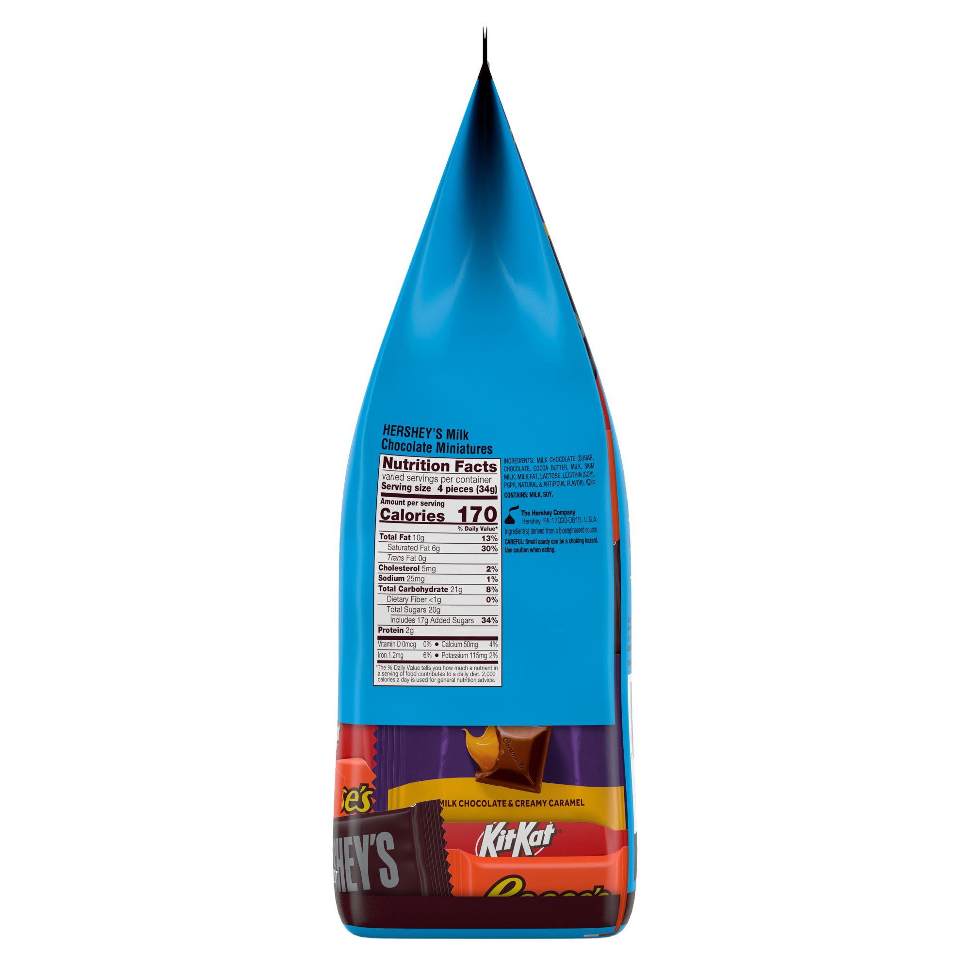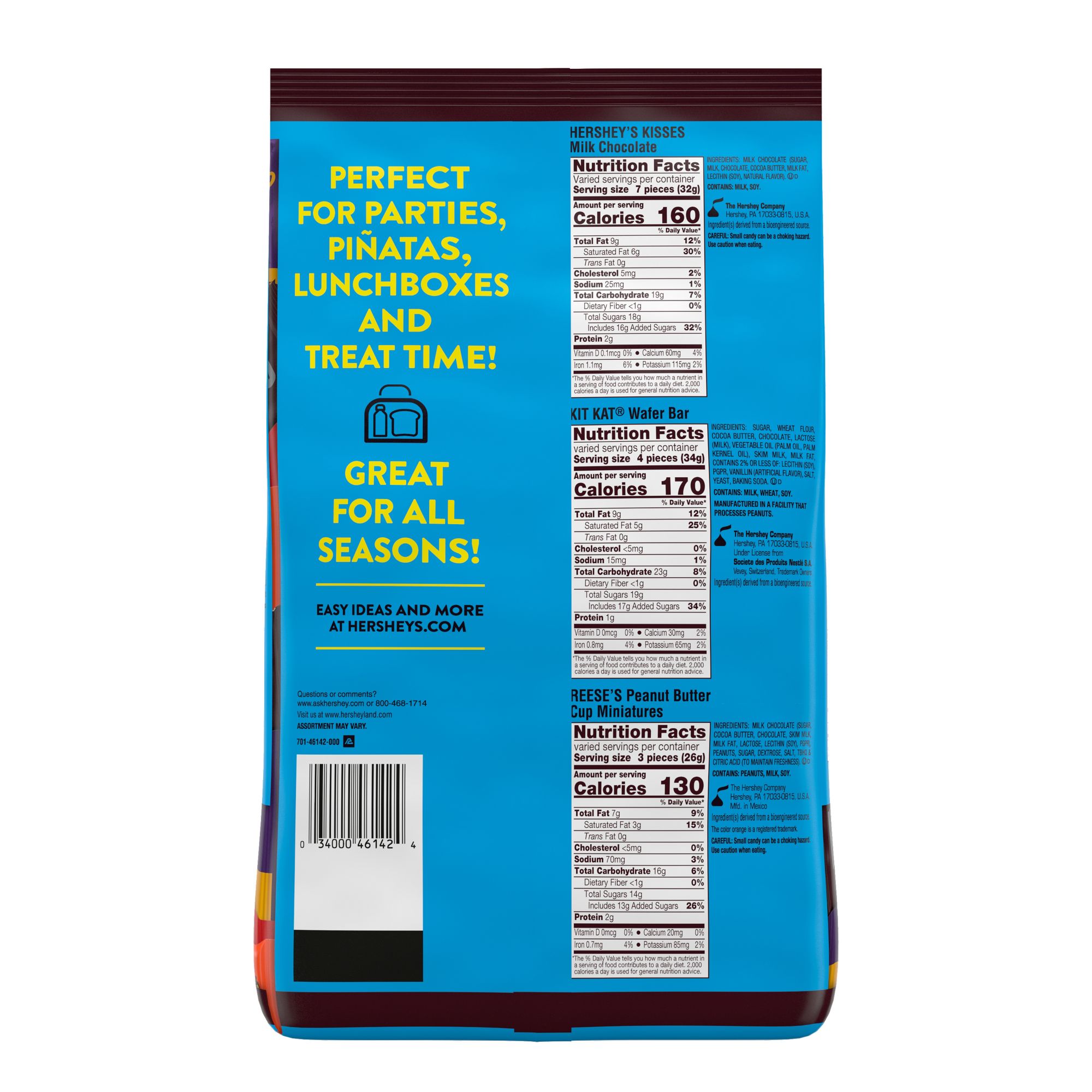 Enjoy a delicious milk chocolate treat anywhere and anytime with this value pack of Hershey assorted candy, perfect for parties, holidays and fundraisers. Offering five miniature crowd-pleasing favorites, this kosher candy assortment is perfect for sharing with family, friends, teammates or co-workers. Take this assorted candy bag into the office break room, pour some individually wrapped candies into your jar at home or take a bag to your next sports game to celebrate the win. This assortment includes Kit Kat milk chocolate wafer candy bars, Reese's milk chocolate peanut butter cups candy, Hershey's milk chocolate candy bars, Hershey's Kisses milk chocolate candy and Cadbury Caramello milk chocolate caramel candy bars. You really can't go wrong when you have miniature kosher certified candy bars on hand. They're perfect for parties, lunch boxes, desserts, picnics, tailgate parties and more. Add this bag of miniature assorted milk chocolate candies to your holiday festivities, too. Stuff Christmas stockings, fill Easter baskets, create Valentine's Day gift bags and fill Halloween party candy bowls with these delicious milk chocolate treats that suit every occasion and every taste. Make the major holidays and all of the ordinary moments in between a little sweeter with this classic assortment.