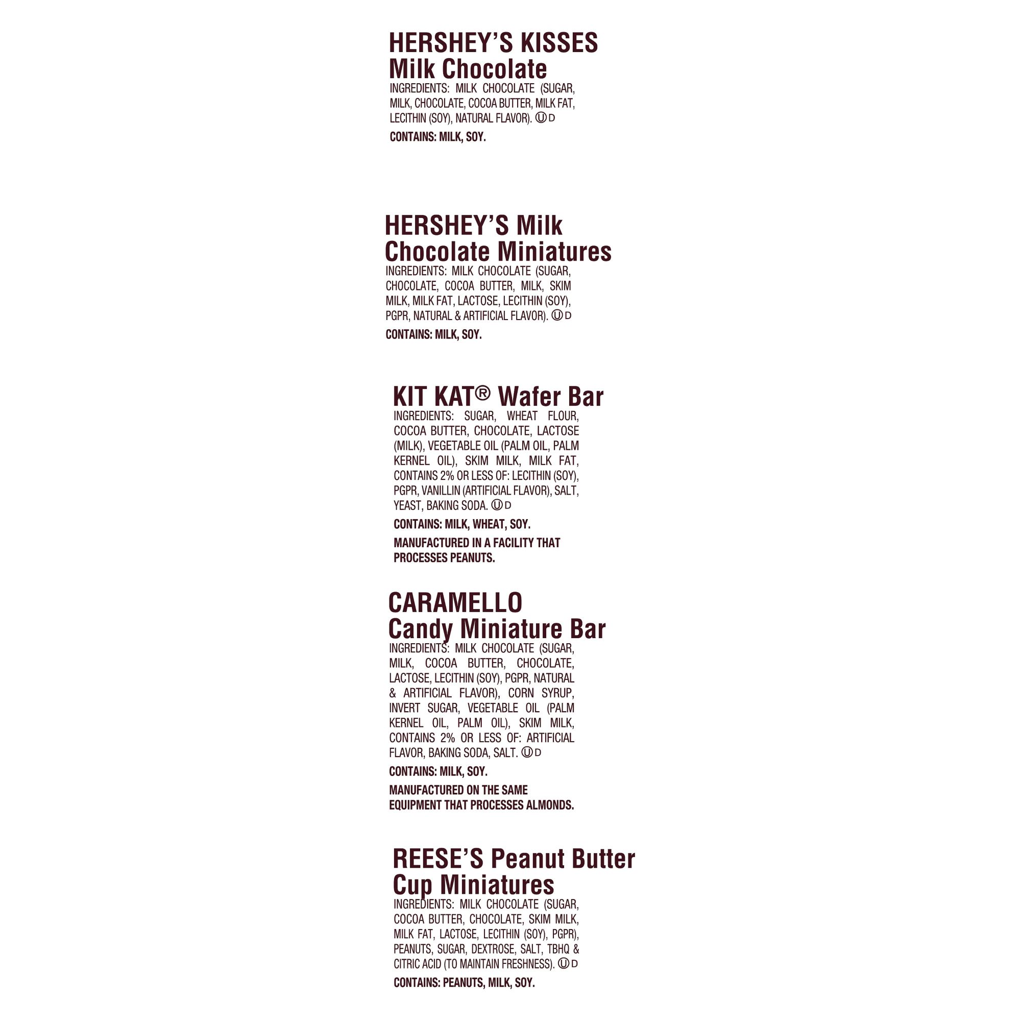 Ingredients: Hershey's Kisses Milk Chocolate: Milk Chocolate (Sugar, Milk, Chocolate, Cooca Butter, Milk Fat, Lecithin (Soy), Natural Flavor). Hershey's Milk Chocolate Miniatures: Milk Chocolate (Sugar, Chocolate, Cooca Butter, Milk, Skim Milk, Milk Fat, Lactose, Lecithin (Soy), Pgpr, Natural & Artificial Flavor). Reese's Peanut Butter Cup Miniatures: Milk Chocolate (Sugar, Chocolate, Cooca Butter, Skim Milk, Milk Fat, Lactose, Lecithin (Soy), Pgpr), Peanuts, Sugar, Dextrose, Salt, Tbhq & Citric Acid (To Maintain Freshness). Kit Kat Wafer Bar: Sugar, Wheat Flour, Cocoa Butter, Chocolate, Latcose (Milk), Vegetable Oil (Palm Oil, Palm Kernel Oil), Skim Milk, Milk Fat, Contains 2% Or Less Of: Lecithin (Soy), Pgpr, Vanillin (Artificial Flavor), Salt, Yeast, Baking Soda. Caramello Candy Miniature Bar: Milk Chocolate (Sugar, Milk, Chocolate, Cooca Butter, Milk, Lactose, Lecithin (Soy), Pgpr, Natural & Artificial Flavor), Corn Syrup, Invert Sugar, Vegetable Oil (Palm Kernel Oil, Palm Oil), Skim Milk, Contains 2% Or Less Of: Artificial Flavor, Baking Soda, Salt.