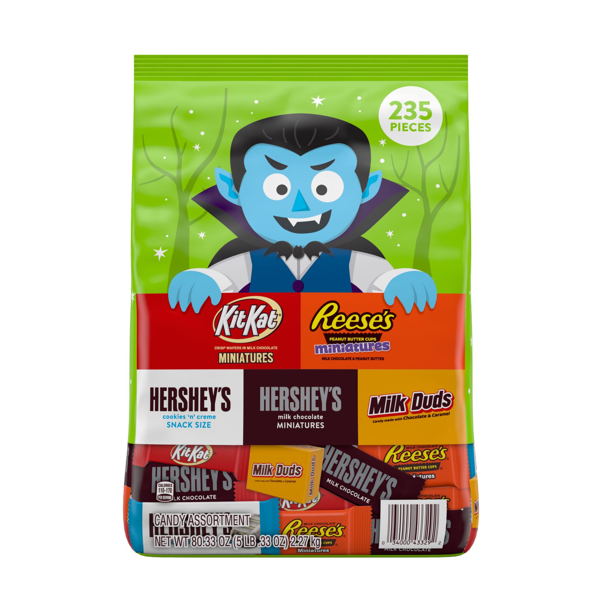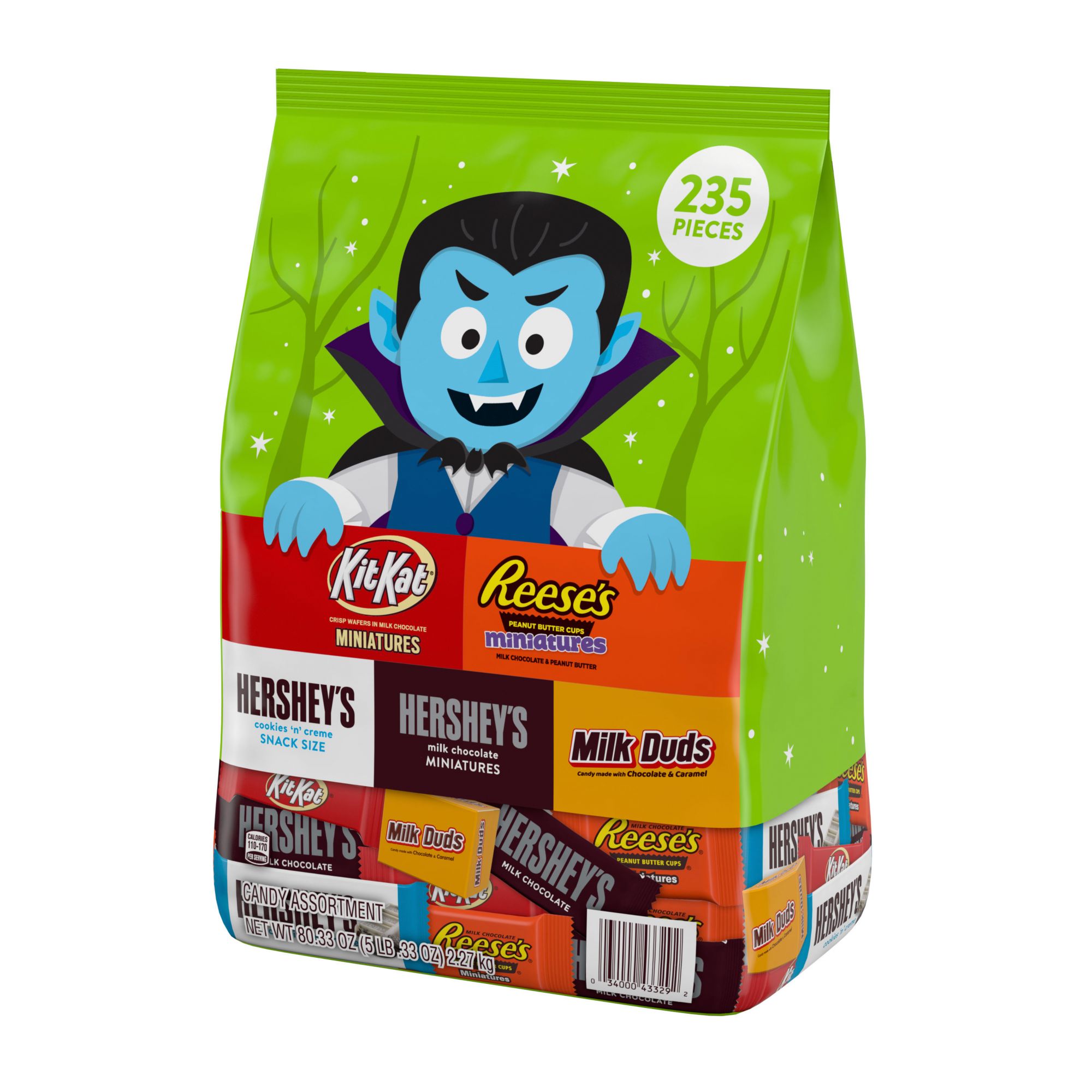 Get ready for your Halloween parties and neighborhood trick-or-treaters with this delicious candy assortment of Hershey candy that includes Reese's Miniatures milk chocolate peanut butter cups, Kit Kat Miniatures milk chocolate wafer bars, Hershey's Cookies 'N' Creme snack-size candy bars, Hershey's Miniatures milk chocolate candy bars and Milk Duds chocolate caramel candy. This bag has all the classics to let every monster choose a favorite. Send each ghost, goblin and ghoul home with a smile on their face this Halloween if you're looking to avoid the trick with just the right treat. Your party favors, Halloween decorations and candy bowls will be a crowd favorite with these snack-size and miniature candies, but don't forget to hold onto a few for yourself! Try a Kit Kat wafer bar or Reese's peanut butter cup candy straight out of the freezer for a fun twist on Halloween chills. If you're feeling crafty this year, bring your Hershey chocolate candy assortment into the kitchen. Top off your baked goods and edible Halloween crafts to forget all about the season's fright.