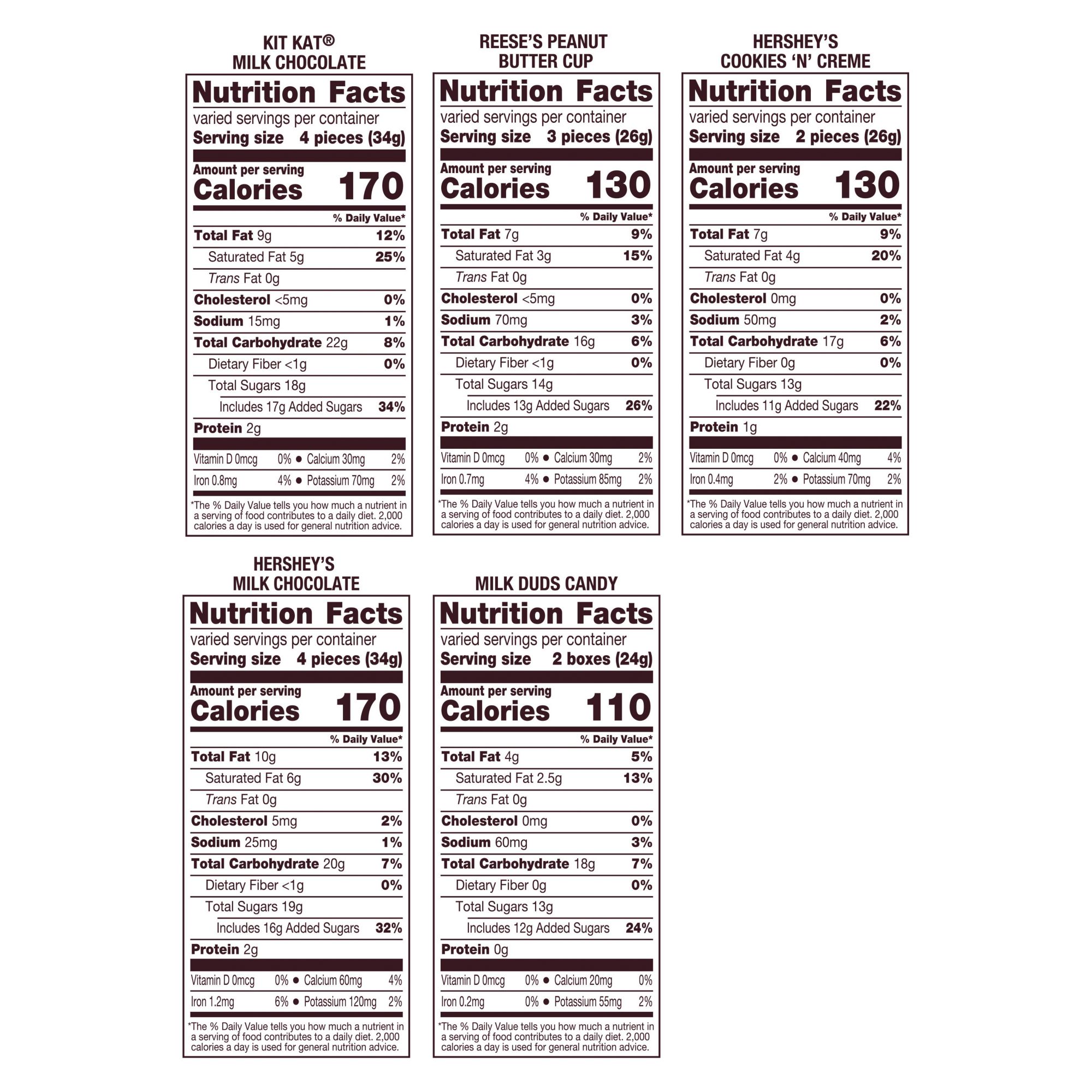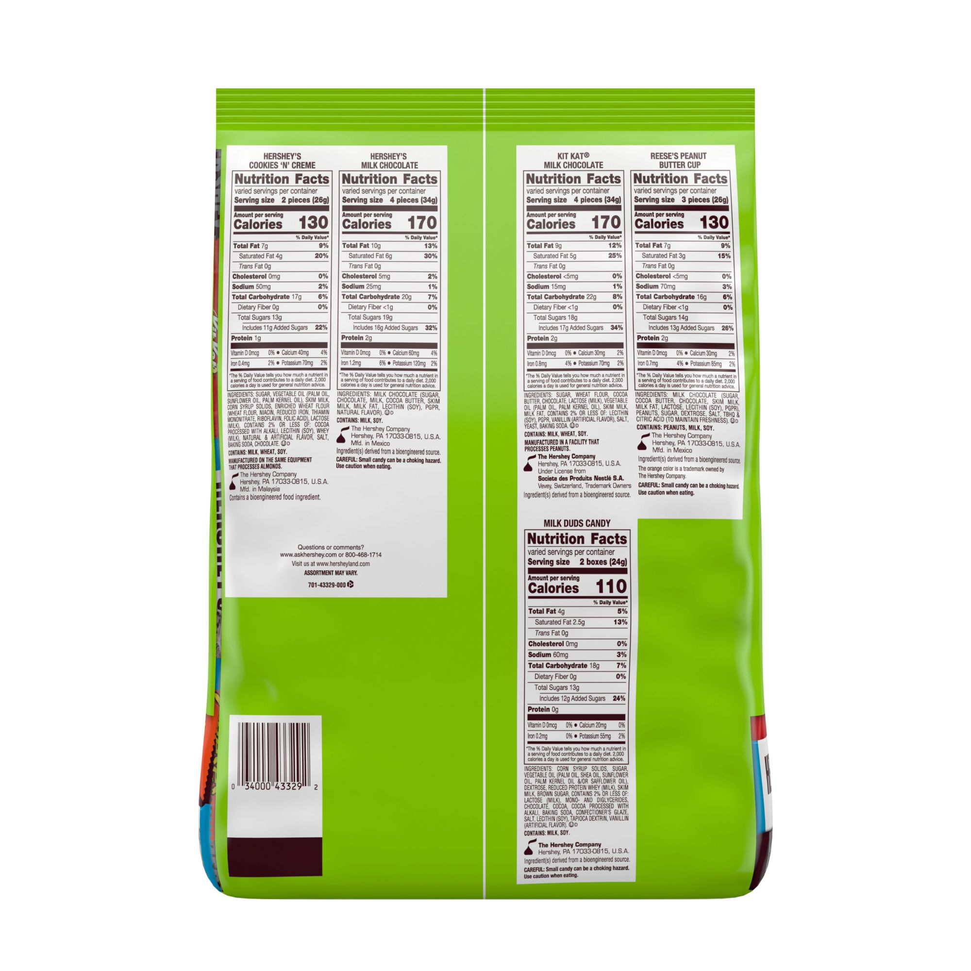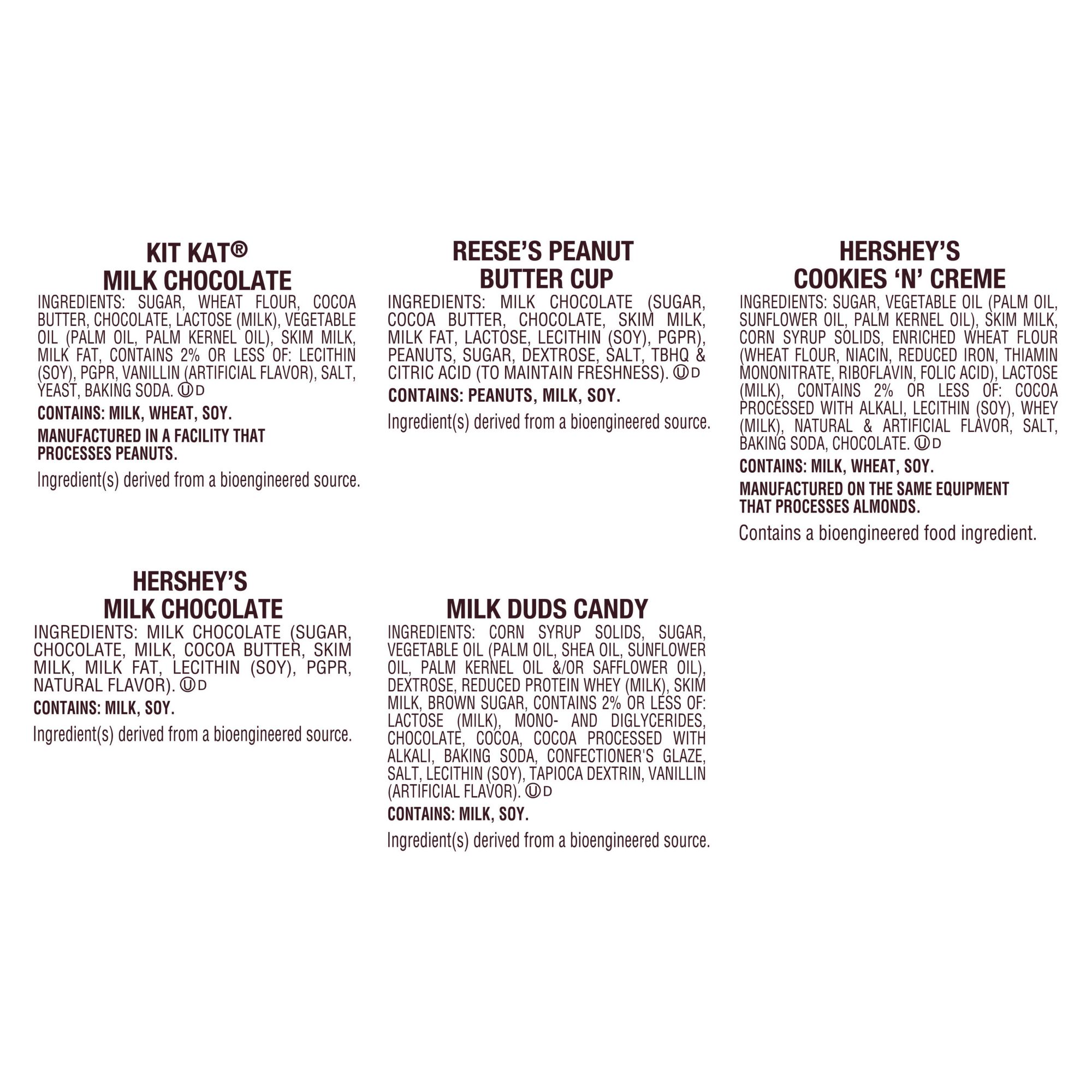 Includes Reese's Miniatures milk chocolate peanut butter cups, Kit Kat Miniatures milk chocolate wafer bars, Hershey's Cookies 'N' Creme snack-size candy bars, Hershey's Miniatures milk chocolate candy bars and Milk Duds chocolate caramel candy