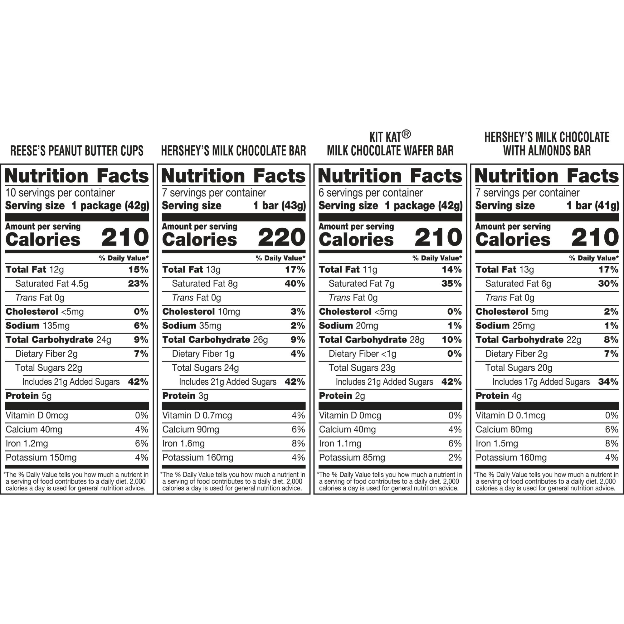 Hershey's Milk Chocolate Bars, Hershey's Milk Chocolate With Whole Almonds Bars, Reese's Milk Chocolate Peanut Butter Cups, and Kit Kat Milk Chocolate Wafer Candy Bars
