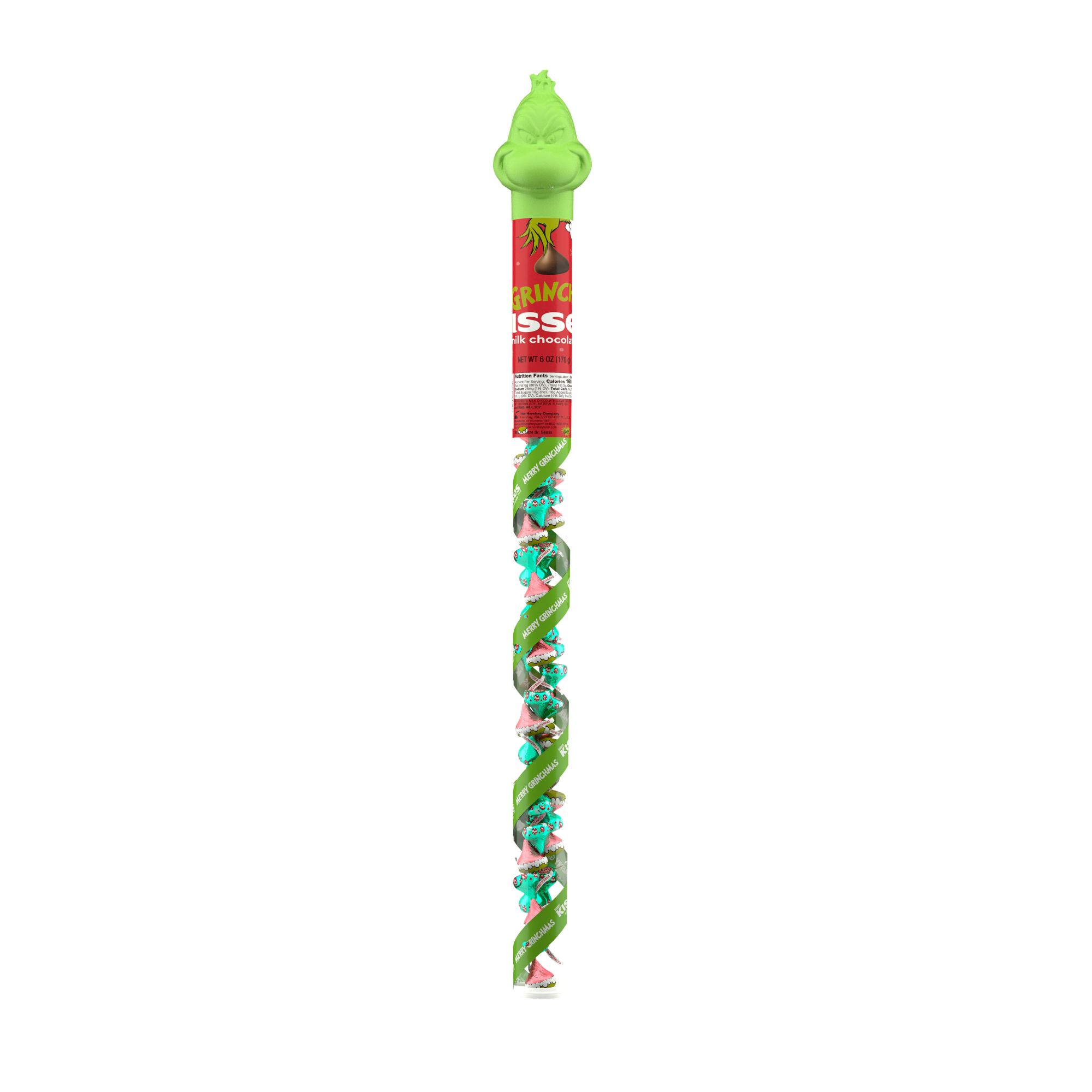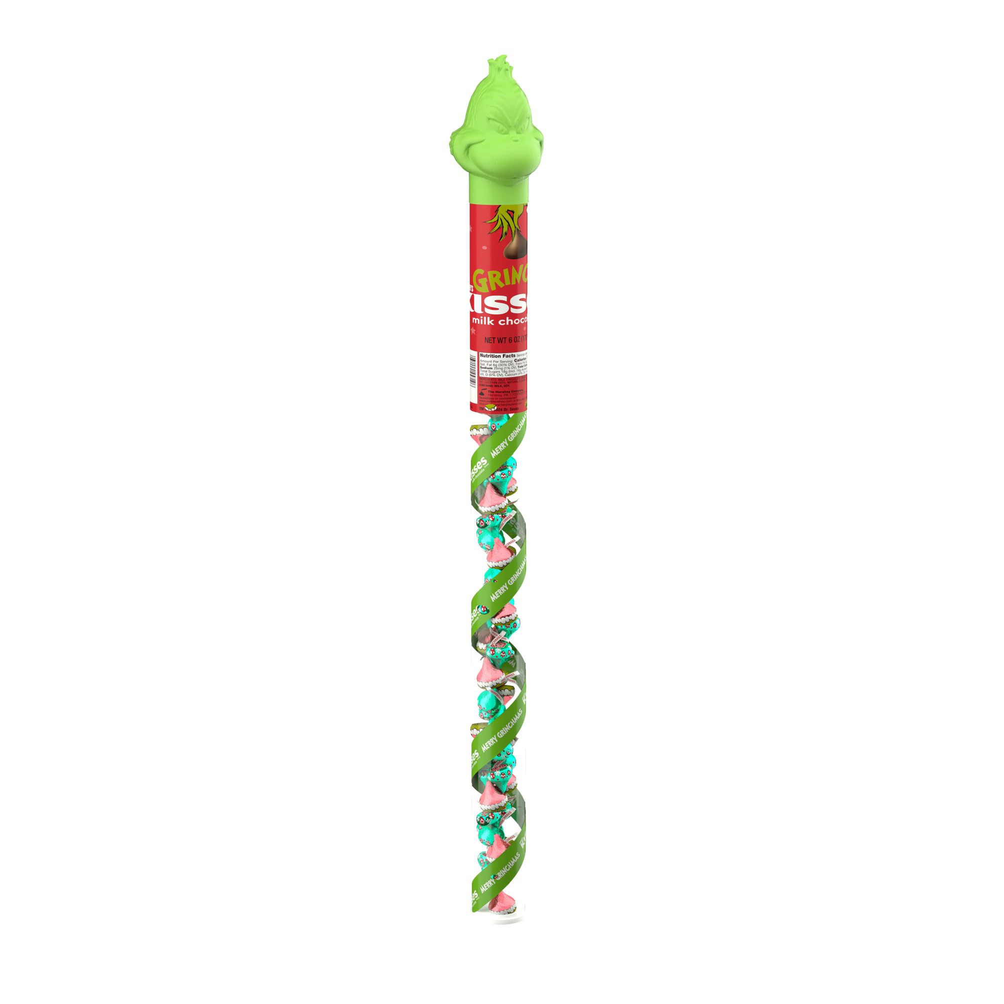 Contains one (1) 6-ounce plastic cane of Hershey's Kisses Grinch Milk Chocolate Candy
