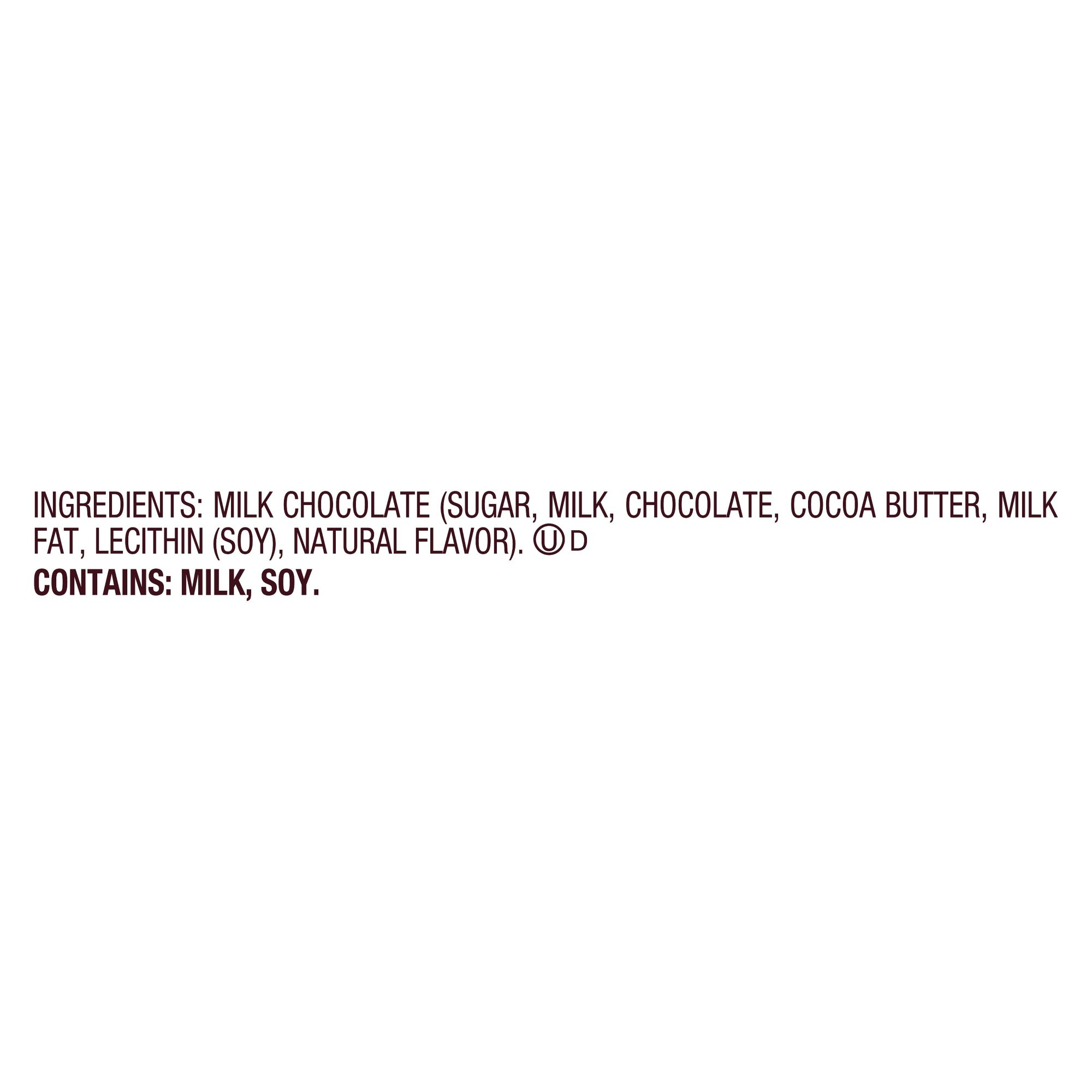 Ingredients: Milk Chocolate (Sugar, Milk, Chocolate, Cocoa Butter, Milk Fat, Lecithin (Soy), Natural Flavor).