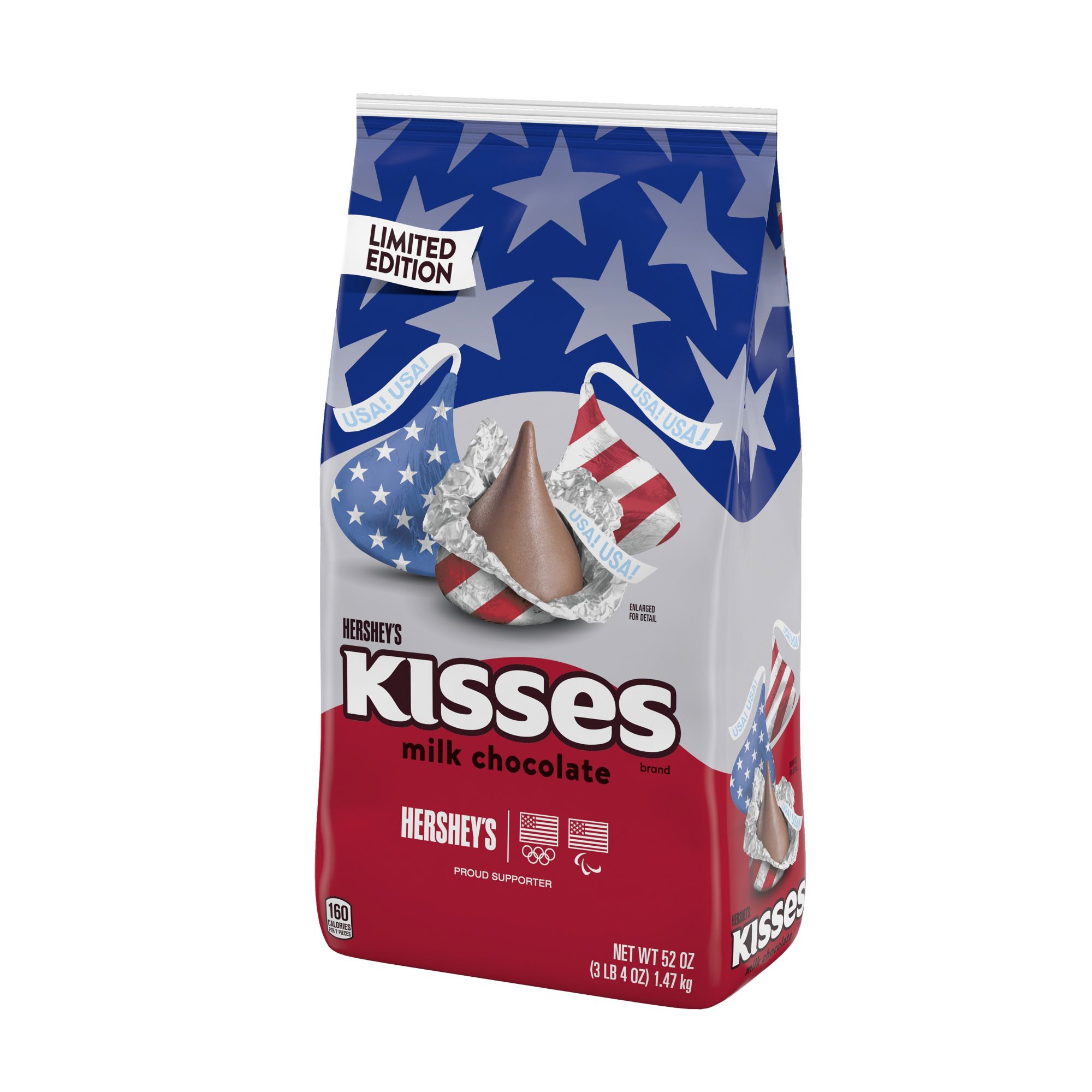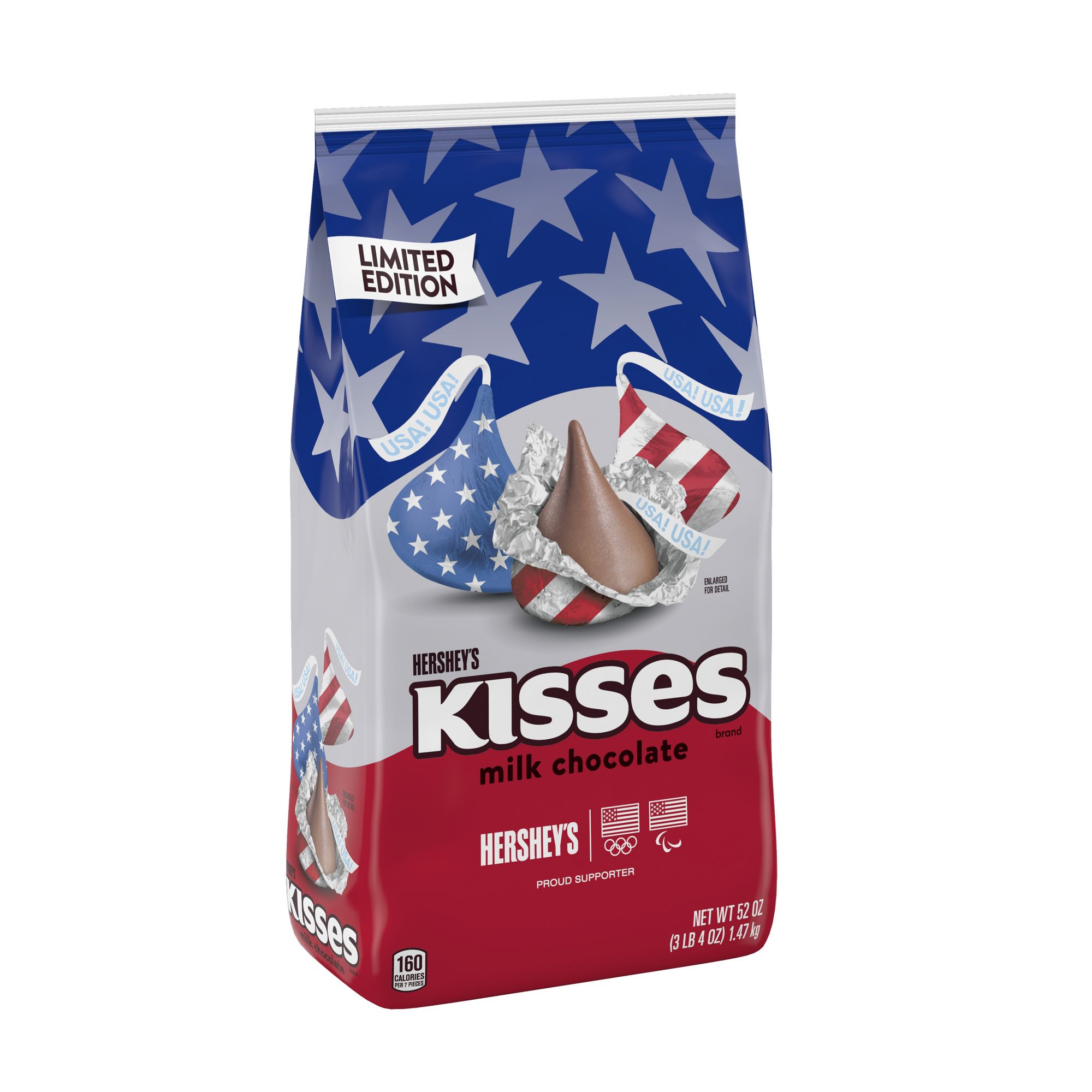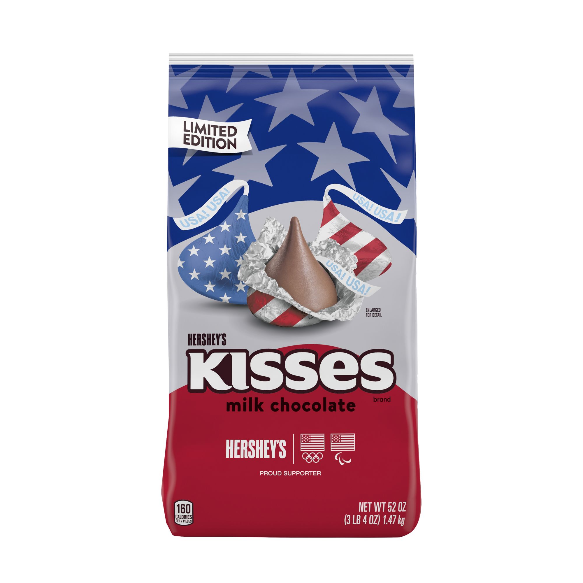 Contains one 52-ounce party pack of Hershey's Kisses Milk Chocolate Candy with Patriotic Foils