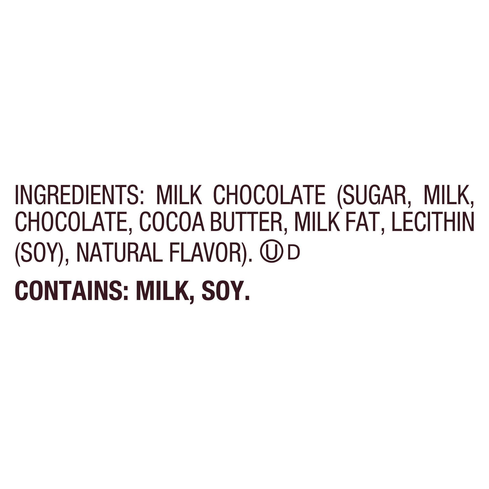 Ingredients Milk Chocolate (Sugar, Milk, Chocolate, Cocoa Butter, Milk Fat, Lecithin (Soy), Natural Flavor).