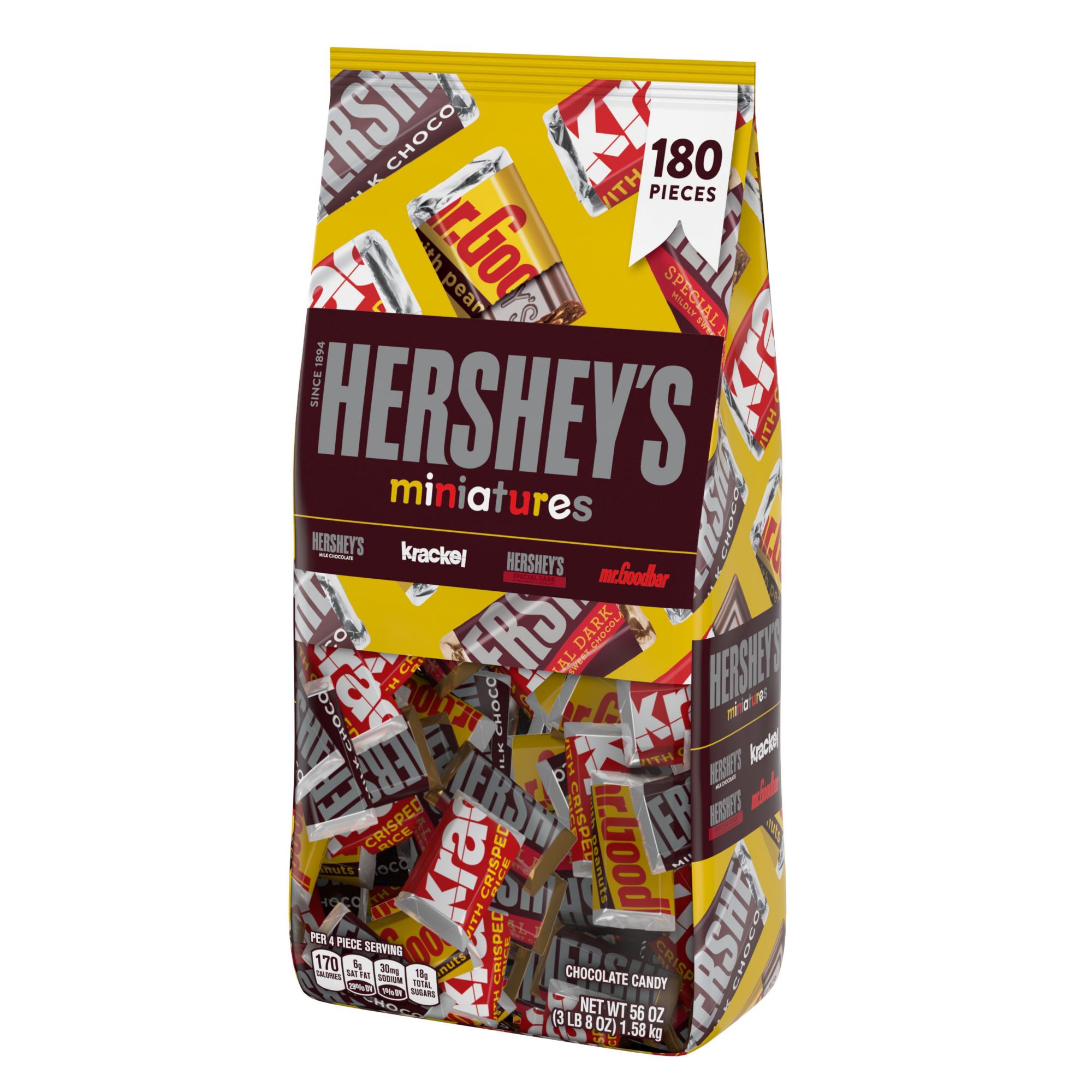 Includes variety pack of miniature chocolate candy bars, 180 pk./56 oz.