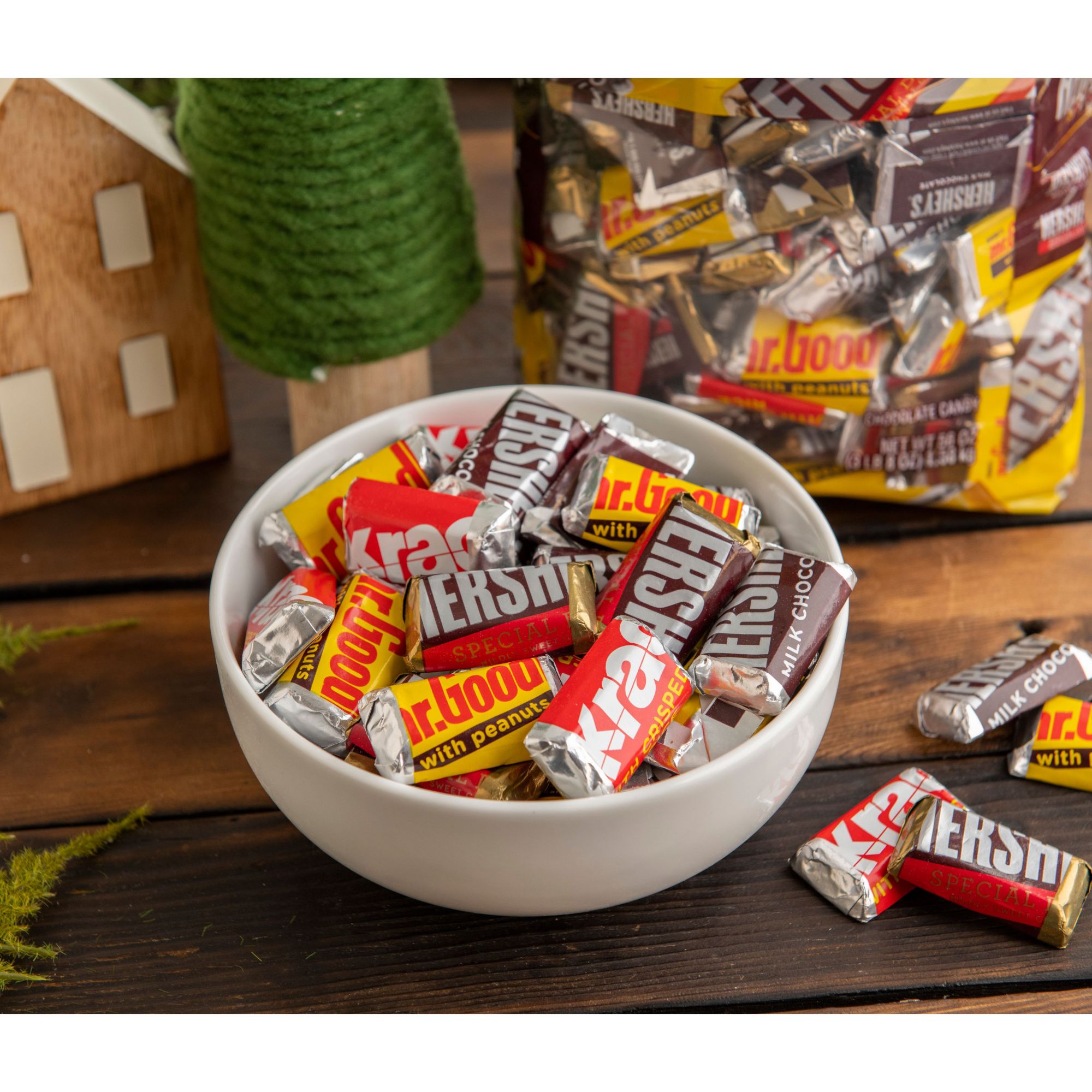 There's something for everyone in this Hershey's Miniatures bulk assortment bag. Find miniature versions of all your favorite Hershey's chocolate bars in one sweet bag, including Hershey's milk chocolate bars, Hershey's Special Dark mildly sweet chocolate bars, Hershey's Krackel chocolate candy with crisped rice and Hershey's Mr. Goodbar chocolate candy with peanuts. Enjoy delicious candy classics individually wrapped for lasting freshness and convenience all year long. Perfect for lunch boxes, movie nights, game nights, snack breaks, sharing moments and candy dishes at home and in the office, these milk and dark chocolate miniatures will keep your snacking fun and simple. Give a variety of chocolates to your favorite people on Easter, Valentine's Day, Halloween, Christmas or an ordinary day when you're in a generous mood. Want to take these treats a step further? Place a Hershey's Miniatures chocolate bar on top of your best baked goods to please the crowd with your culinary genius!