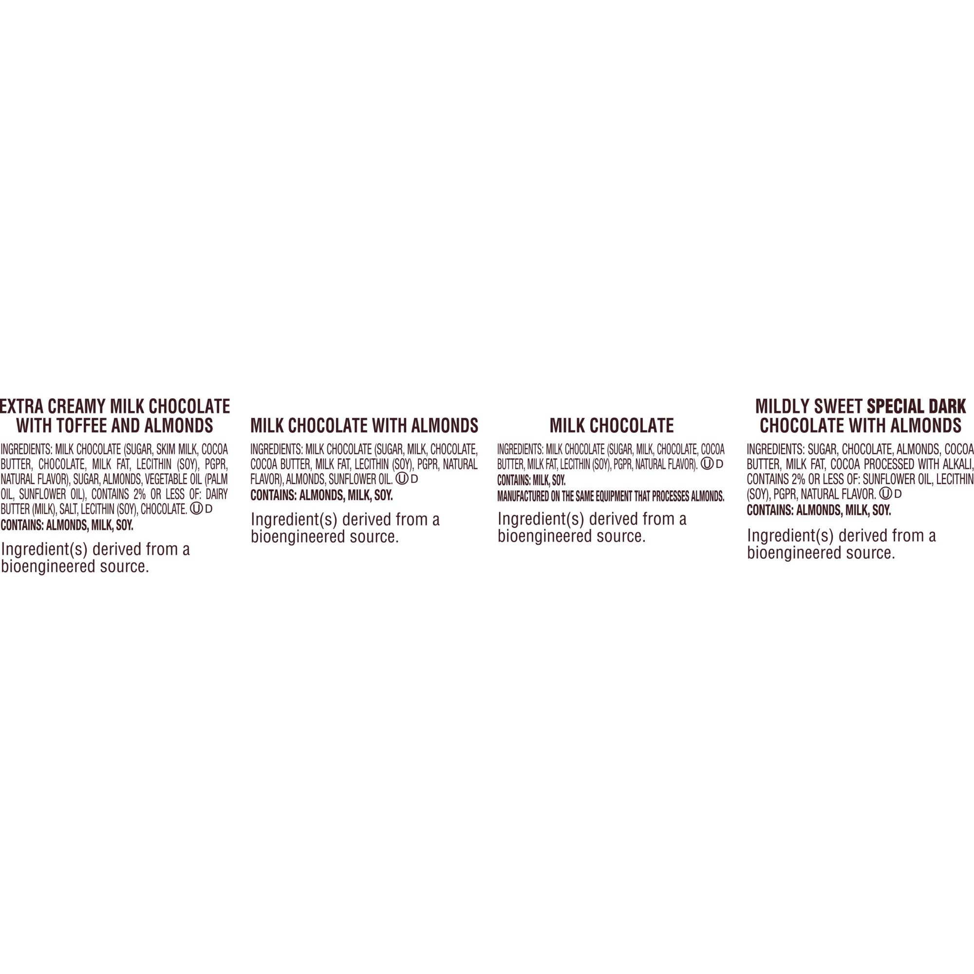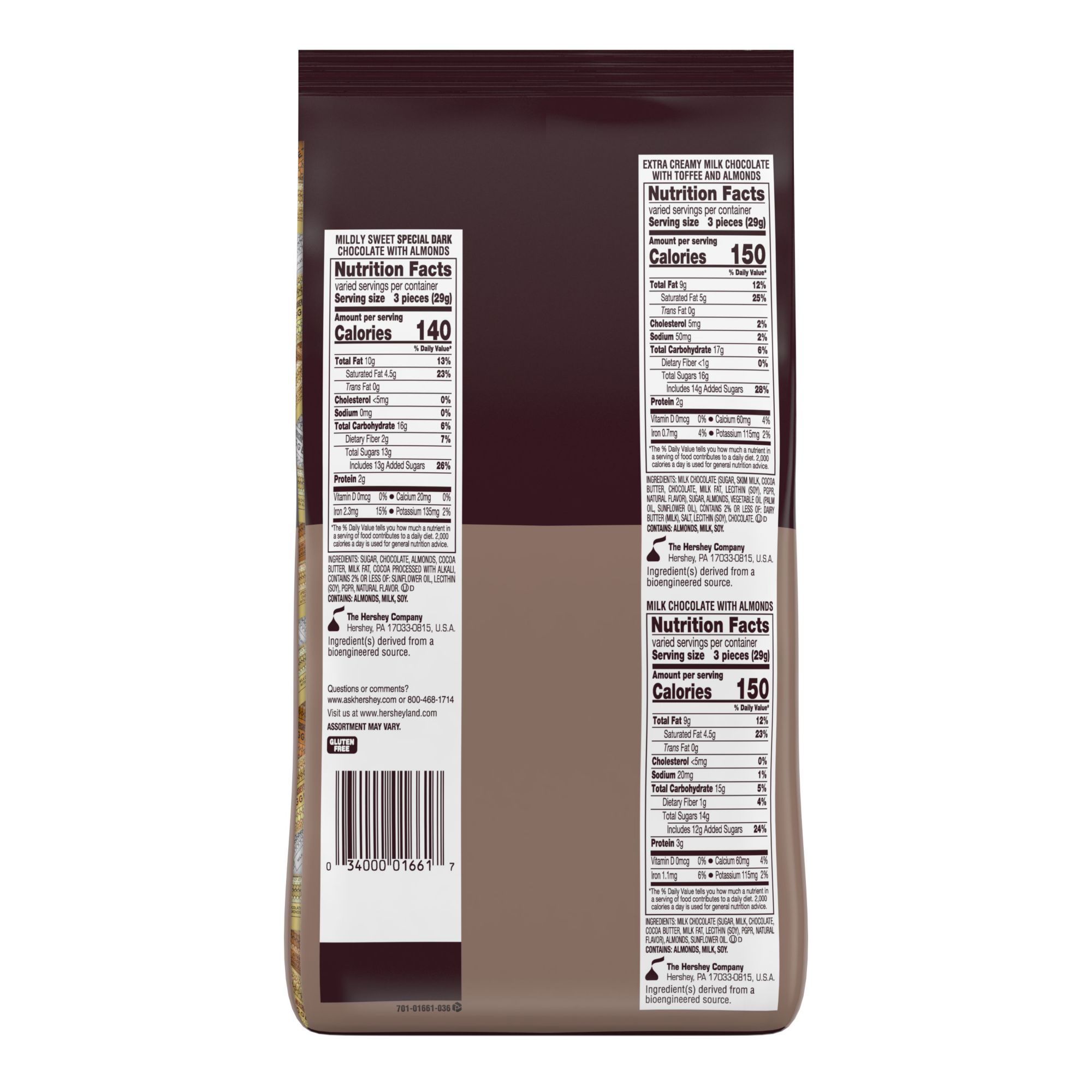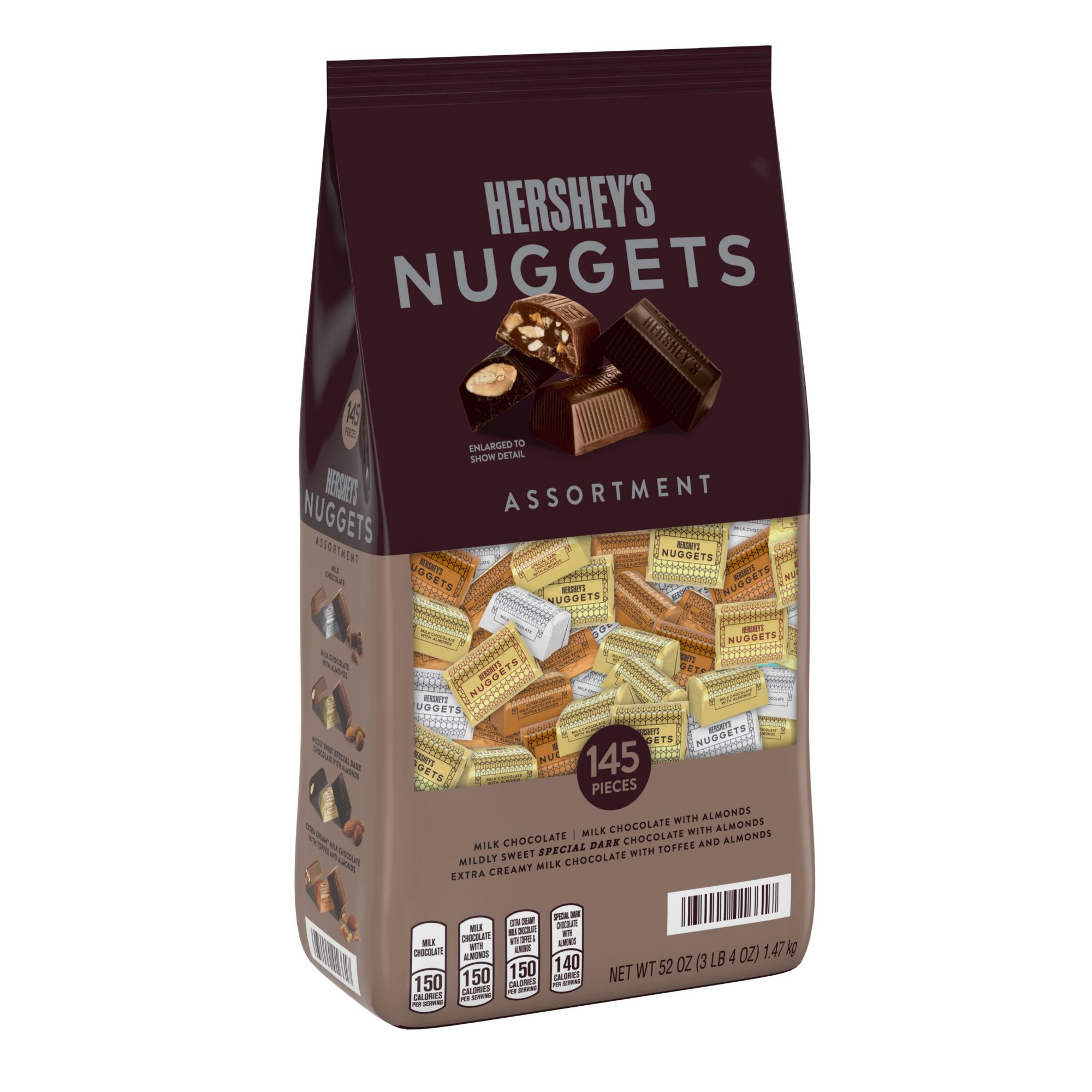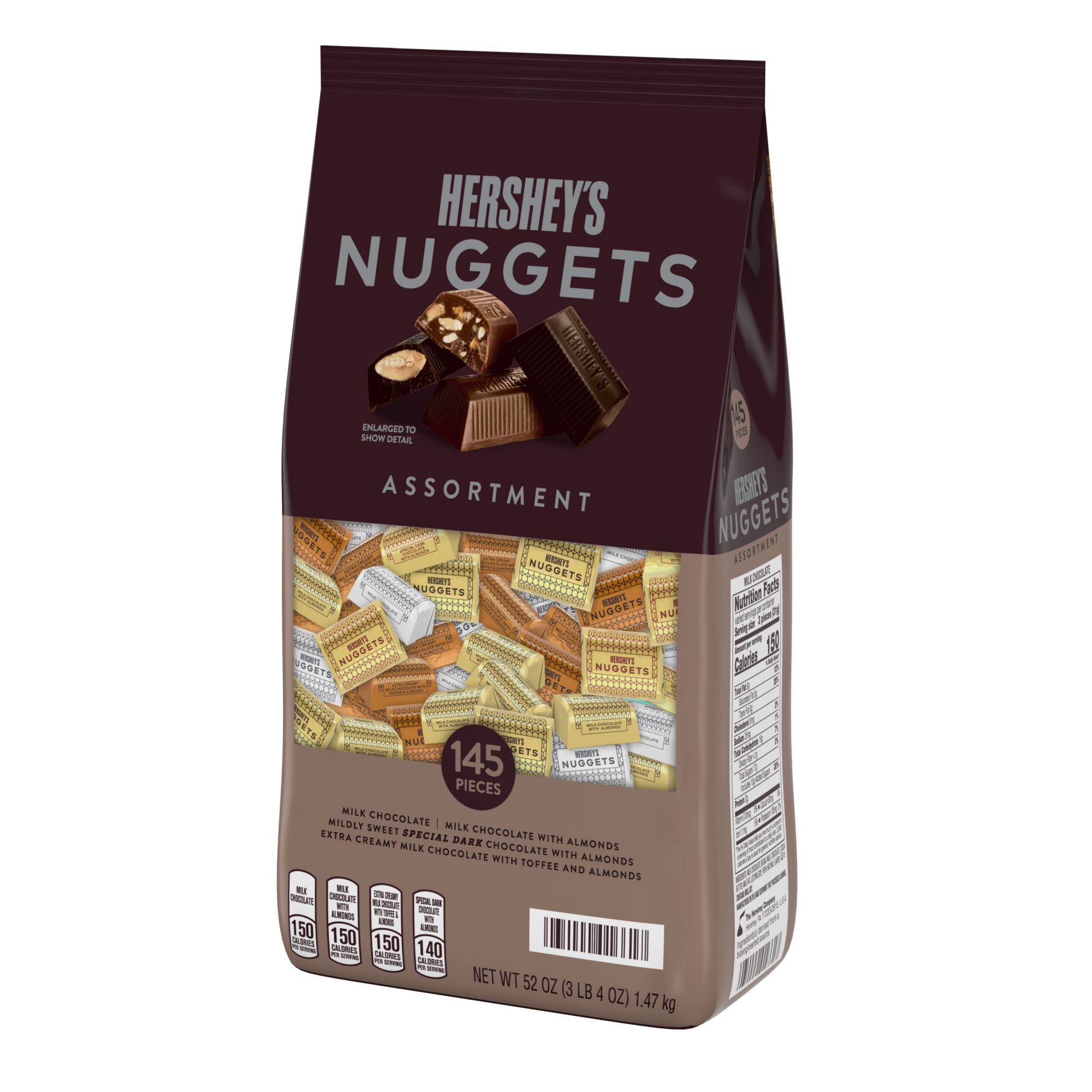Includes Hershey's Nuggets Special Dark mildly sweet chocolate with almonds candy bars, milk chocolate candy bars, milk chocolate with almonds candy bars and extra creamy milk chocolate with almonds and toffee candy bars