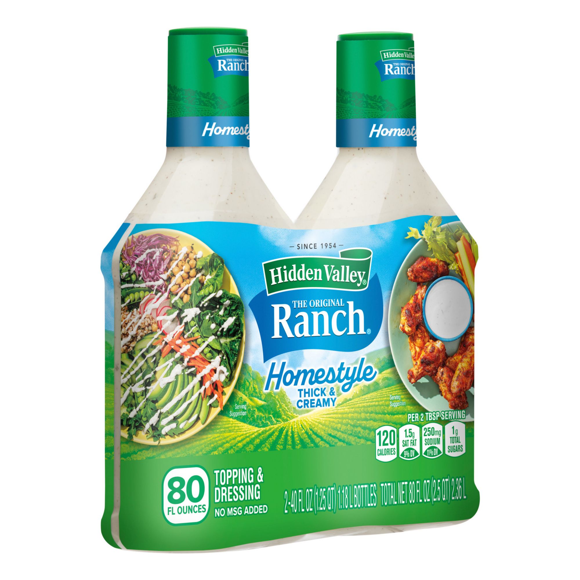 Hidden Valley Original Ranch Homestyle Dressing has the same deliciousness of Hidden Valley Original Ranch Dressing with a rich texture perfect for dipping your favorite veggies, wings, chips and fries with this no MSG formula. Thick and creamy, packed with flavor, this is the "go to" salad dressing or quick veggie dip and is excellent on hamburgers and chicken, and marinates any kind of meat perfectly. Use it as a topper for sandwiches, burgers, pizza and wraps or as a tasty condiment for dipping fries, chips, pretzels and chicken strips. This dressing is gluten-free and adds a great finishing touch to potato and pasta salad. For an extra kick, add chili powder to the dressing. Make everything taste better with Hidden Valley.