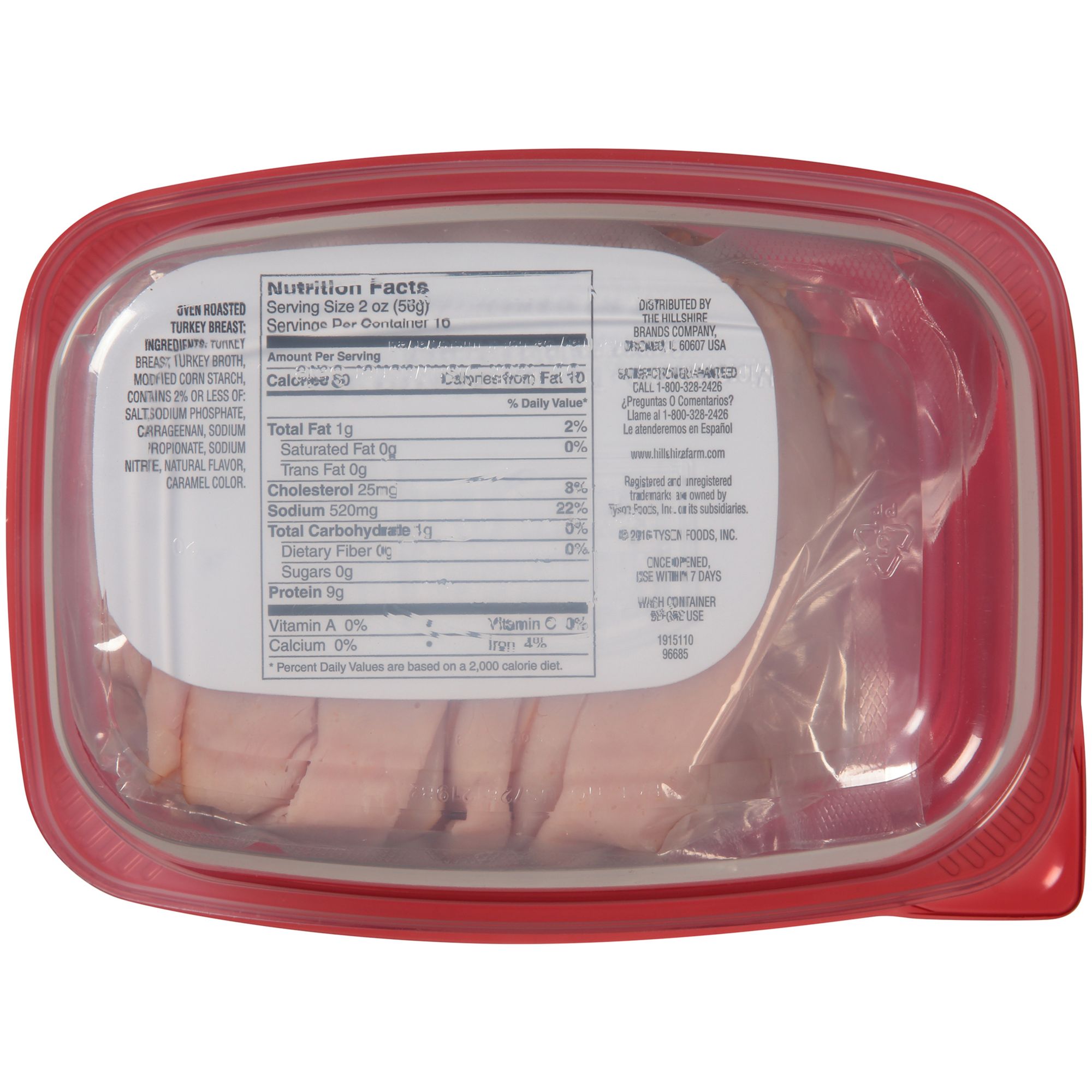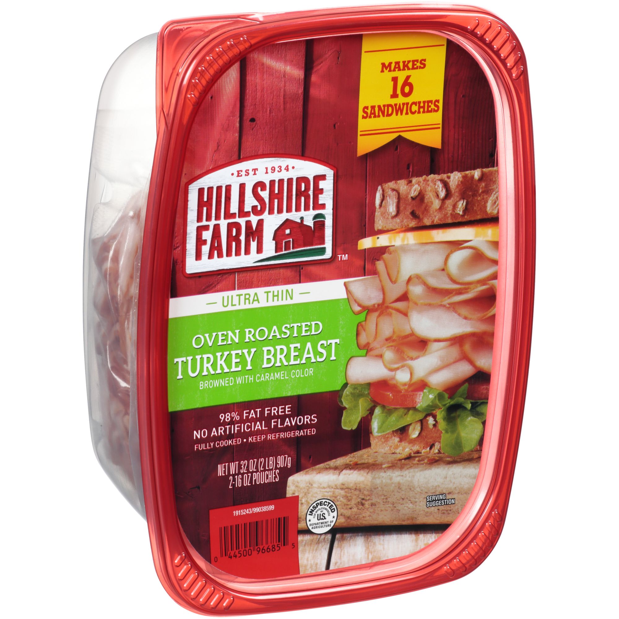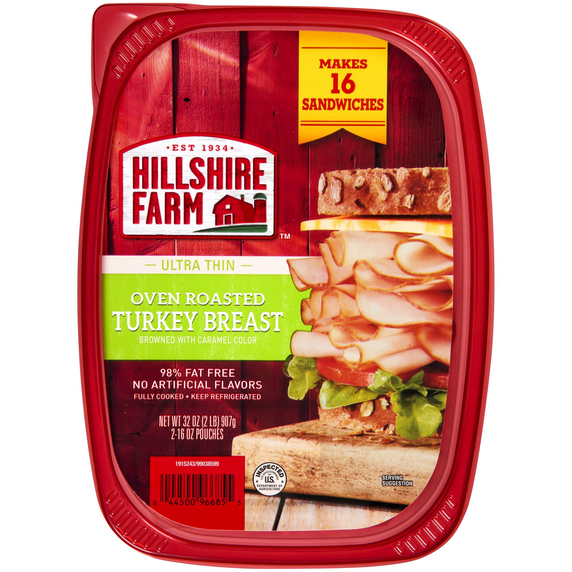 Enjoy premium sliced turkey at home with Hillshire Farm Ultra Thin Oven Roasted Turkey Breast Sliced Lunchmeat. Made with slow-cooked, oven roasted turkey and no artificial flavors, this oven roasted turkey breast is juicy, flavorful, and 98% fat-free. Fully cooked and ready-to-eat in one 32 oz. double-sealed package for absolute freshness, simply serve with mild cheddar cheese, sliced red onion and lettuce on a sesame seed bun for a delicious deli-style sandwich.