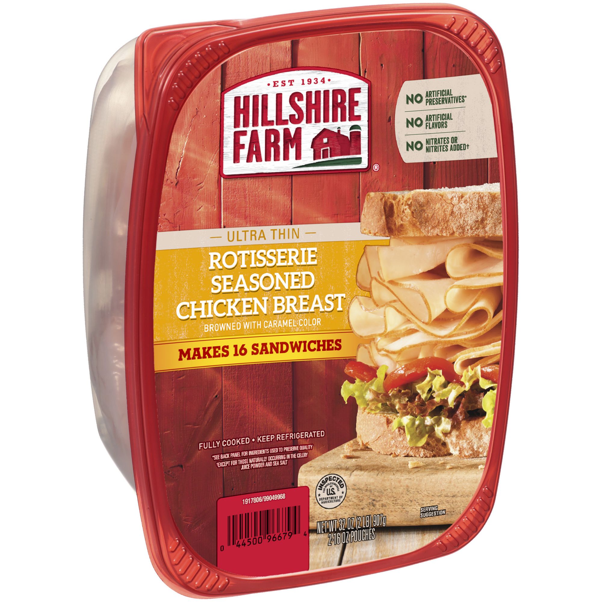 Enjoy premium sliced chicken at home with Hillshire Farm Rotisserie Chicken Lunchmeat. Made with slow cooked, oven roasted chicken and no artificial flavors, the Rotisserie Seasoned Chicken Breast is juicy, flavorful, and 98% fat-free. Fully cooked and ready-to-eat, simply serve with sliced red pepper and arugula on country white bread for a delicious deli-style sandwich. Includes one 32 oz. double-sealed package for absolute freshness. Hillshire Farm knows that quality is always the most important ingredient, and they believe that anything worth doing is worth doing right. From the custom blend of spices they curate for their perfectly seasoned smoked sausage, to the innovative way they package our lunchmeat for longer lasting fresh taste, it's this dedication to craftsmanship that's been with them from the start.