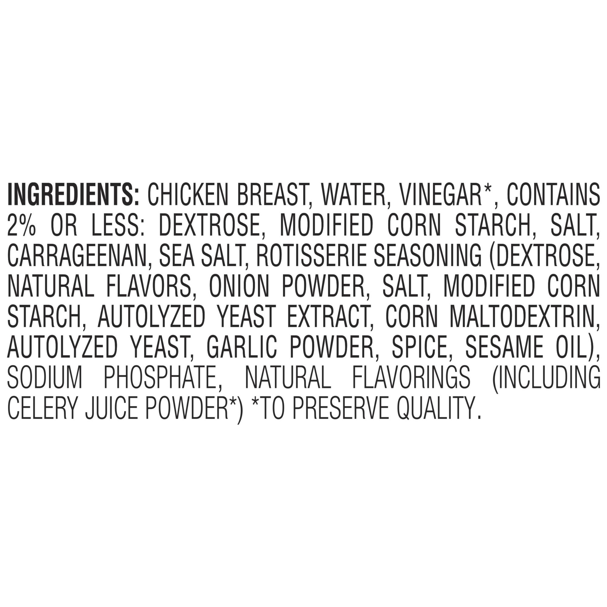 Ingredients: Chicken Breast, Water, Vinegar*, Contains 2% or Less: Dextrose, Modified Corn Starch, Salt, Carrageenan, Sea Salt, Rotisserie Seasoning (Dextrose, Natural Flavors, Onion Powder, Salt, Modified Corn Starch, Autolyzed Yeast Extract, Corn Maltodextrin, Autolyzed Yeast, Garlic Powder, Spice, Sesame Oil), Sodium Phosphate, Natural Flavorings (including Celery Juice*) *To Preserve Quality.