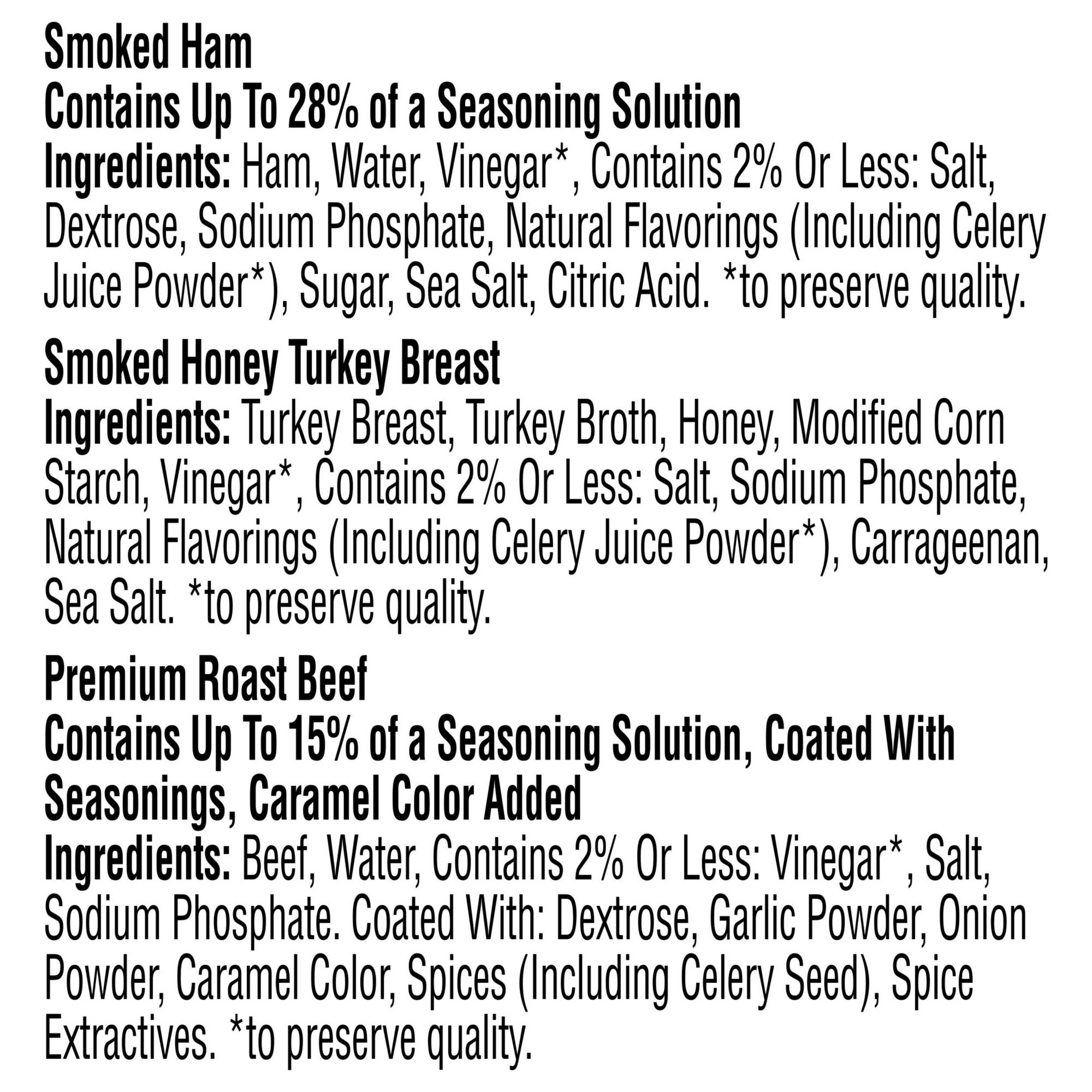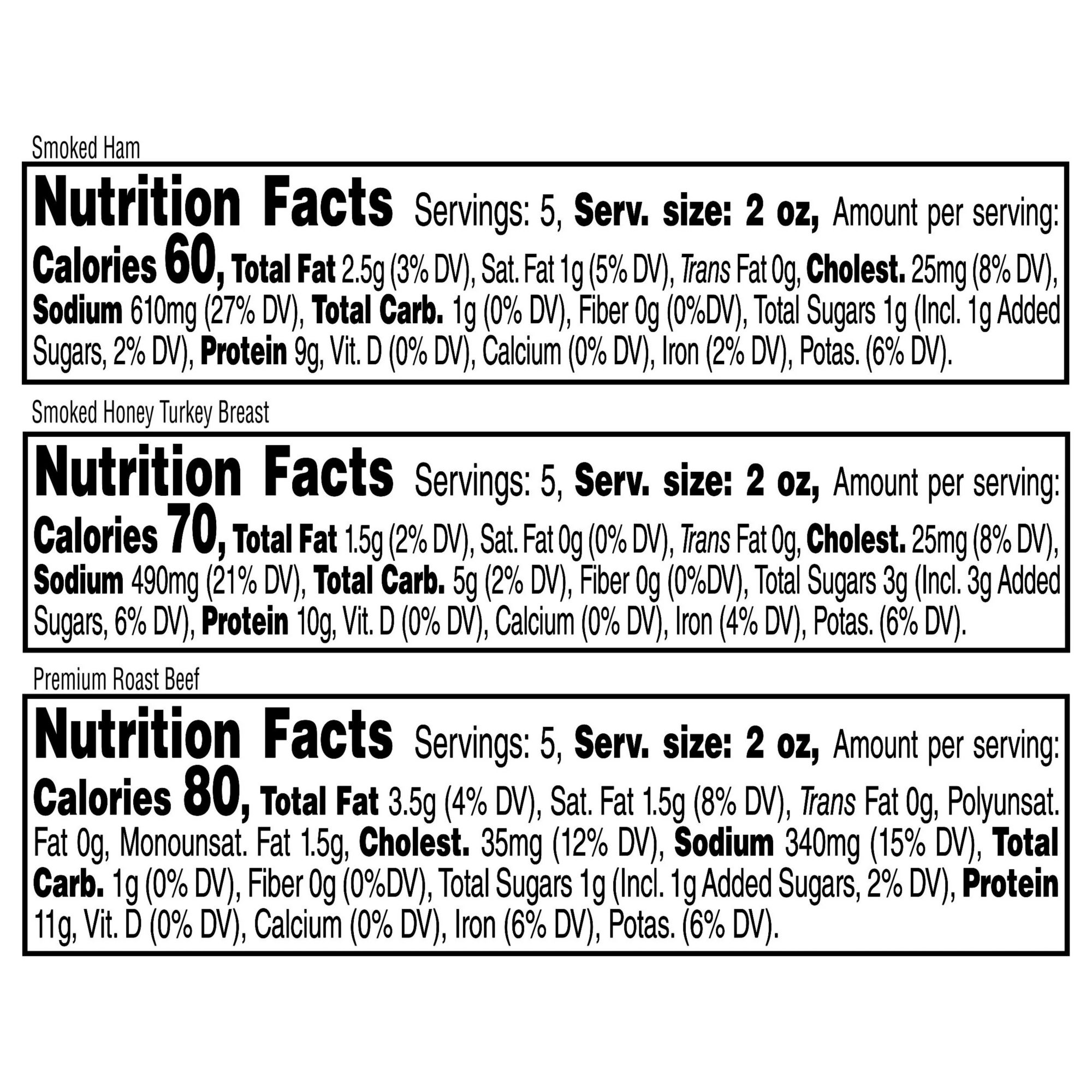 Thin sliced Premium Cooked Ham, Honey Smoked Turkey Breast and Angus Roast Beef Perfectly seasoned for savory, deli-quality flavor 96%-98% fat-free 9g-11g of protein per serving Makes about 15 sandwiches Perfect for sandwiches and wraps Includes three pack of 10-oz. thin sliced premium cooked ham, honey smoked turkey breast and Angus roast beef lunchmeat
