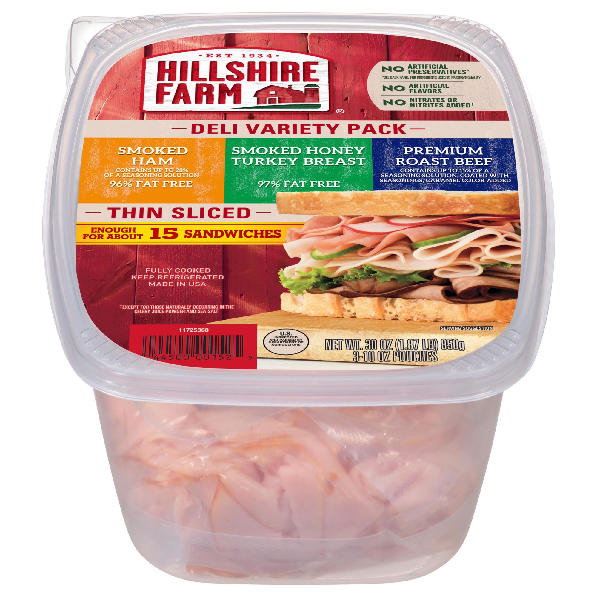 Enjoy premium sliced lunchmeat at home with the Hillshire Farm Thin Sliced Premium Lunchmeat Deli Variety Pack. Perfectly seasoned, these slices of Premium Cooked Ham, Honey Smoked Turkey Breast and Angus Roast Beef are juicy and flavorful, all 96% to 98% fat-free. Fully cooked and ready-to-eat, simply serve with mild cheddar cheese, sliced red onion and spinach on whole wheat bread for a delicious deli-style sandwich. Each variety pack includes three 10 oz. pouches of Hillshire Farm lunchmeat.