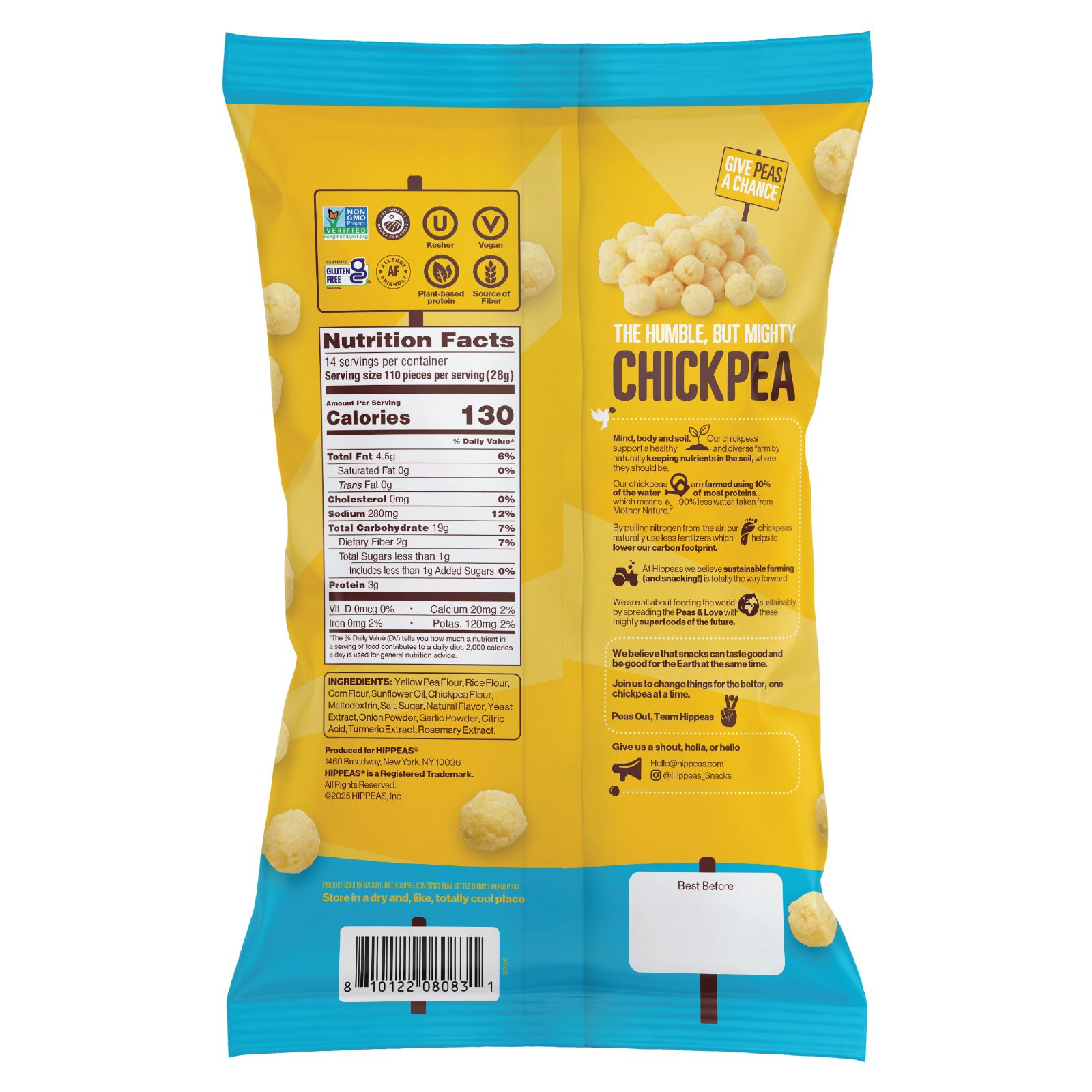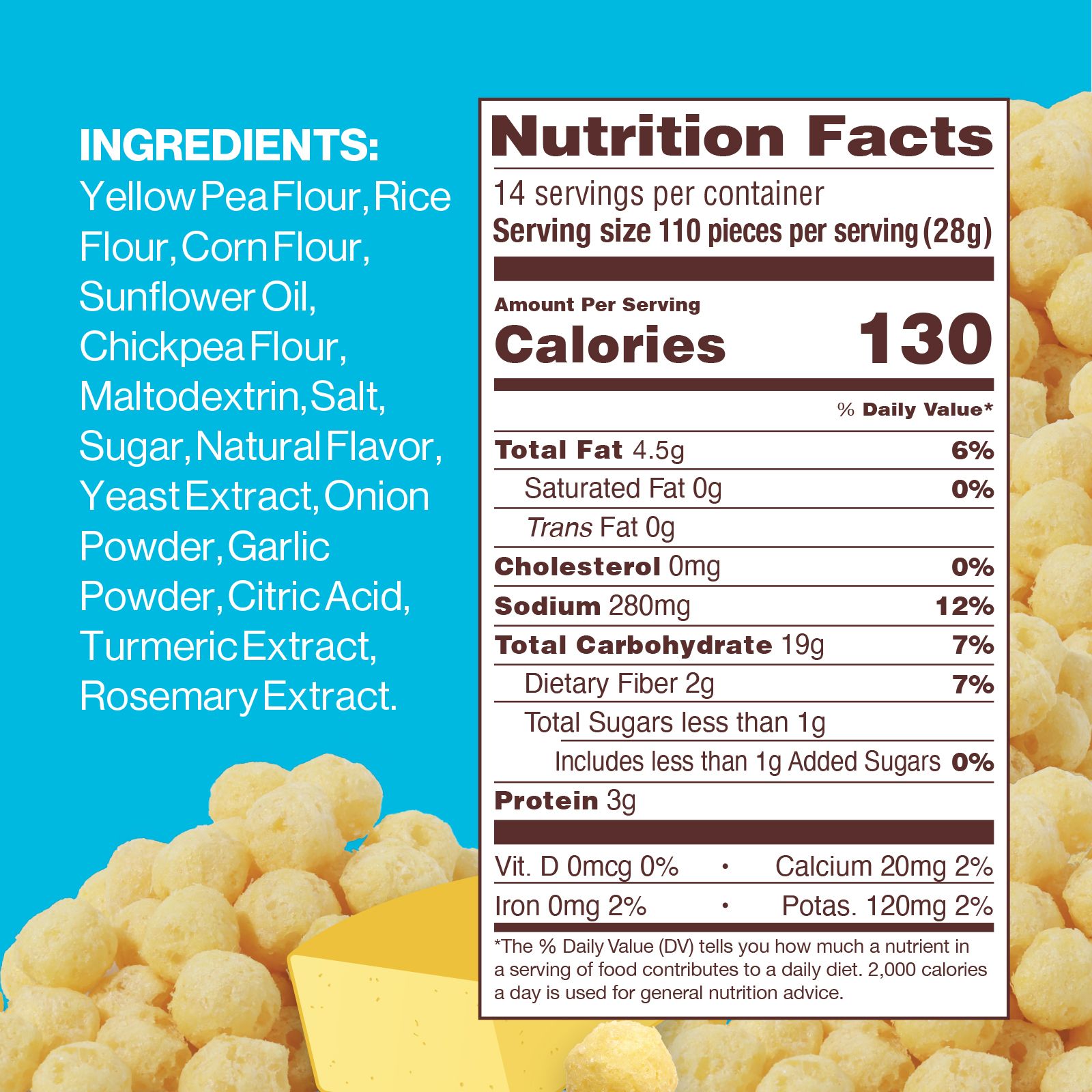 Ingredients: Yellow Pea Flour, Rice Flour, Corn Flour, Sunflower Oil, Chickpea Flour, Maltodextrin, Salt, Sugar, Natural Flavor, Yeast Extract, Onion Powder, Garlic Powder, Citric Acid, Turmeric Extract, Rosemary Extract.