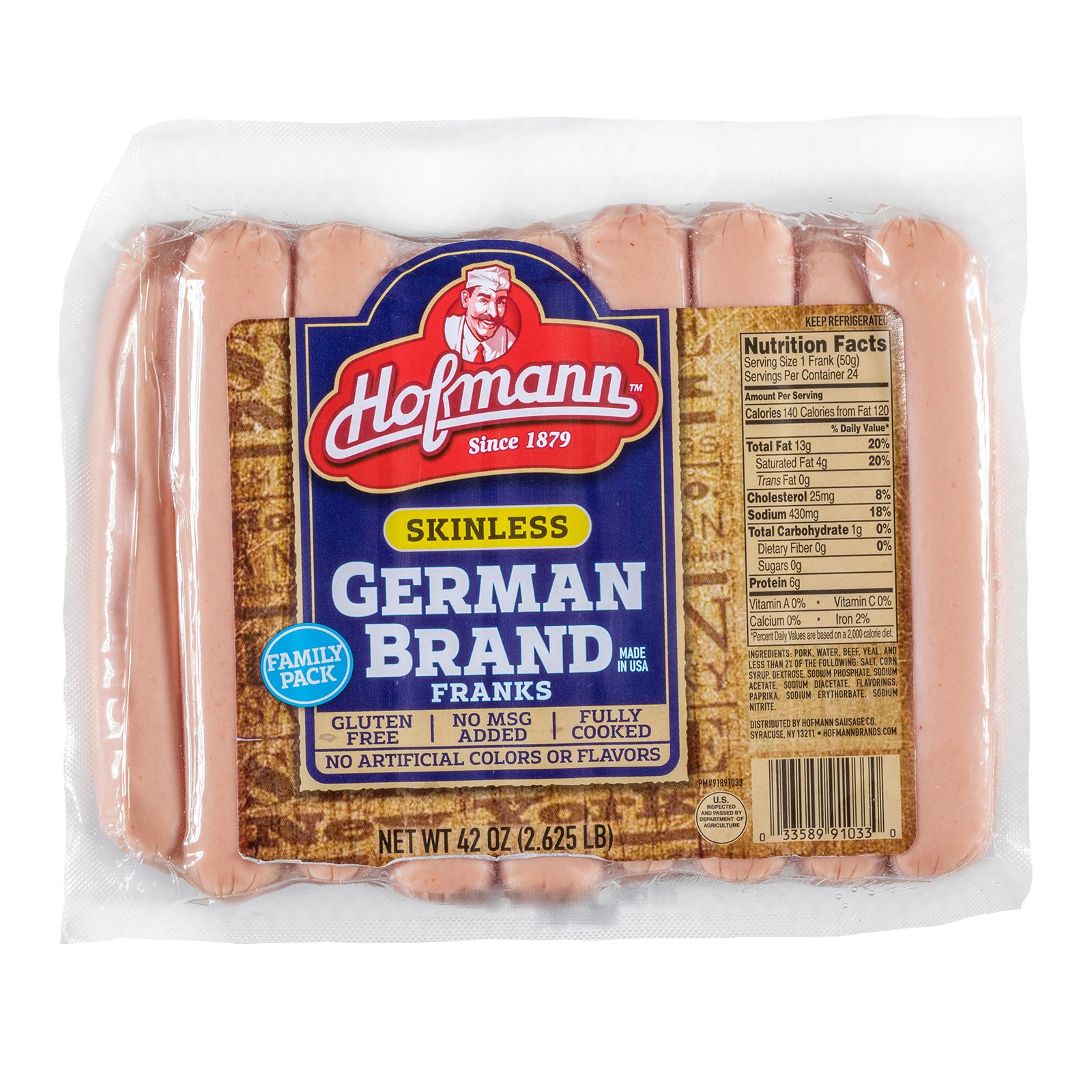 Proudly made in the USA. The Hofmann Sausage Company Skinless German Brand Franks’ recipe has been around for well over a century. This product is modeled after the legendary Hofmann natural casing German Brand Franks which started it all for their brand, but this is a skinless version. These franks are made with quality meat and select spices for a taste uniquely Hofmann. No fillers, by-products, artificial colors, or artificial flavors are used. Hofmann products are fully cooked. These franks can be grilled, pan-fried, or air fried to be eaten traditionally in a bun or they can be cut up and included in recipes. Minimal prep time makes Hofmann Skinless German Franks easy and quick to prepare and serve. This pack size is perfect for a large family, gathering, or cookout. Hofmann hot dogs and sausages, if sealed properly before the expiration date, can also be good for up to a year in the freezer.