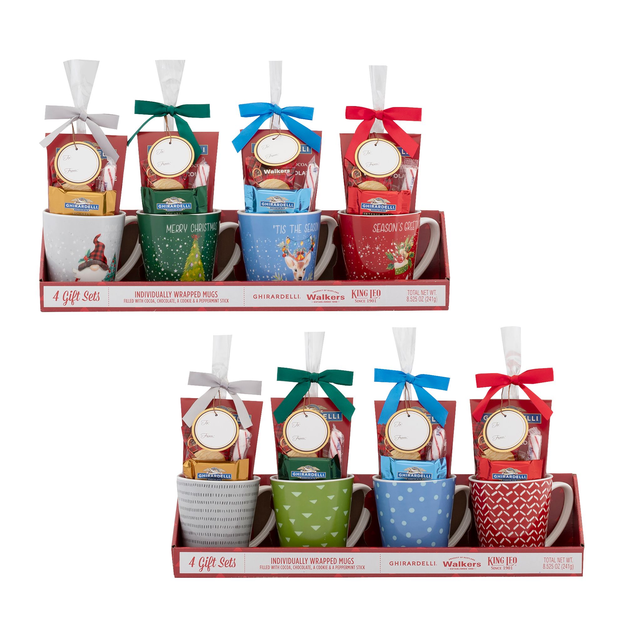 The Holiday Mugs Four Pack Gift is a collection of four stoneware mugs filled with holiday treats. Each festive holiday commuter mug contains Ghirardelli Cocoa, a Walkers Shortbread cookie, Ghirardelli chocolate, and a Peppermint Stick stirrer. This pack is organized for individual gifting, making it easy to separate each mug set and gift them to recipients on your holiday list.