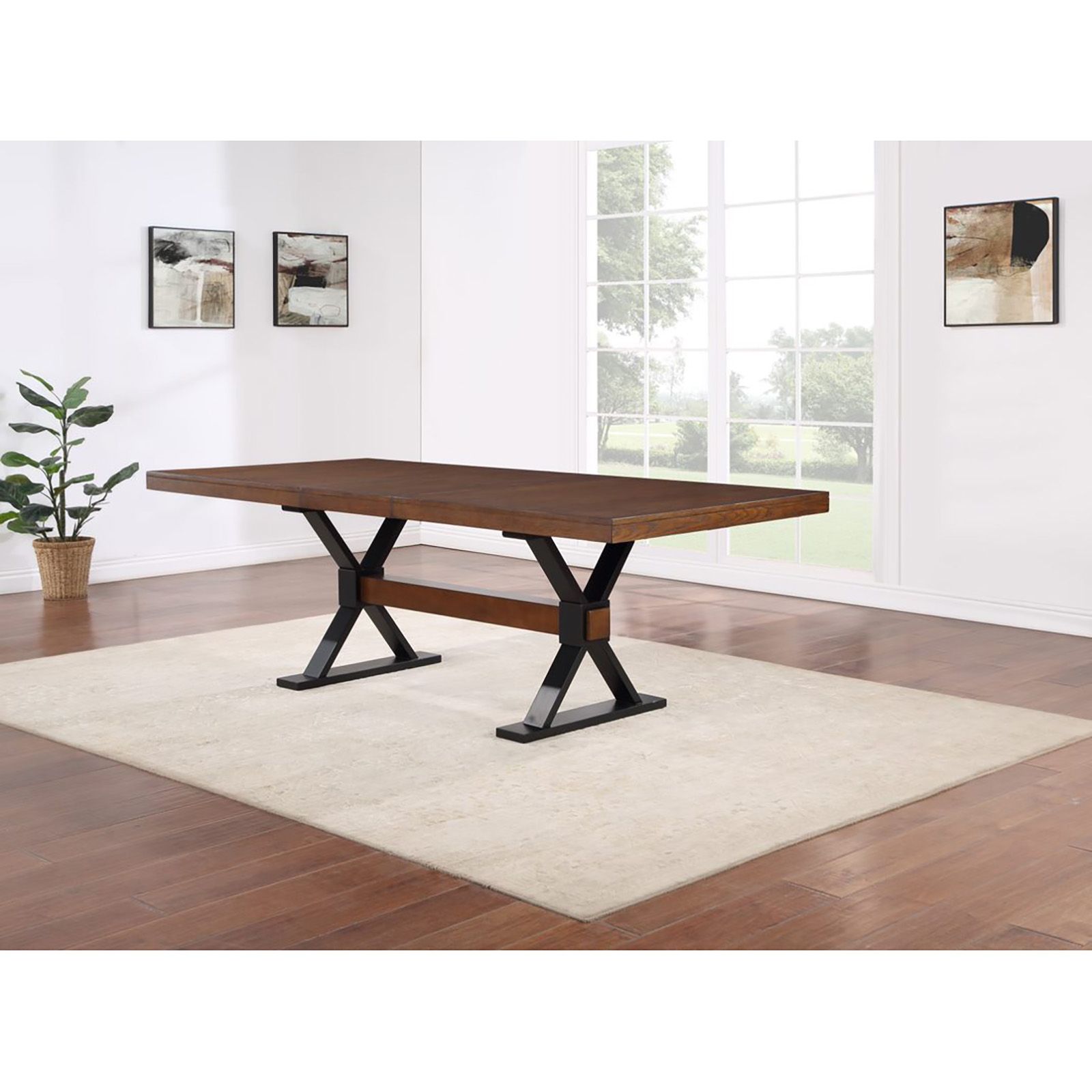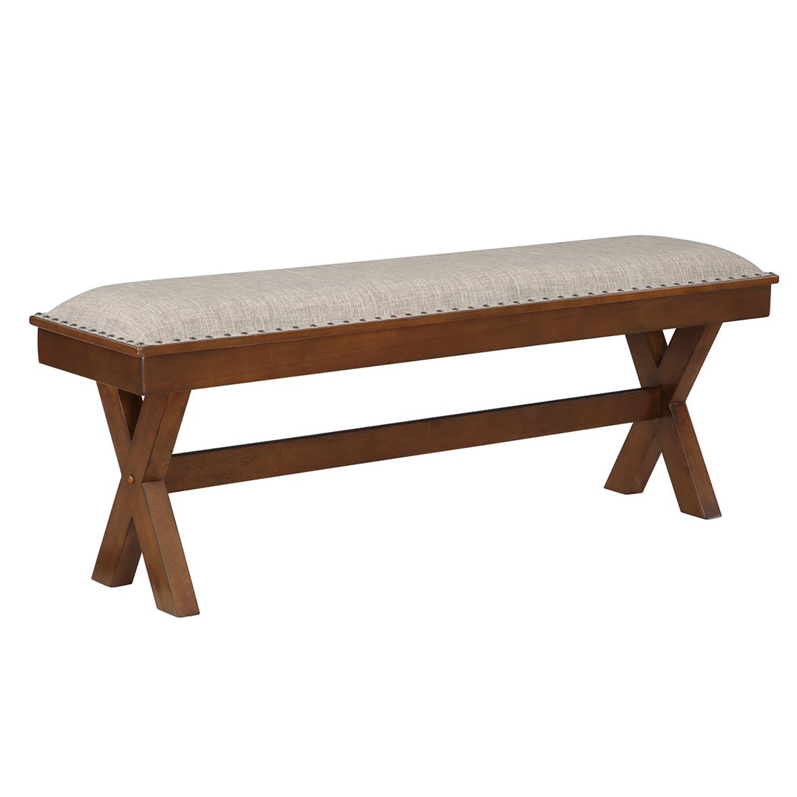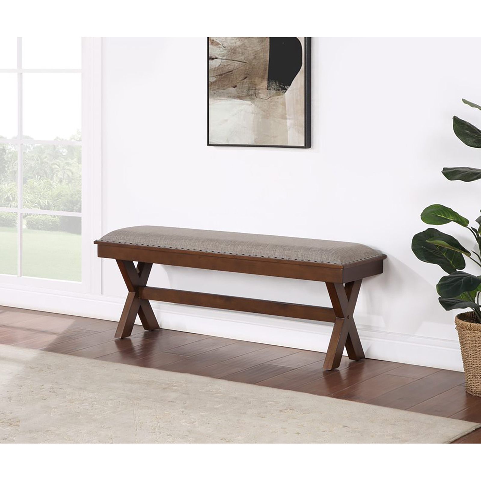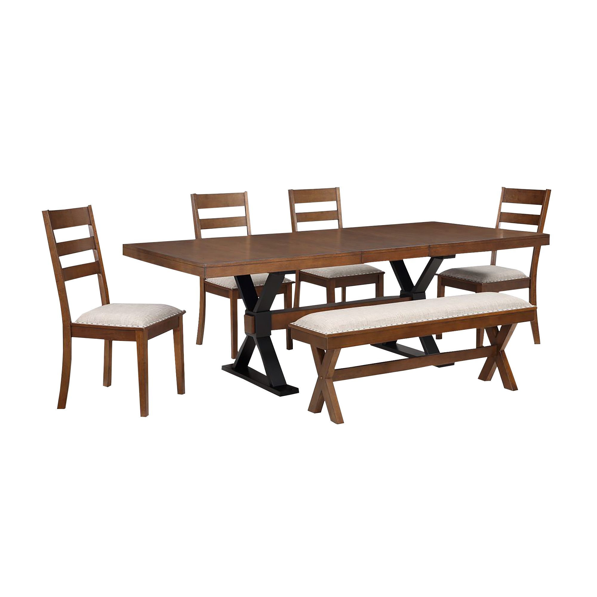 The Home to Office Dexter 6-Pc. Dining Set provides your space with farmhouse-chic detail. This dining set is constructed from solid rubberwood and engineered wood. The table features an oversized chunky trestle dining table base and bench designs. The armless dining chairs have a wood ladder back, fabric upholstered seats, and tapered legs.