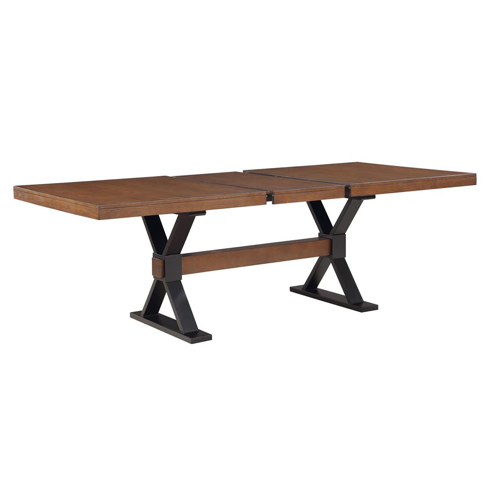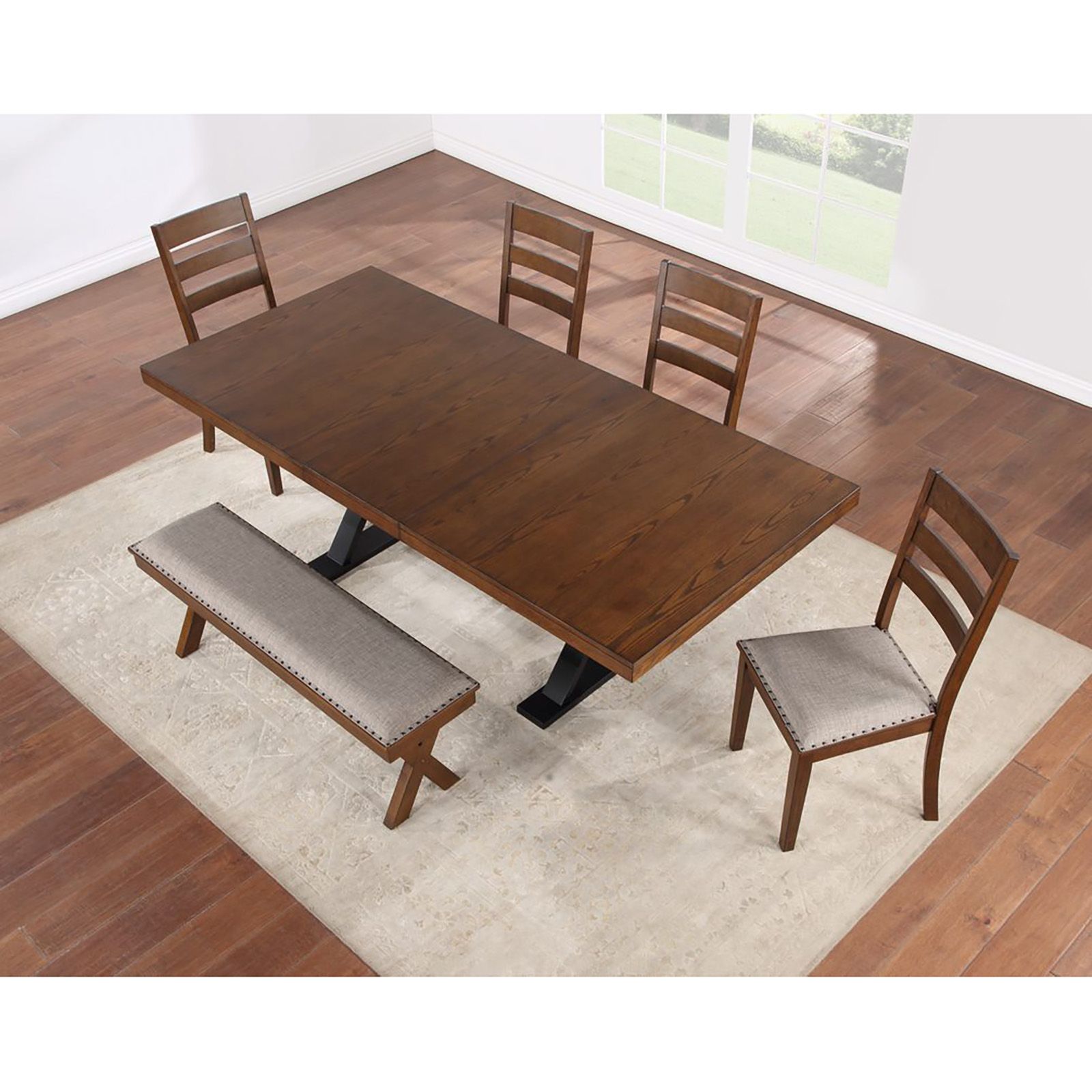 90" Table includes an 18" removable leaf Four solid wood upholstered chairs Upholstered bench Warm walnut finish Table dimensions (with removable leaf): 90"L x 42"W x 30"H Table dimensions (without leaf): 72"L x 42"W x 30"H Includes table, removable leaf, four chairs and matching bench