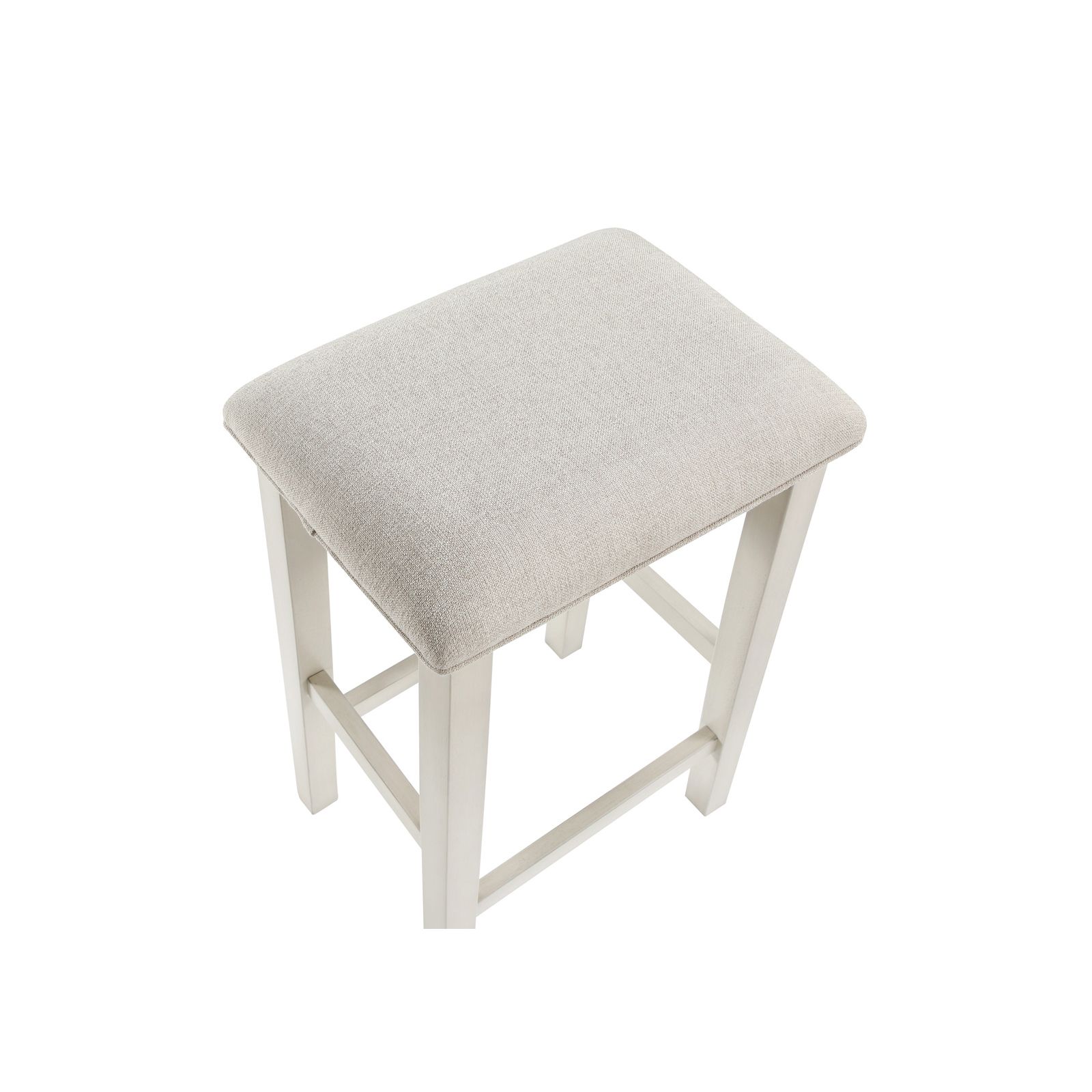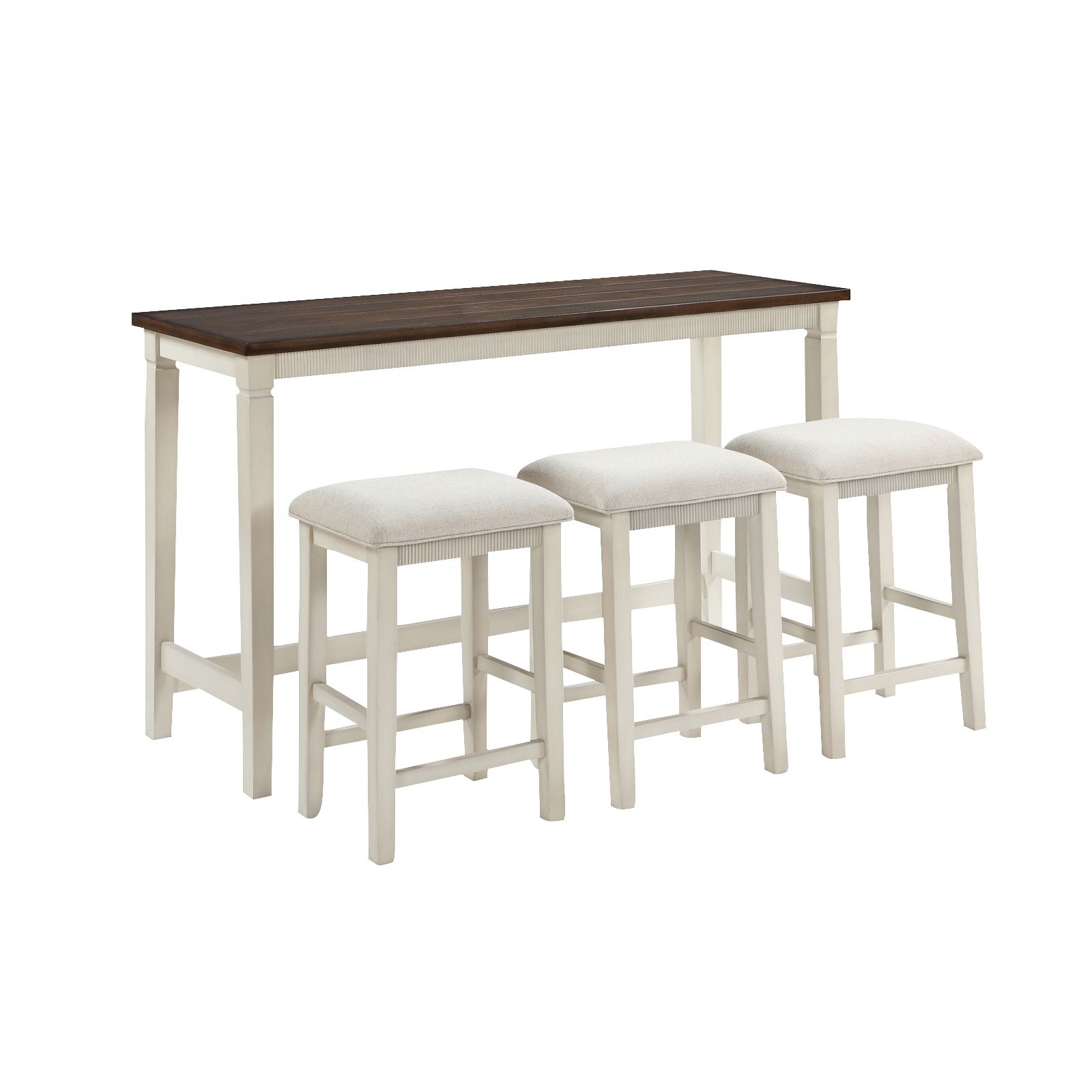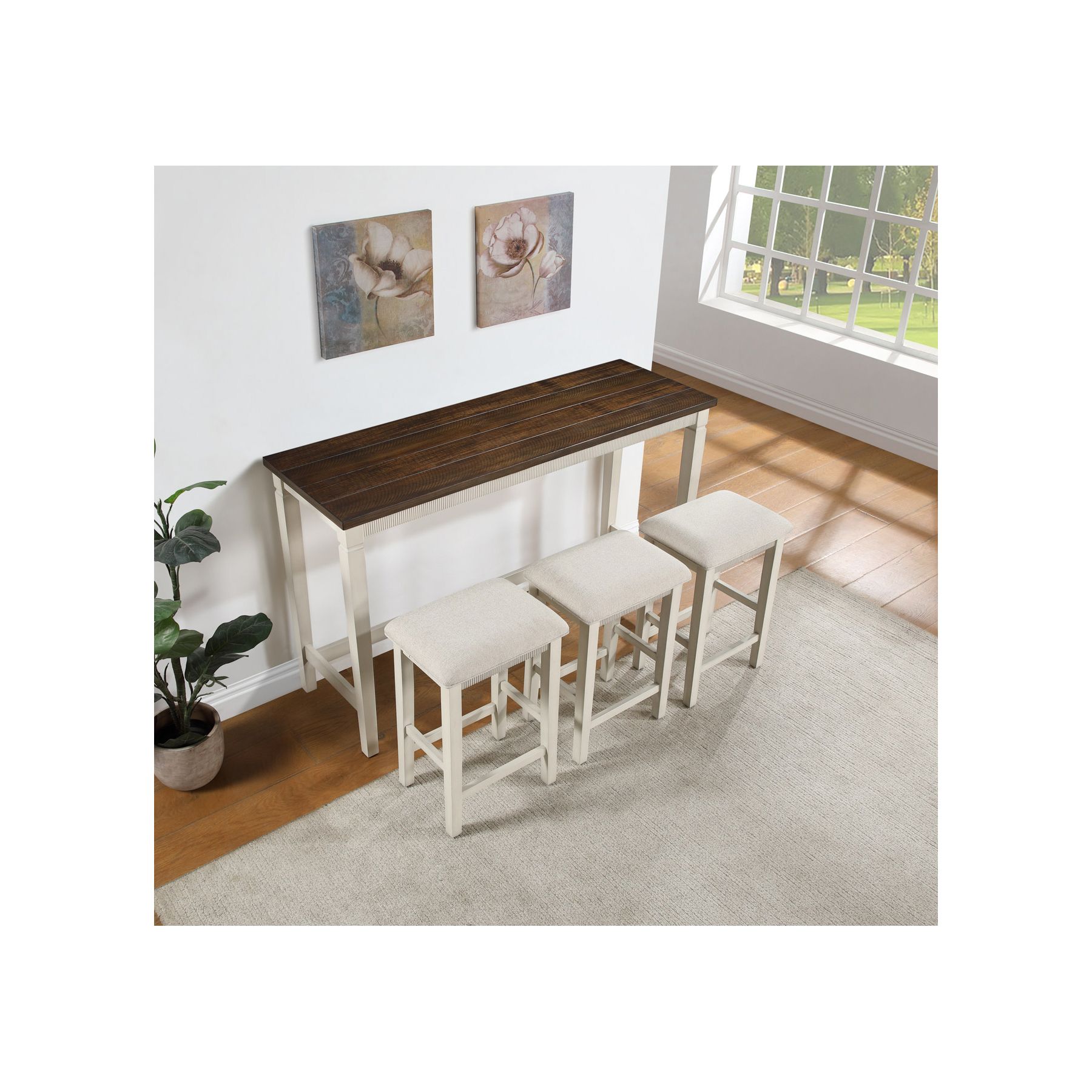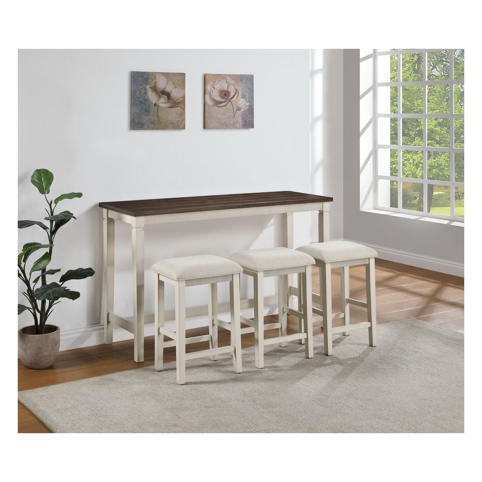 This 4-pc. Sara counter height dining set immediately creates a classic home bar or laptop station. It includes one counter-height table and three matching bar stools. Each is crafted from solid and engineered wood in a clean white finish that goes with nearly any color scheme. The table's design features a box apron for a timeless look. The three stools have upholstered seats and built-in footrests. Backless construction of the stools means they fit neatly underneath the counter table, saving you floor space. And to make it even better there is a USB charging port for added convenience.