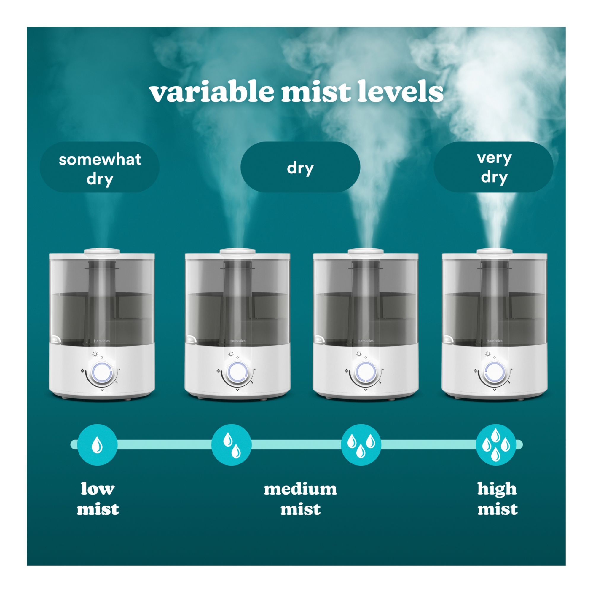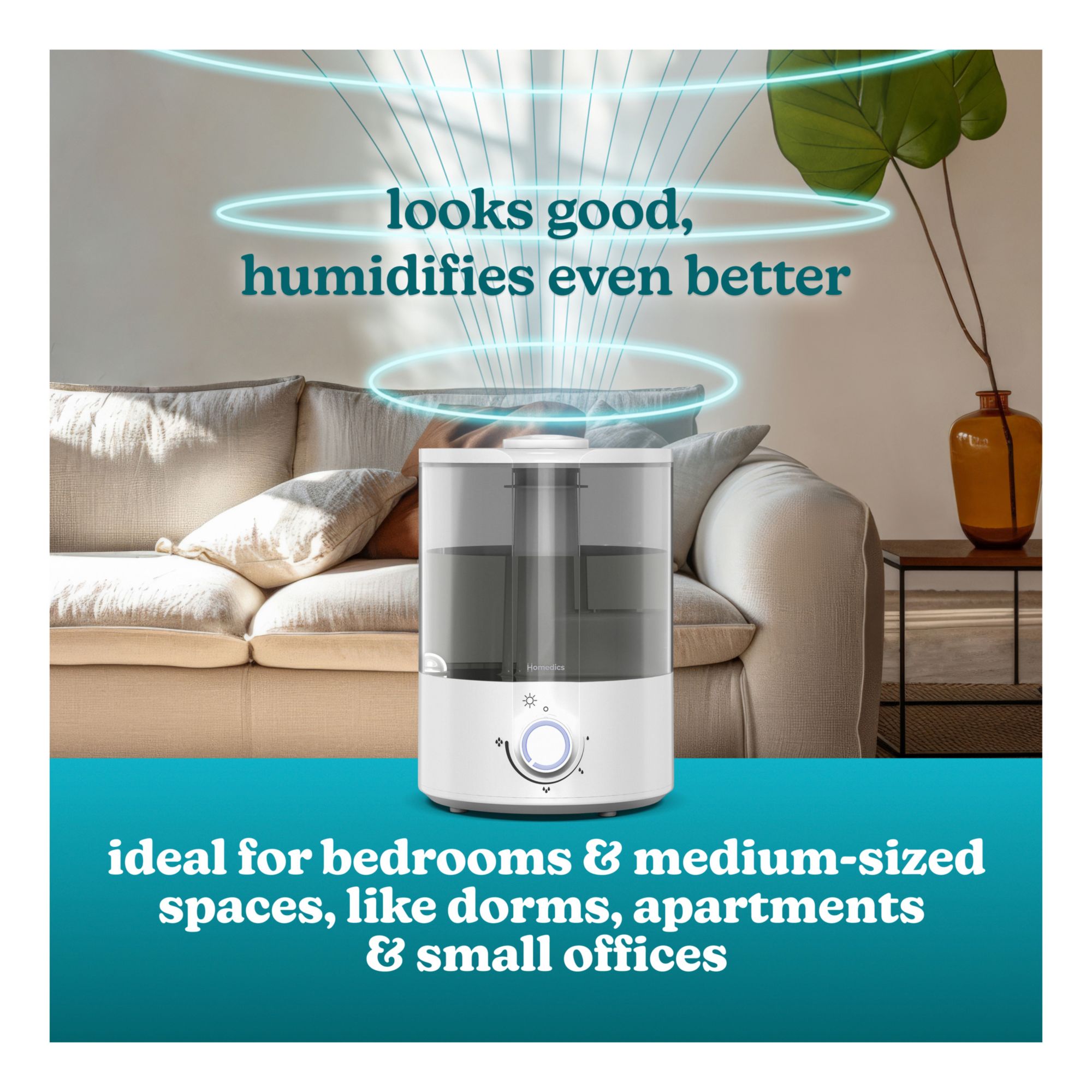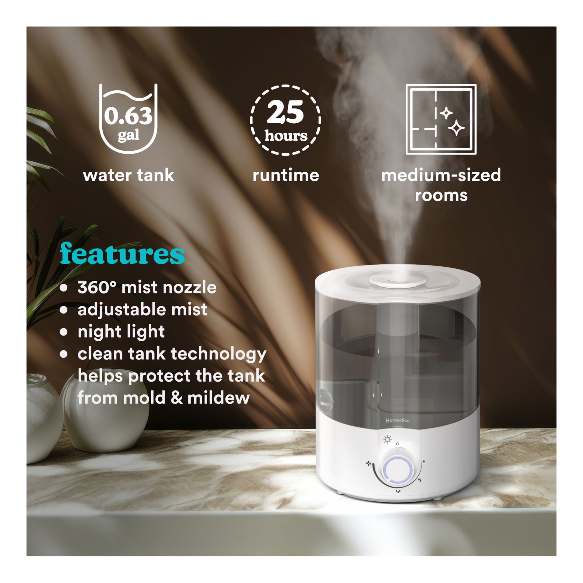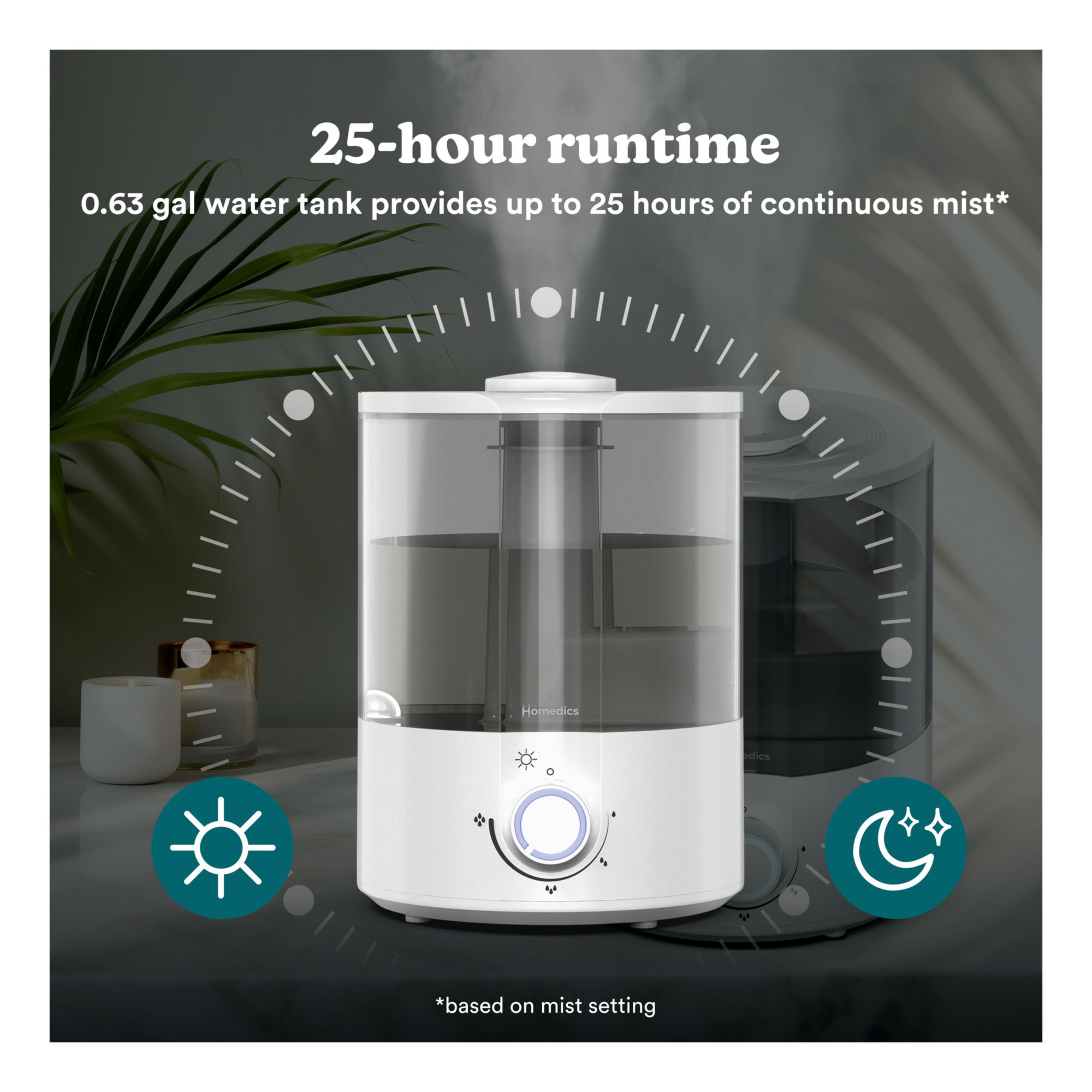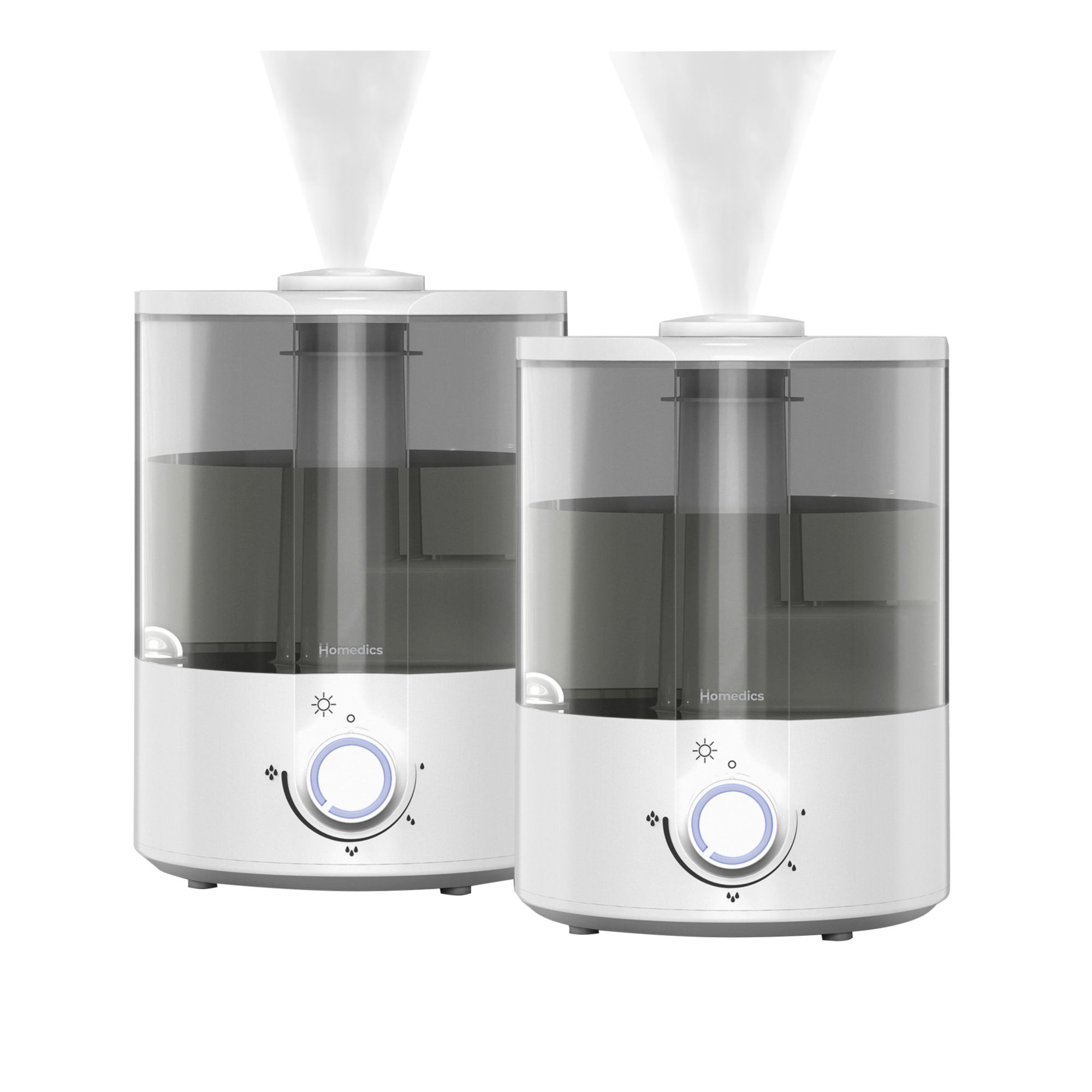 Upgrade your home's humidity with our Homedics Ultrasonic Humidifier CMTF34 2 pk., ensuring expanded coverage and greater control over your indoor environment. The visible cool mist hydrates your air, benefiting both you and your houseplants. Our 0.63 gal. top-fill water tank is easy to fill and clean and provides up to 25 hours of runtime. Perfect for medium-sized family rooms and bedrooms. Add a few drops of your favorite essential oil to the essential oil pad for scented hydration. Inhale pure relief and enhanced comfort with our 2 pk. to perfect your home's humidity levels.