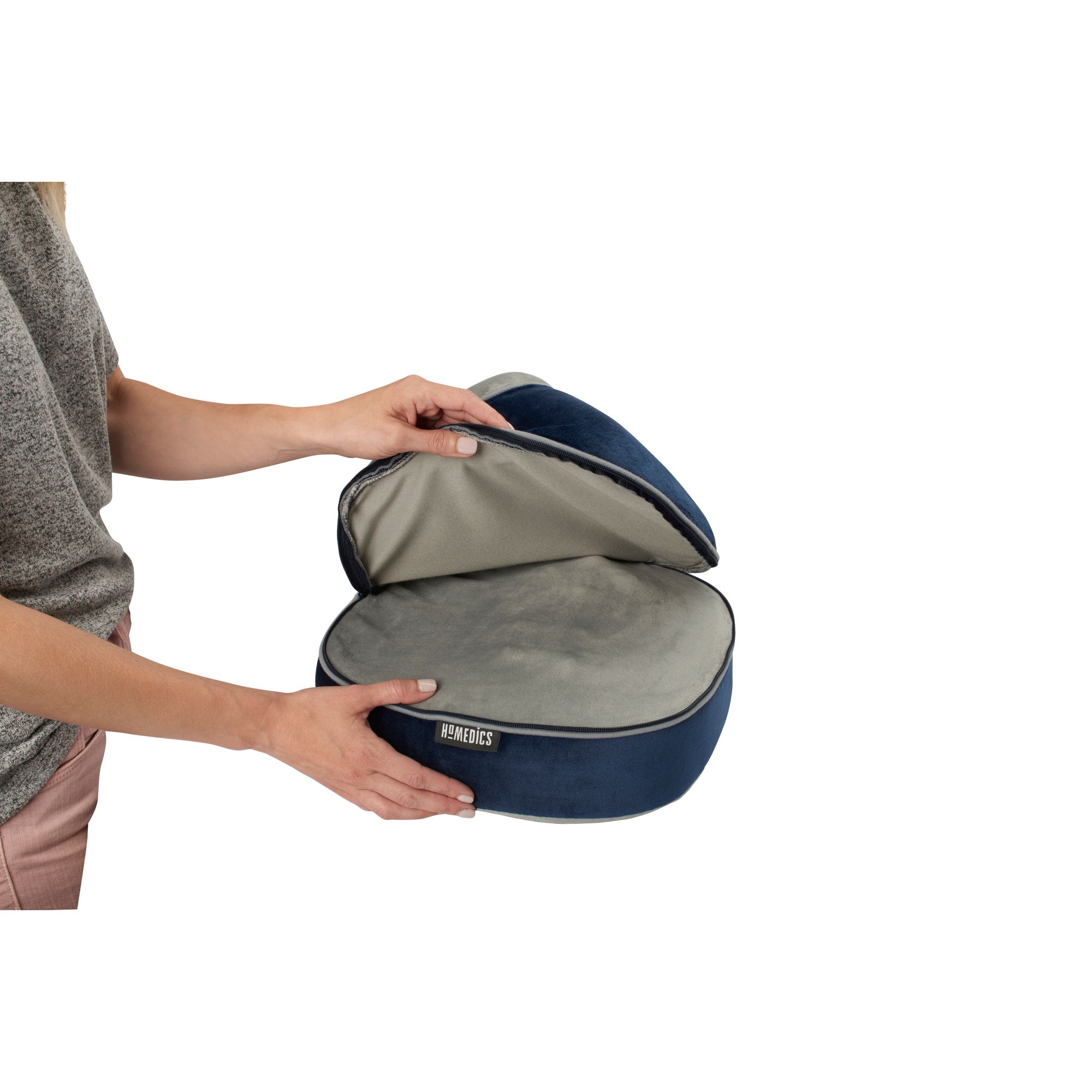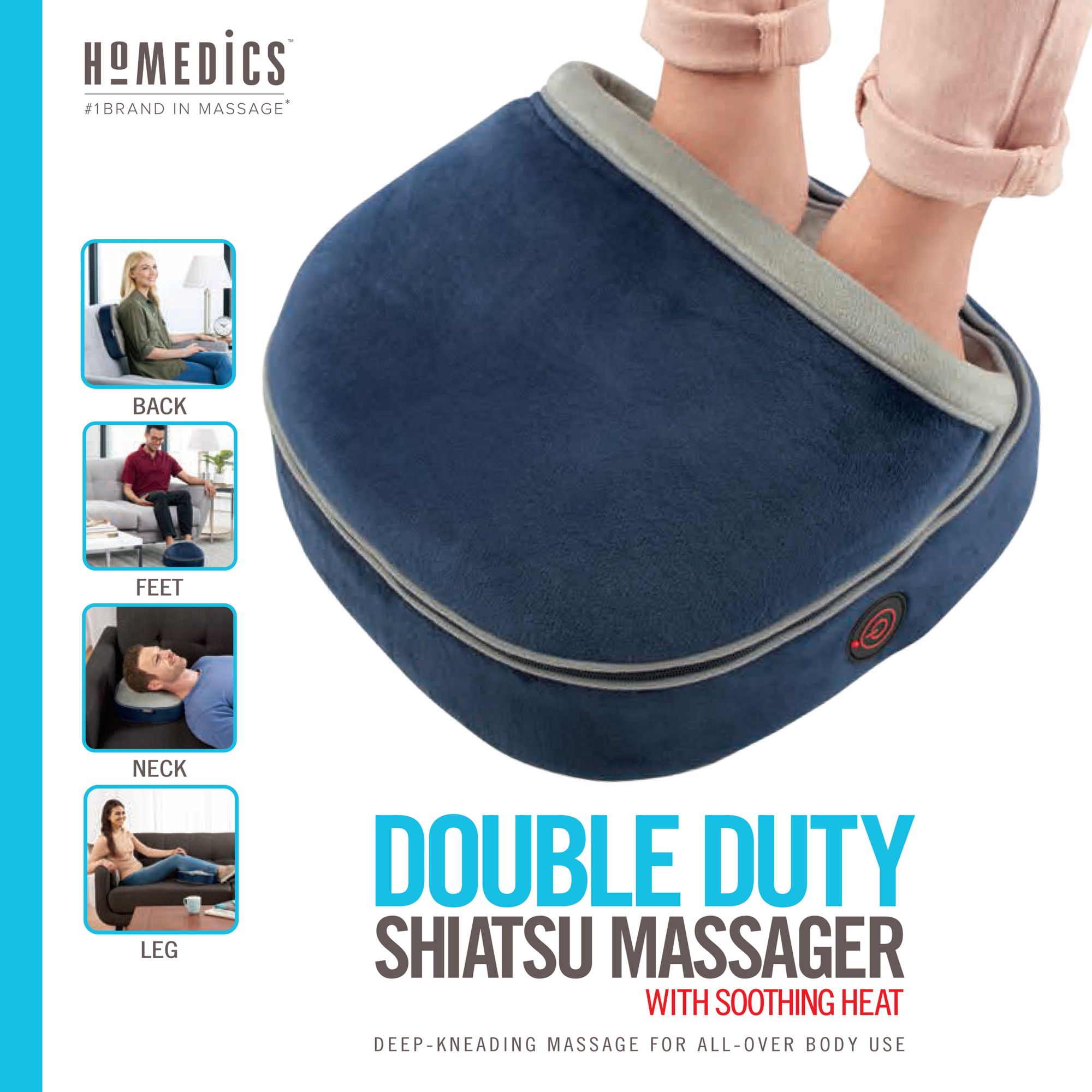 The HoMedics Double Duty Massager with Heat soothes and rejuvenates with a deep kneading massage. Soothing heat provides added comfort while a removable cover allows for versatile use. With the hood, use it as a cozy foot massage. Remove the hood and use it as a pillow for the neck, back and shoulders or calves and thighs. The removable washable cover provides easy cleaning. An integrated strapping system fits most chairs.