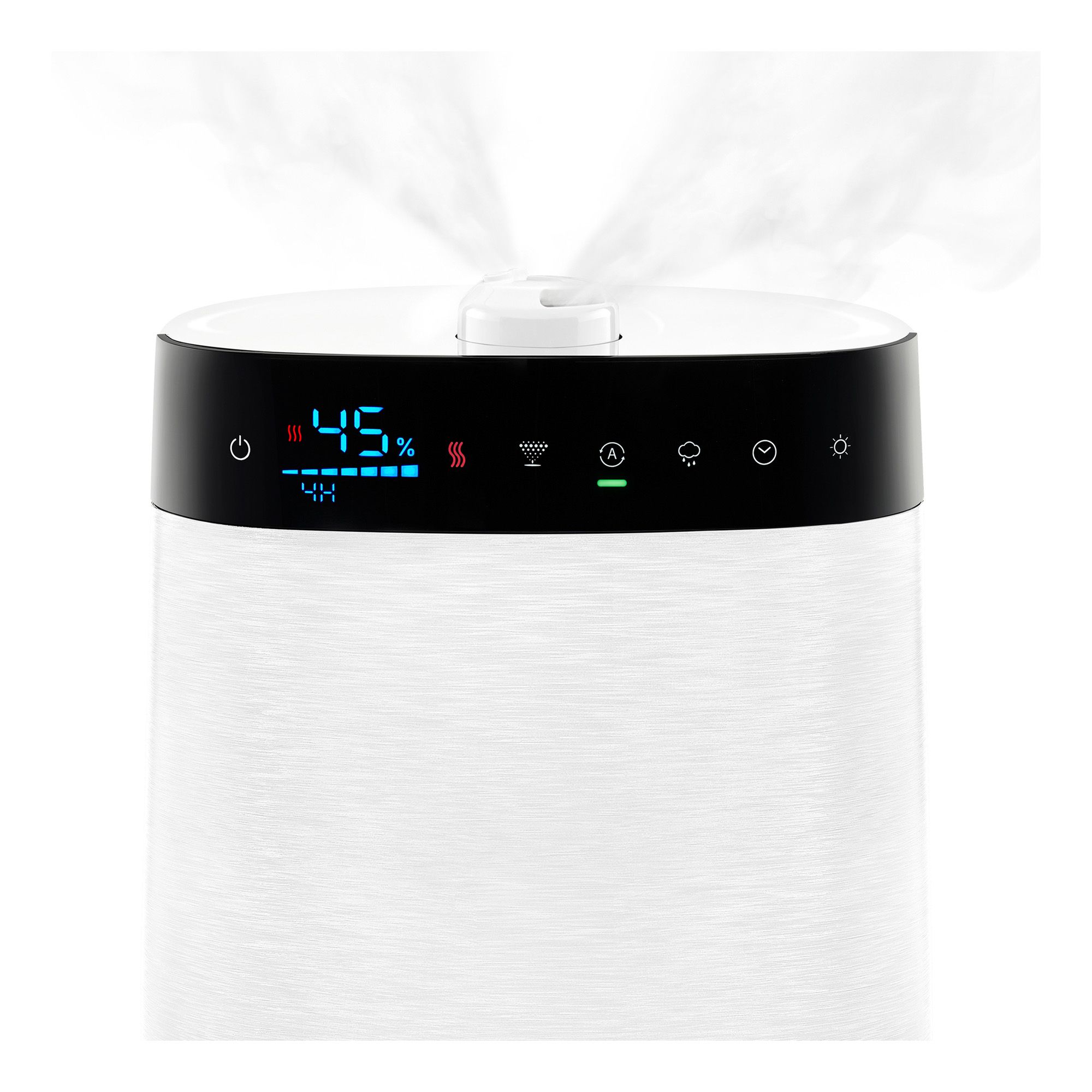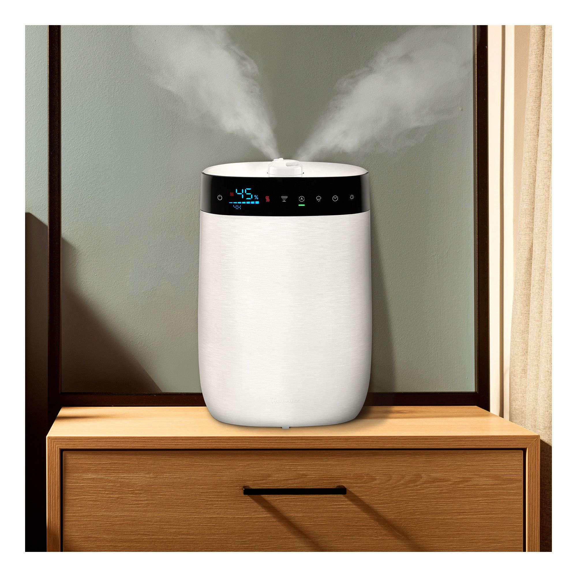 The 1.5-gallon top-fill water tank is easy to clean and fill, delivers up to 70 hours of runtime per fill, and features clean tank technology to help protect the tank from mold and mildew. Great for large bedrooms and family rooms, this humidifier automatically shuts off when out of water. The programmable digital humidistat with smart auto-adjusting humidity sensor helps you easily set and maintain your ideal room humidity, and features an easy-to-understand color indicator so you can stay in control of your comfort.