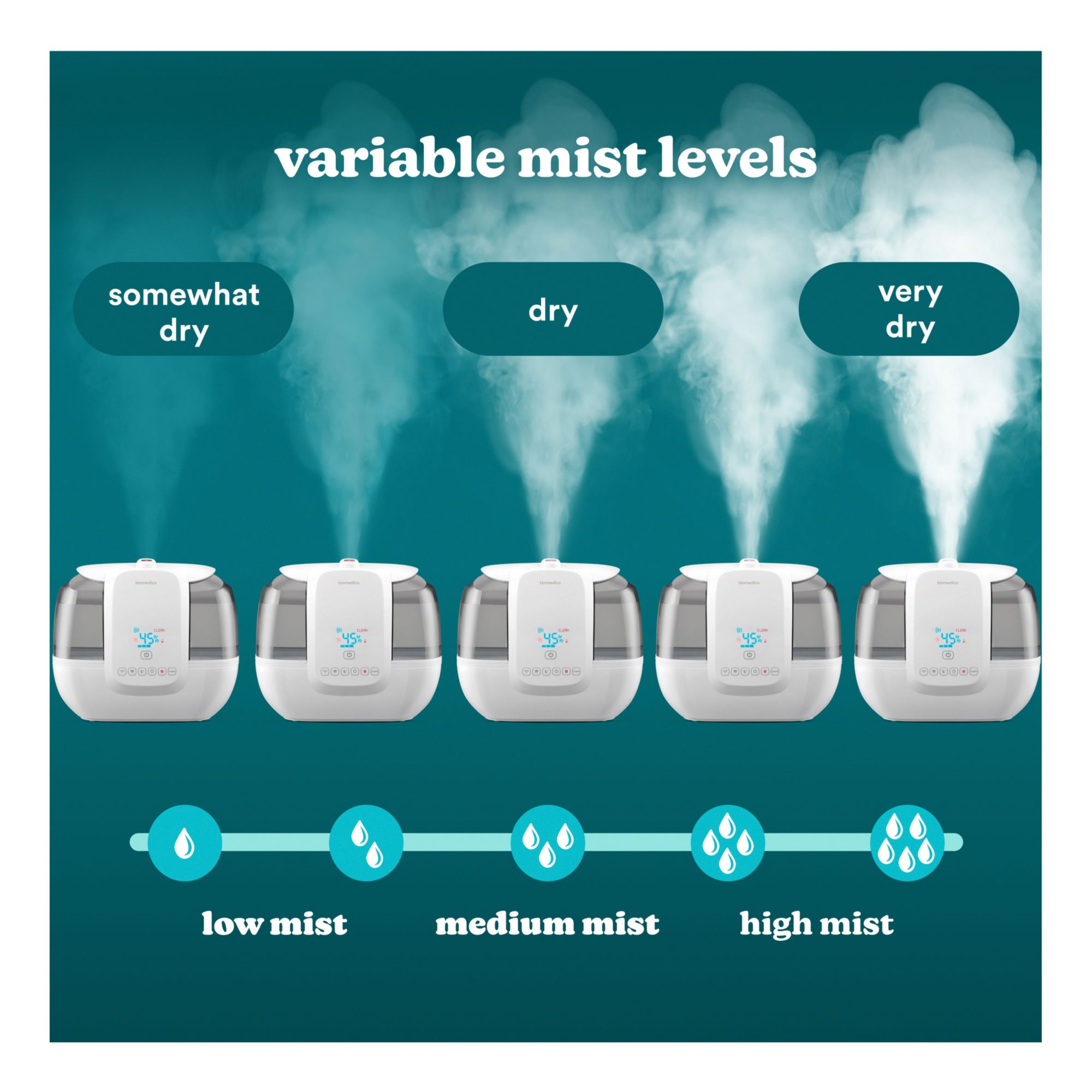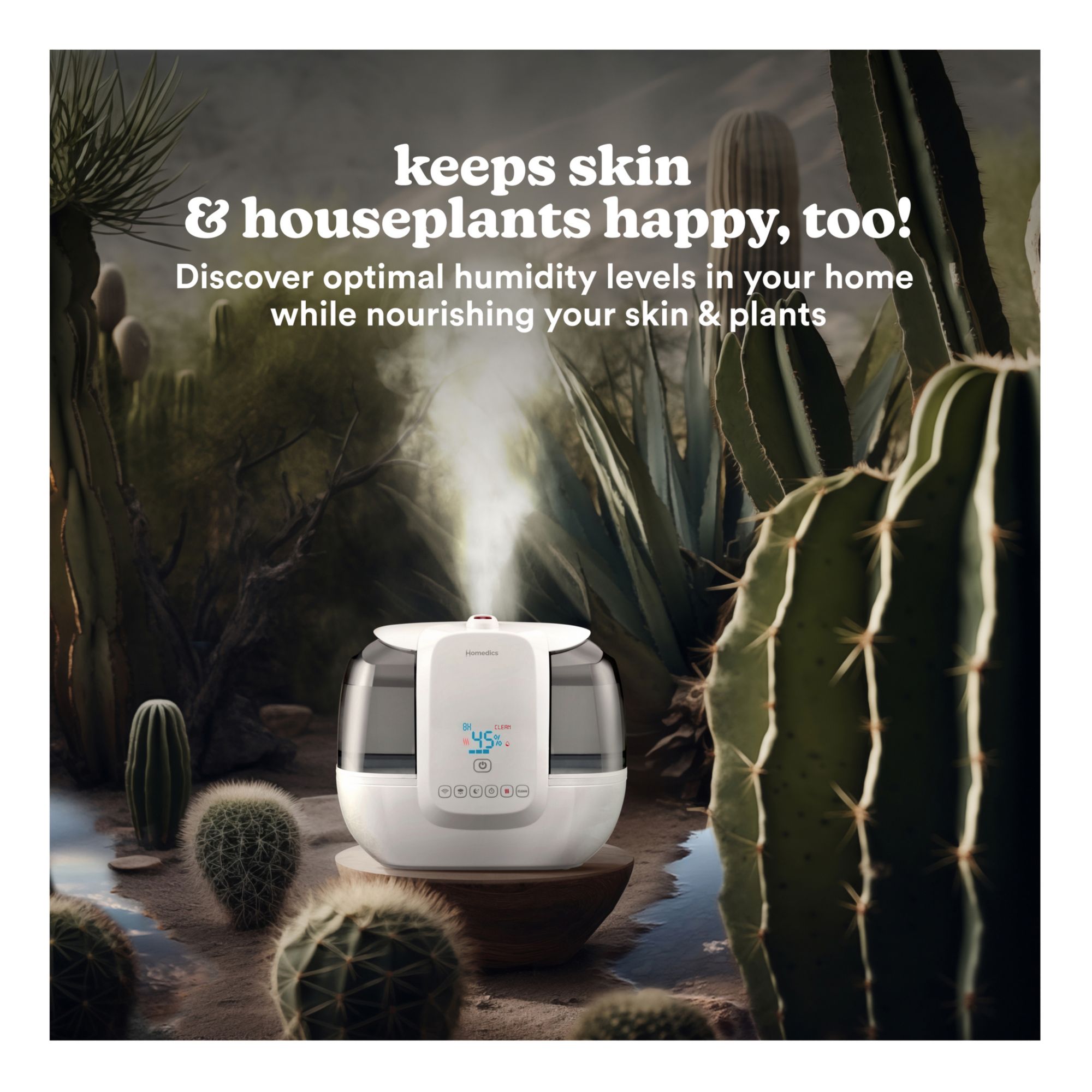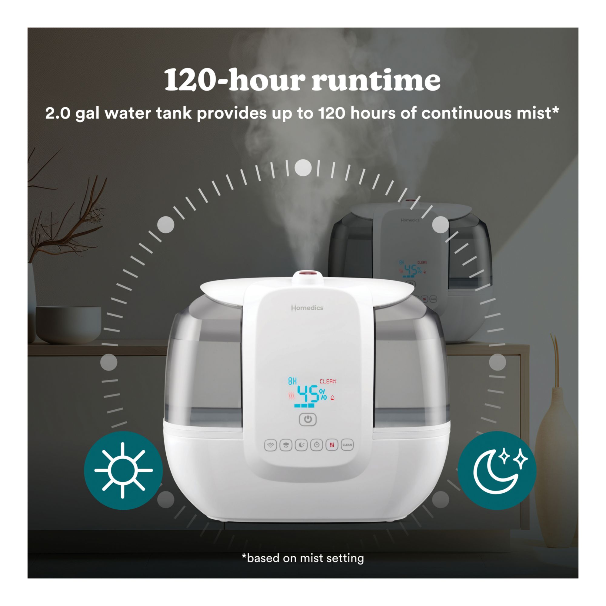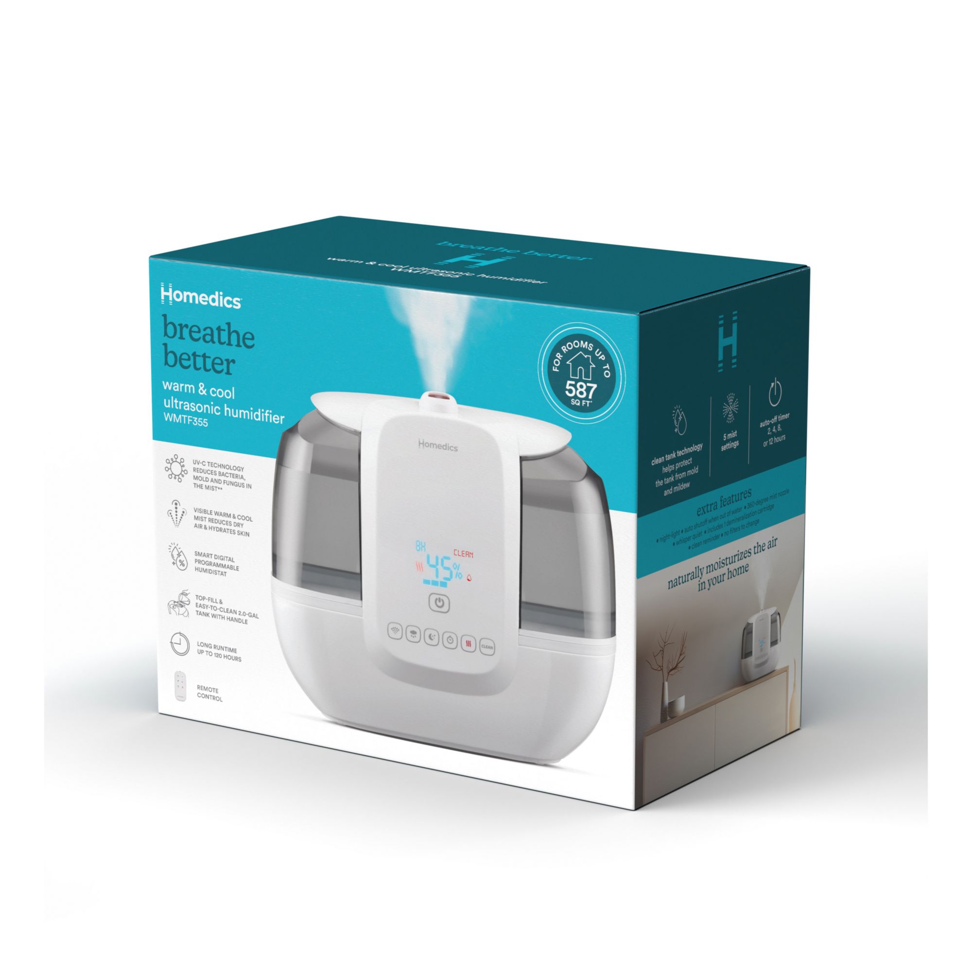 Upgrade your home's humidity with the Homedics warm and cool Ultrasonic Humidifier WMTF355 with a remote, ensuring convenient control over your indoor environment. The visible warm and cool mist with five mist settings hydrates your air, benefiting both you and your houseplants. The 2 gal. top-fill water tank is easy to fill and clean and provides up to 120 hours of runtime. Perfect for large family rooms and bedrooms, this humidifier features UV-C technology to reduce bacteria, viruses, mold, and fungus in the mist. Its whisper-quiet technology makes it ideal for large family rooms and bedrooms up to 587 sq ft. Breathe in the benefits.