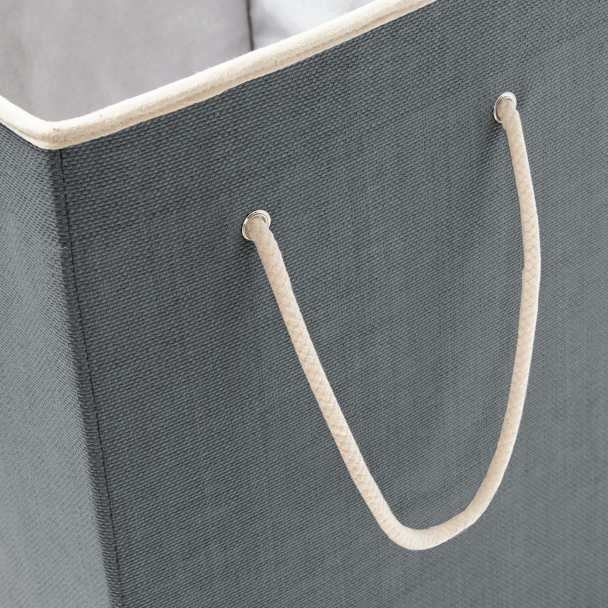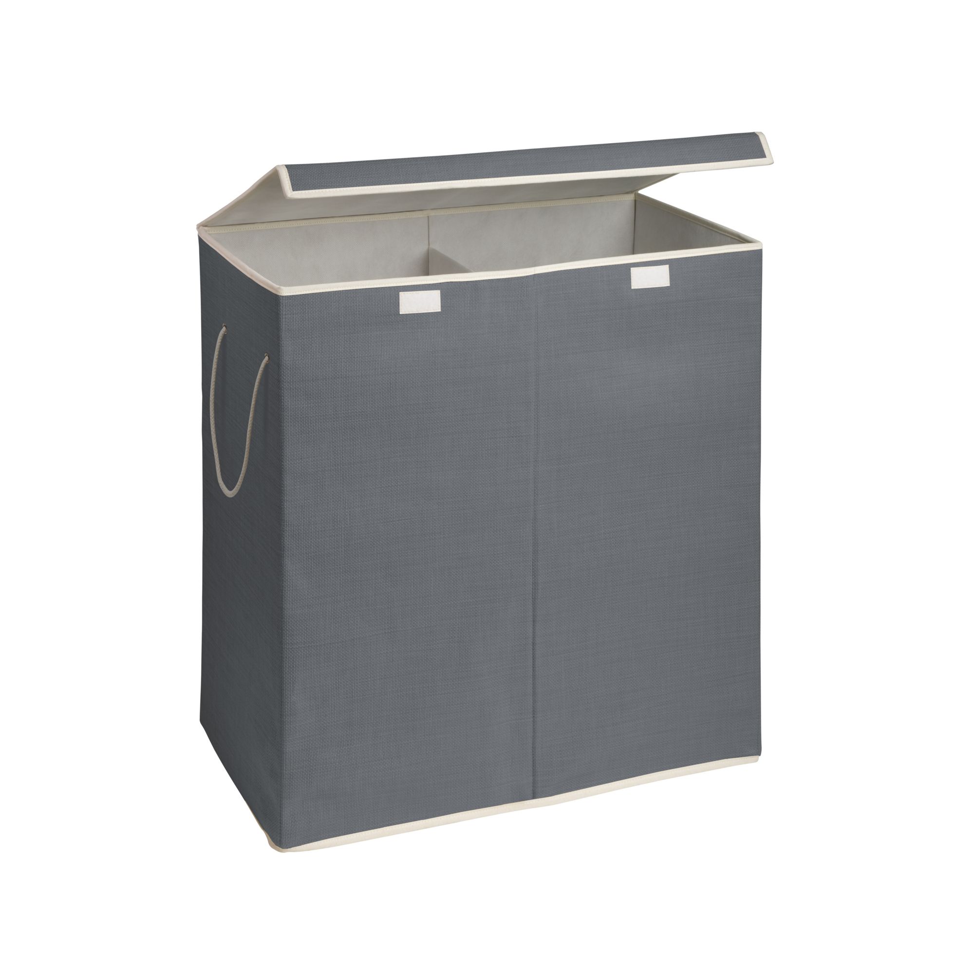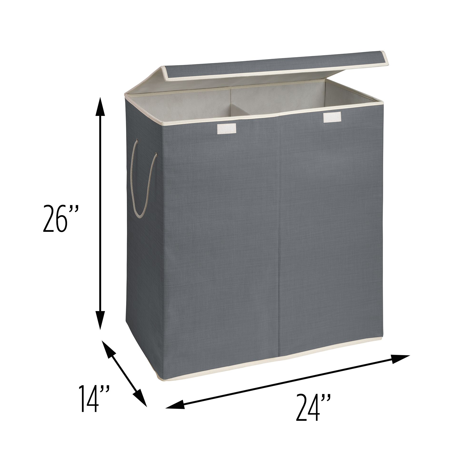 Features 2 compartments for easy clothes sorting Durable resin exterior in neutral, cool grey with breathable liner Handles provide mobility Folds flat for easy storage when not in use Closes tight with Velcro lid Dimensions: 14"L x 25”W x 26”H Gray Includes sorting hamper