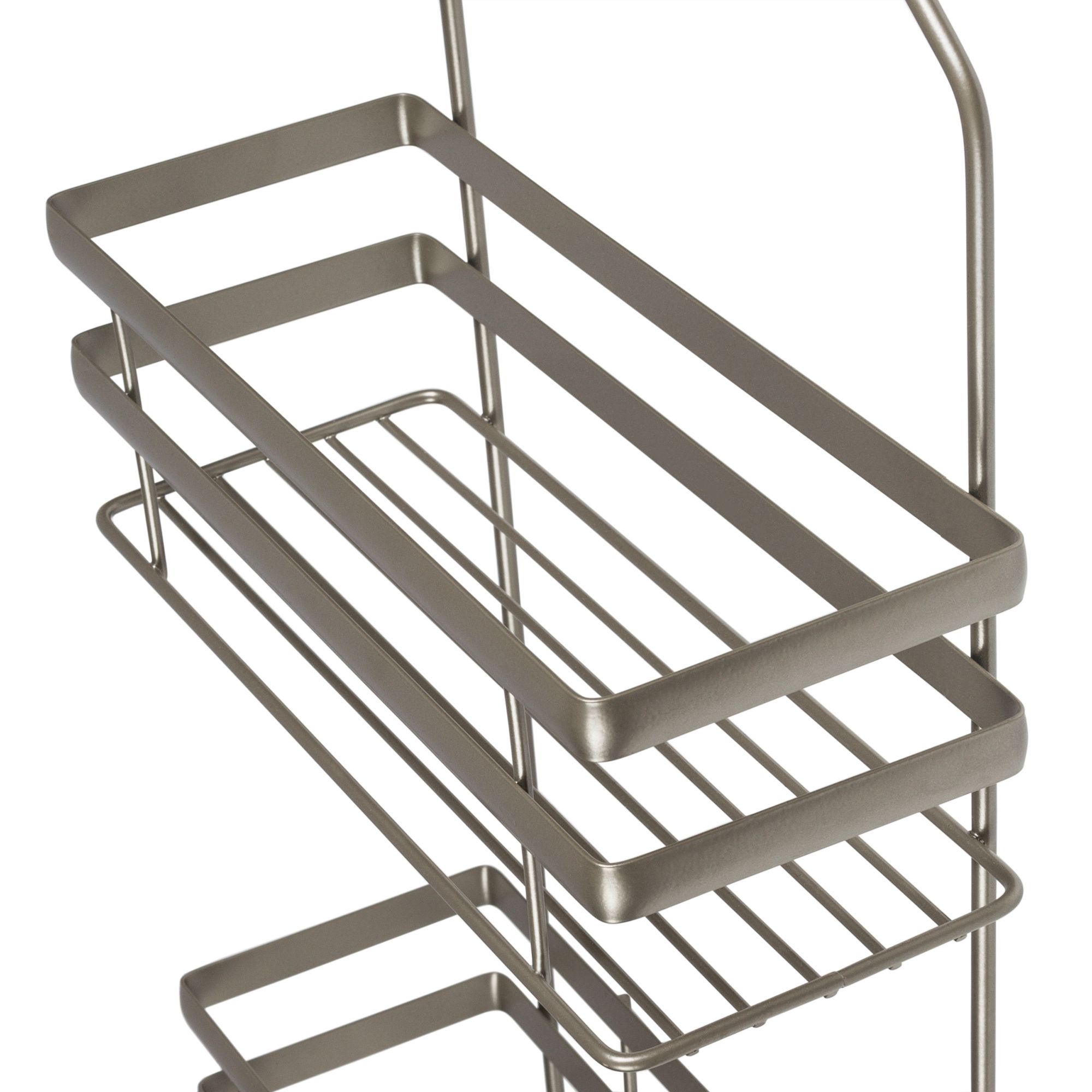 Shower caddy securely fits standard shower heads Offers two hooks and one soap tray Suction cups for stability Designed in soft, neutral finish with modern angular frame Durable steel material for long-lasting use Dimensions: 11”L x 4.5”W x 26”H Gray Includes flat wire steel shower caddy