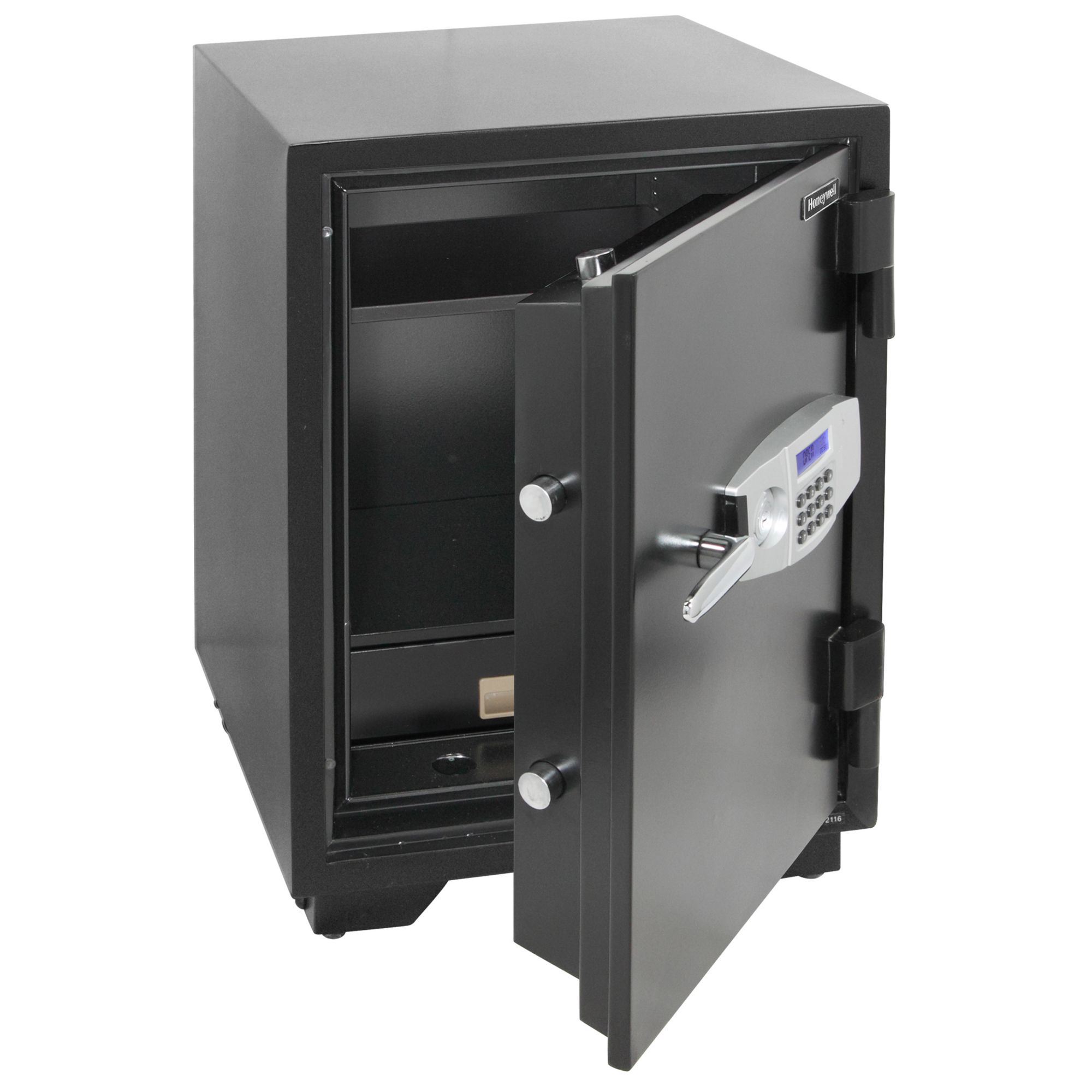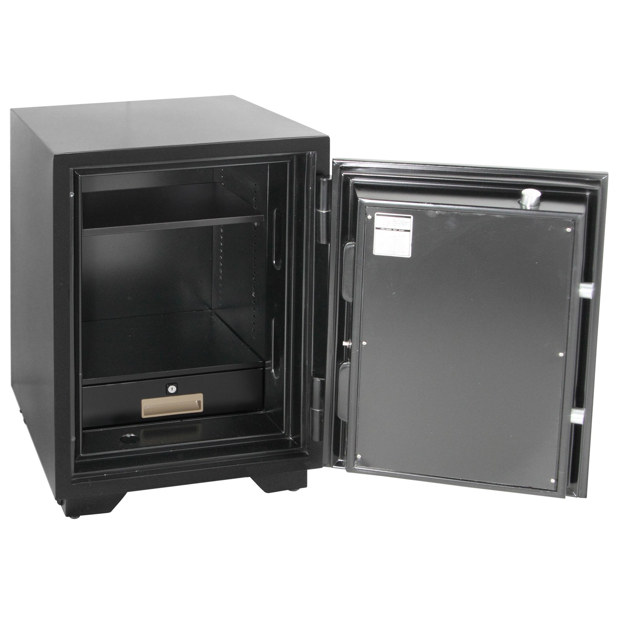 Double steel wall construction and 1-hour fire protection to protect your valuables in the event of a burglary or fire 6 solid steel door bolts and a lever-style door handle for enhanced security Programmable dual-user digital lock allows more than 1 user to have access to the safe Control panel with LED readout is easy to read Audible motion and tilt alarm alerts you when the safe is being tampered with Programmable calendar and clock and retrievable user history log for added convenience Adjustable/removable shelf and locking storage drawer for storing a range of items Heavy-duty steel casters let you move the safe about the room 2 emergency access keys prevent accidental lock out Resistant to water from sprinklers and fire hoses Durable powder-coated finish in black for long-lasting good looks Volume: 2.1 cu. ft. Weight: 286 lbs. Warranty: 7 years; lifetime after fire guarantee