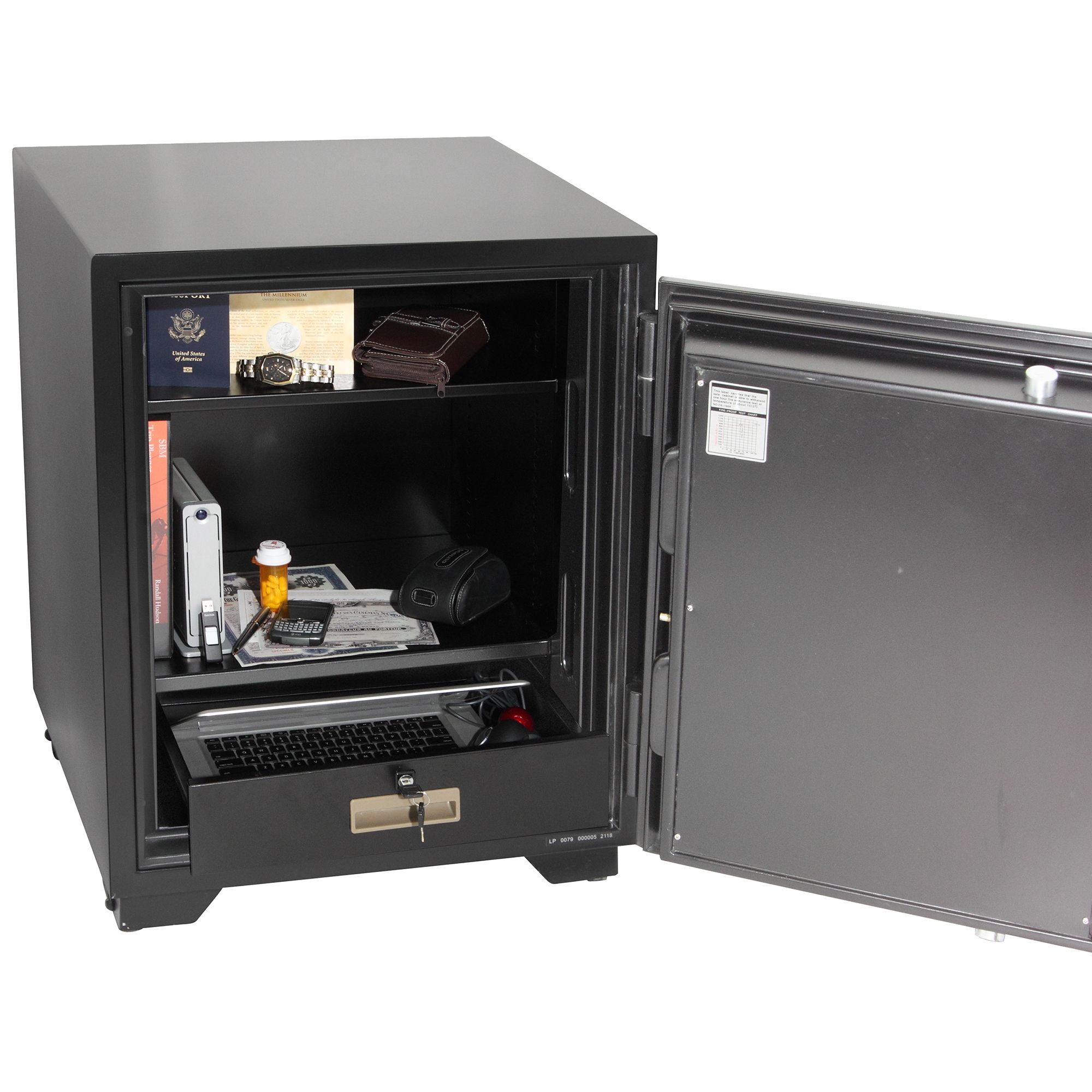 1-hour fire rating up to 1,700° Water-resistant door and cabinet design Dual digital and key lock protection Advanced dual-user lock Override key access LCD display panel Programmable calendar and clock Motion and tilt alarm User history log 4 solid steel live lock bolts 2 solid steel dead bolts Double steel wall construction Locking storage drawer Includes safe, 4 AA batteries Warranty: 7 years limited