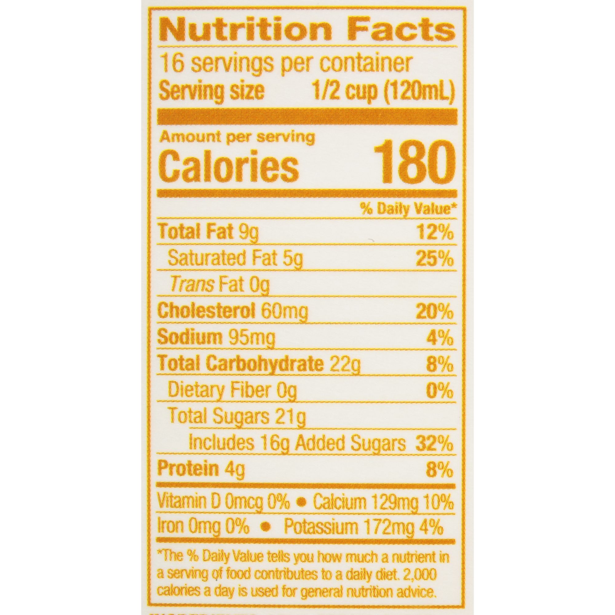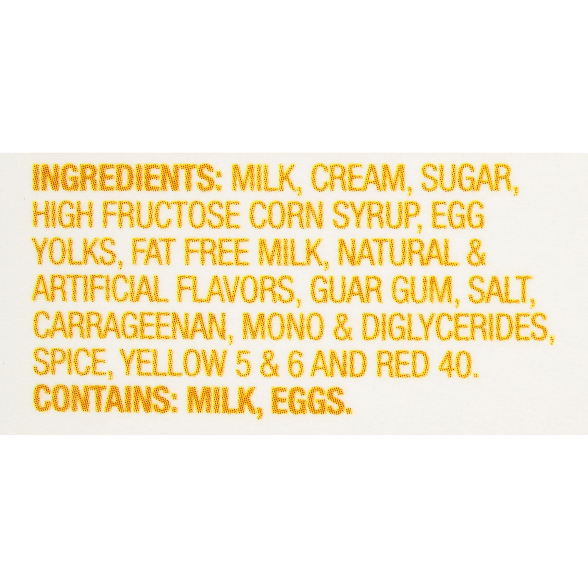 Milk, Cream, Sugar, High Fructose Corn Syrup, Egg Yolks, Fat Free Milk, Natural And Artificial Flavors, Guar Gum, Salt, Carrageenan, Mono & Diglycerides, Red 40, Yellow 5 & 6.