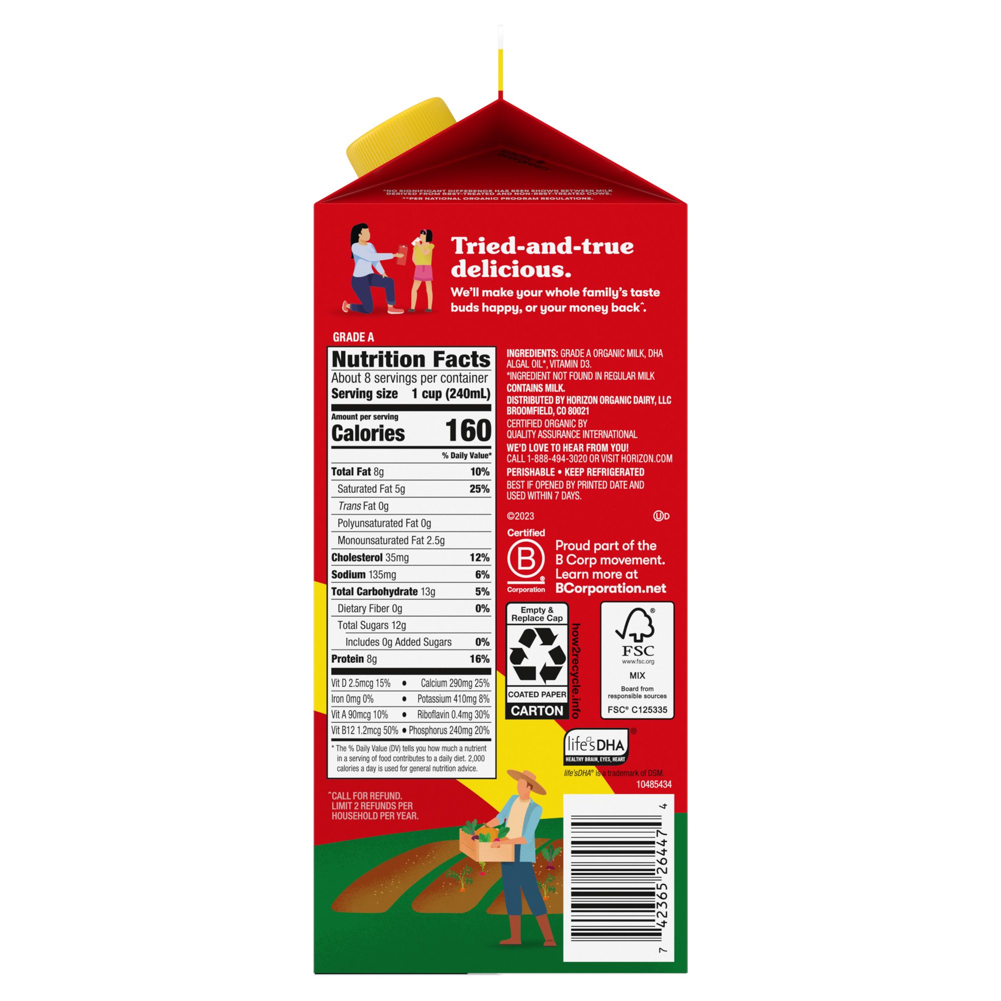 Get the joy of a cold glass of real milk with Horizon Organic DHA Omega-3 Whole Milk. With 32mg of DHA omega-3 from a vegetarian source in every delicious serving, this organic whole milk makes it super easy to get DHA into your day to help support brain and eye health. Always USDA Certified Organic, every Horizon milk carton comes from cows cared for by trusted farmers. Plus, it comes from cows that are fed non-GMO feed and not treated with antibiotics or growth hormones.* Every 1 cup serving of this ultra-pasteurized whole milk has 8 grams of protein and provides nutrients, including calcium, vitamin A and vitamin D. It’s real organic milk that adults and kids can happily enjoy. At Horizon Organic, they believe that farming done the right way can drive healthier, more sustainable food communities for our world. Pioneering organic for the one horizon we all share. From their farmers to your family, Horizon Organic Milk is nourishing a happy, healthy future.