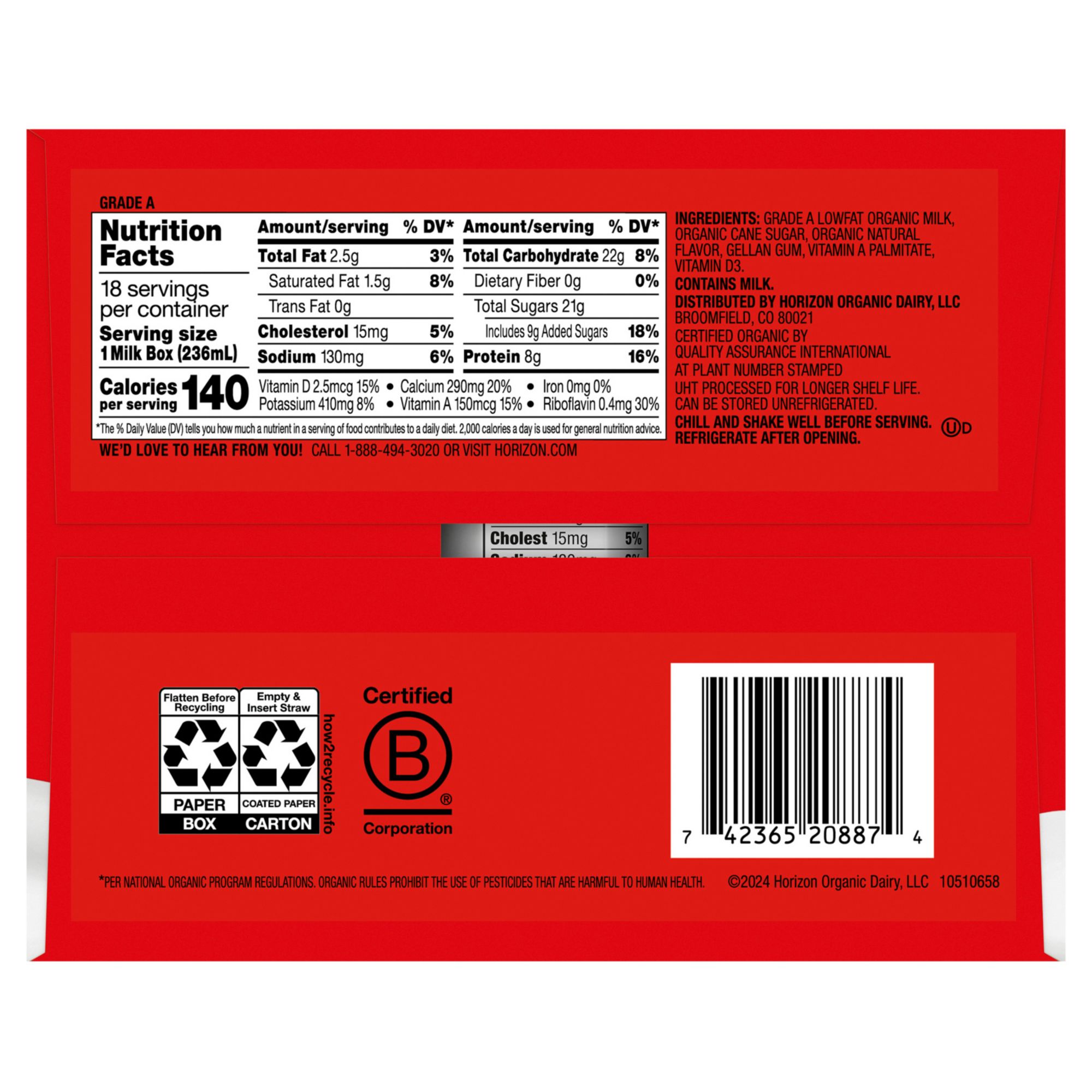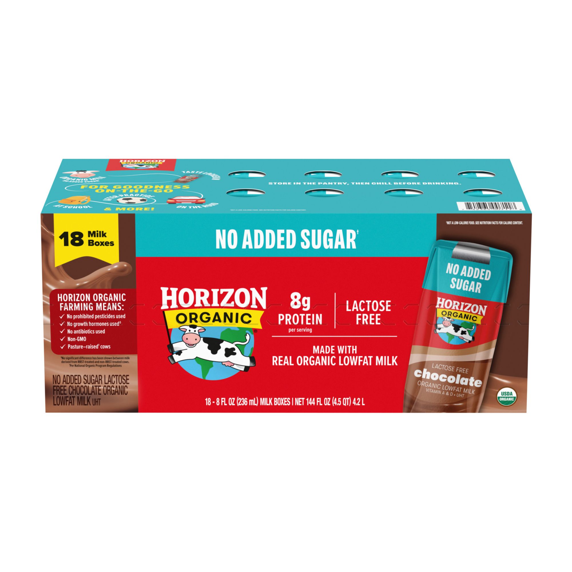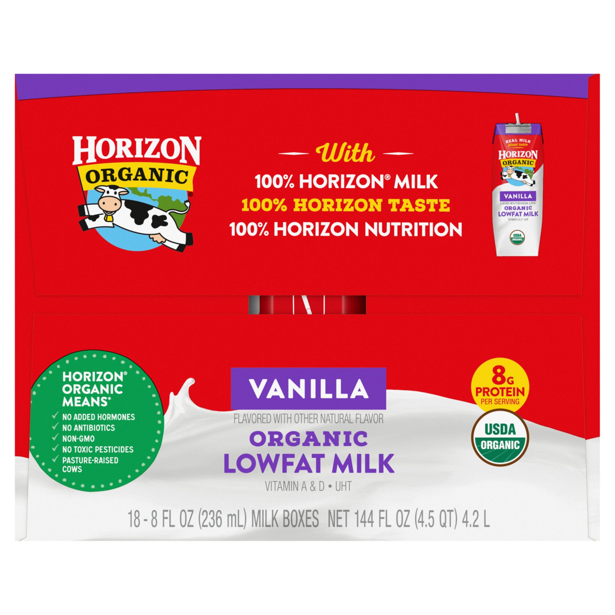 Includes organic low fat milk boxes, 18 pk./8 fl. oz.