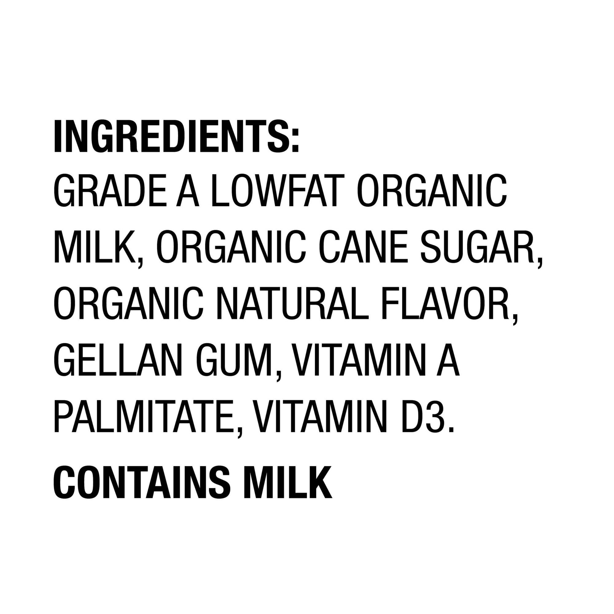 Ingredients: Grade A Lowfat Organic Milk, Organic Cane Sugar, Organic Natural Flavor, Gellan Gum, Vitamin A Palmitate, Vitamin D3.