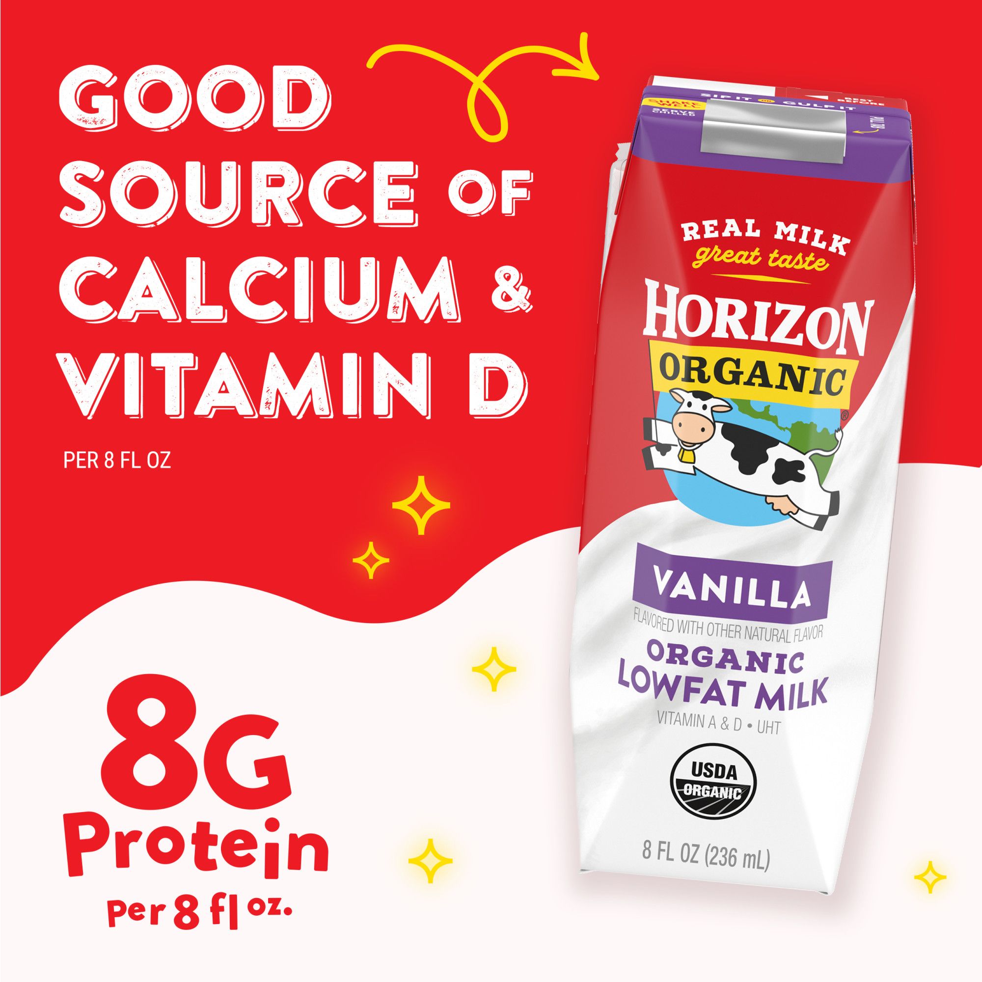 Take the organic goodness of Horizon milk on-the-go with Horizon Organic UHT 1% Low-Fat Vanilla Milk Boxes. Great as a lunchbox stuffer or snack, these single-serve 1% milk boxes offer a wholesome alternative to juice boxes. Each organic milk box provides many nutrients, including vitamin A, vitamin D, and 8 grams of protein. And thanks to their special packaging, these shelf-stable milk boxes lock in delicious taste without refrigeration.