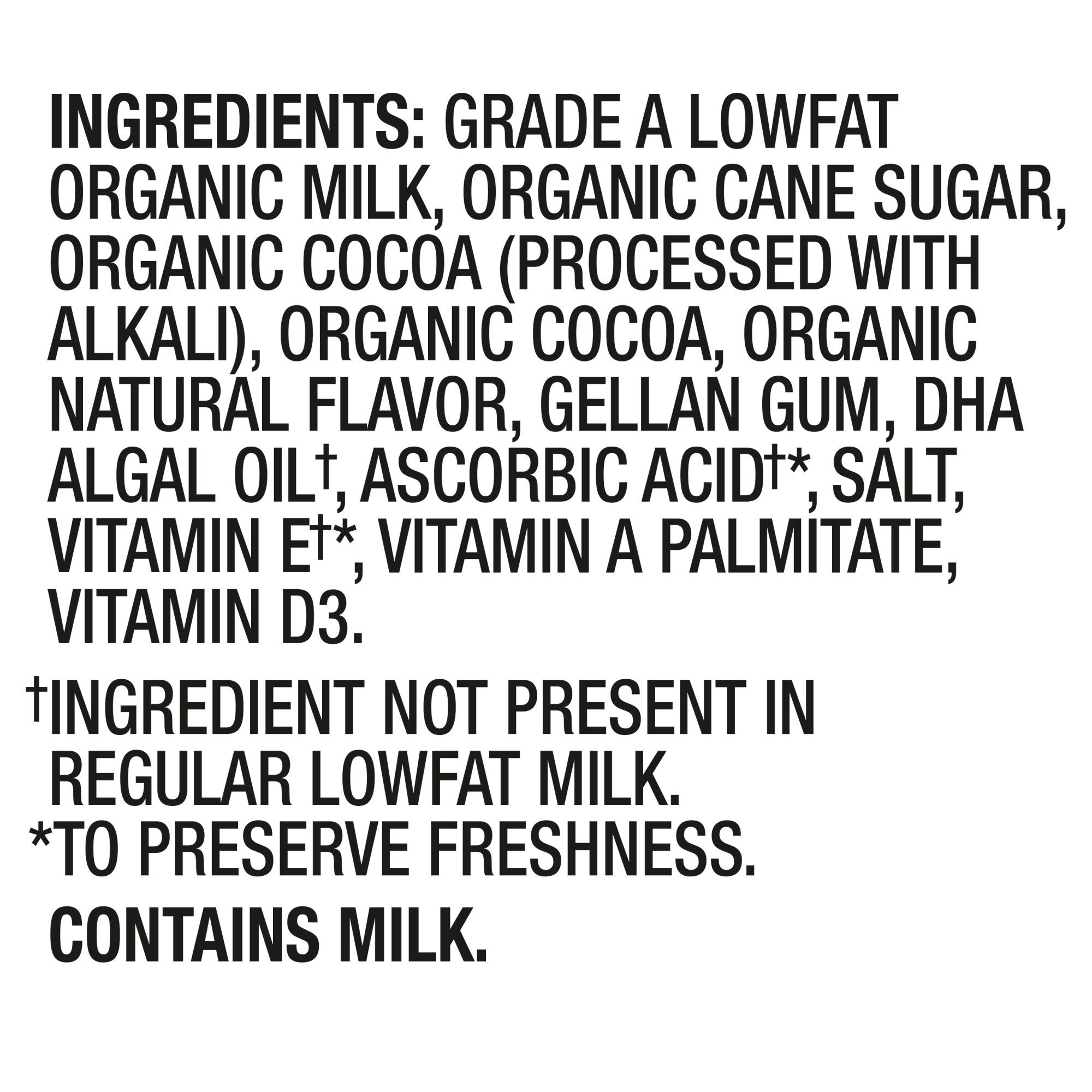 Ingredients: Grade A Lowfat Organic Milk, Organic Cane Sugar, Organic Cocoa (Processed With Alkali), Organic Cocoa, Organic Natural Flavor Gellan Gum, Dha Algal Oil,† Ascorbic Acid And Vitamin E Blend (To Preserve Freshness),† Salt, Vitamin A Palmitate, Vitamin D3. †ingredient Not Present In Regular Lowfat Milk.