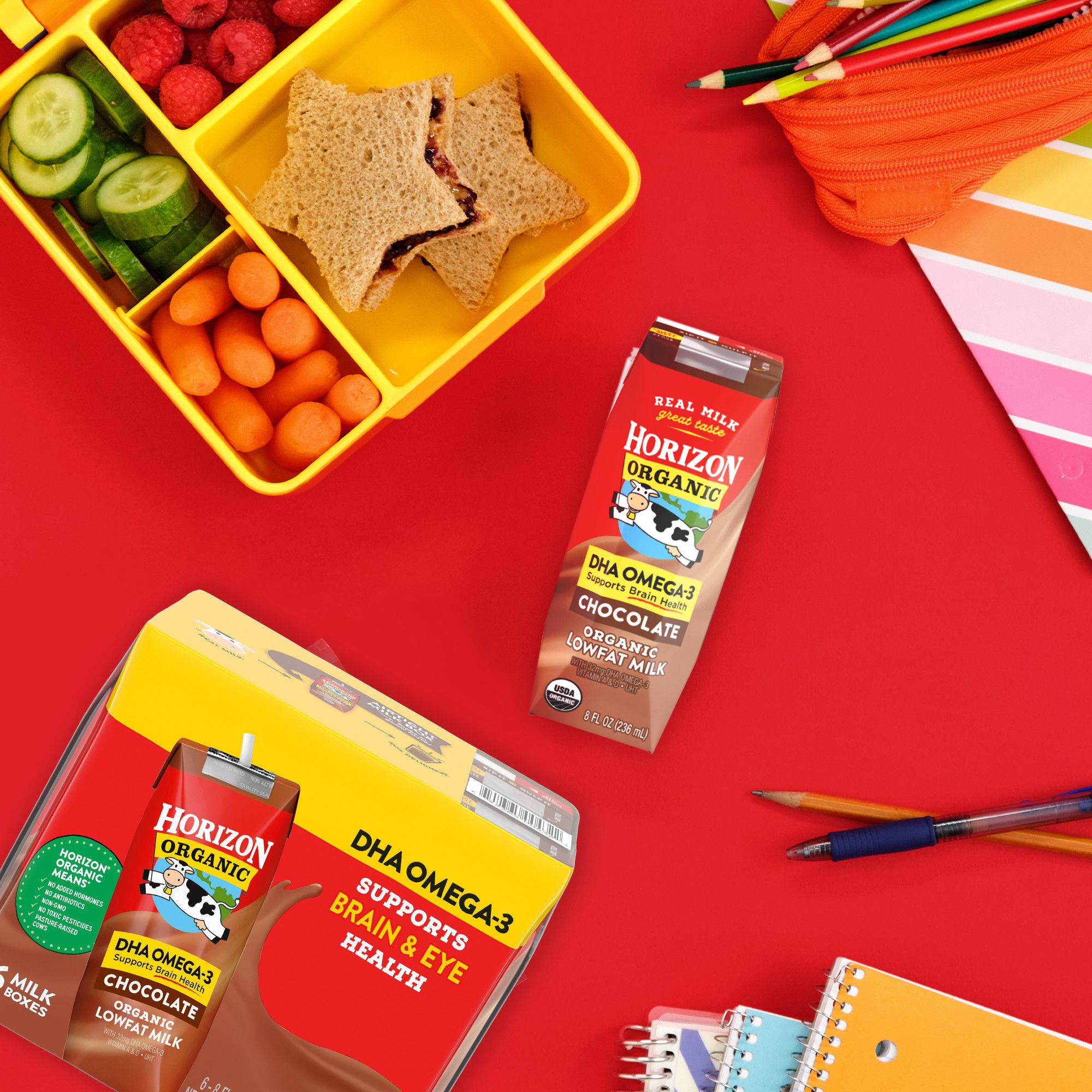 Bring the benefits of DHA to your child’s lunchbox with Horizon Organic UHT 1% lowfat Chocolate Milk Boxes with DHA Omega-3. Each 8-ounce milk box provides 32mg of DHA Omega-3 - a valuable nutrient that may help support brain and eye health. Great as a lunchbox stuffer or snack, these single-serve milk boxes offer a wholesome alternative to juice boxes. And thanks to their special packaging, these shelf-stable milk boxes lock in delicious taste without refrigeration.