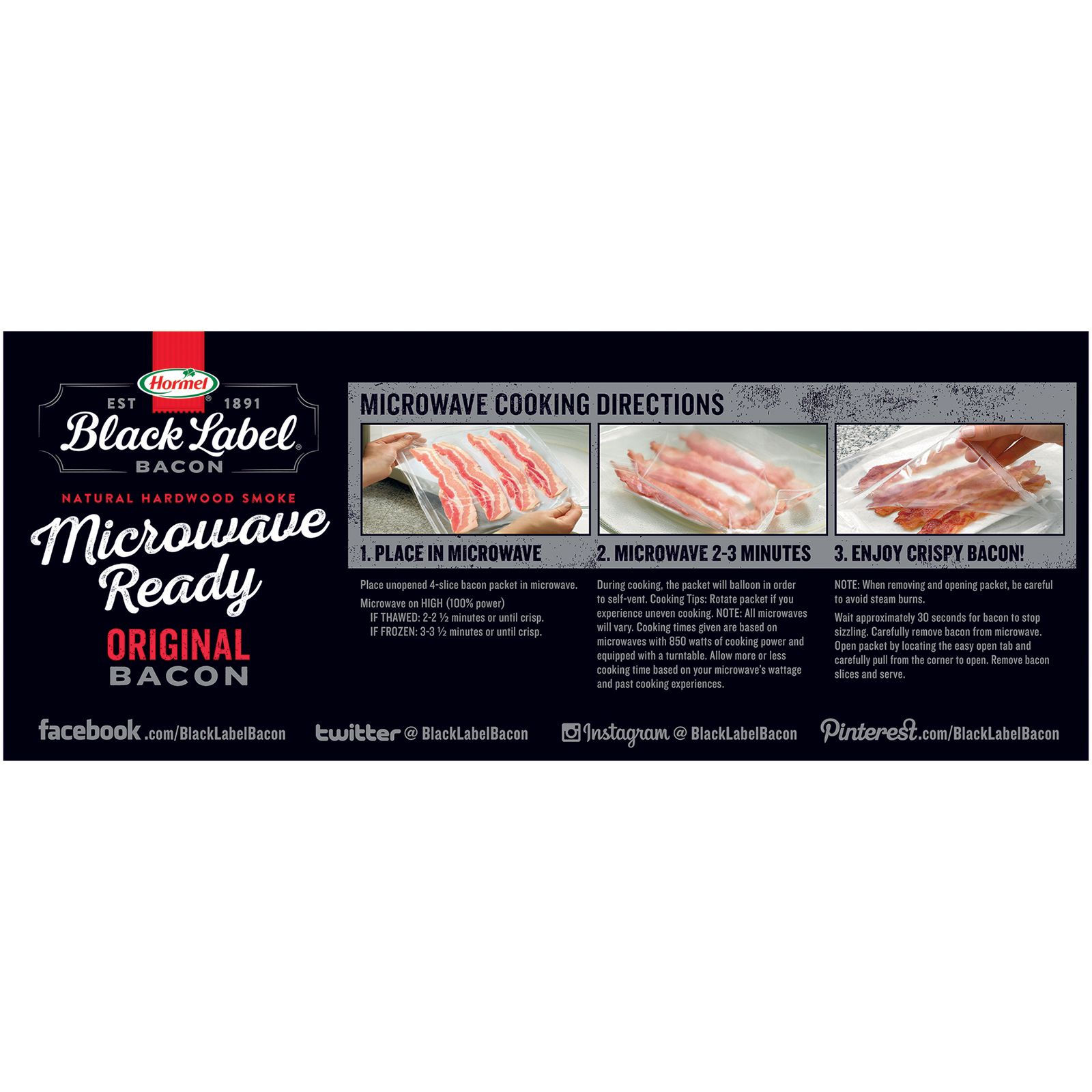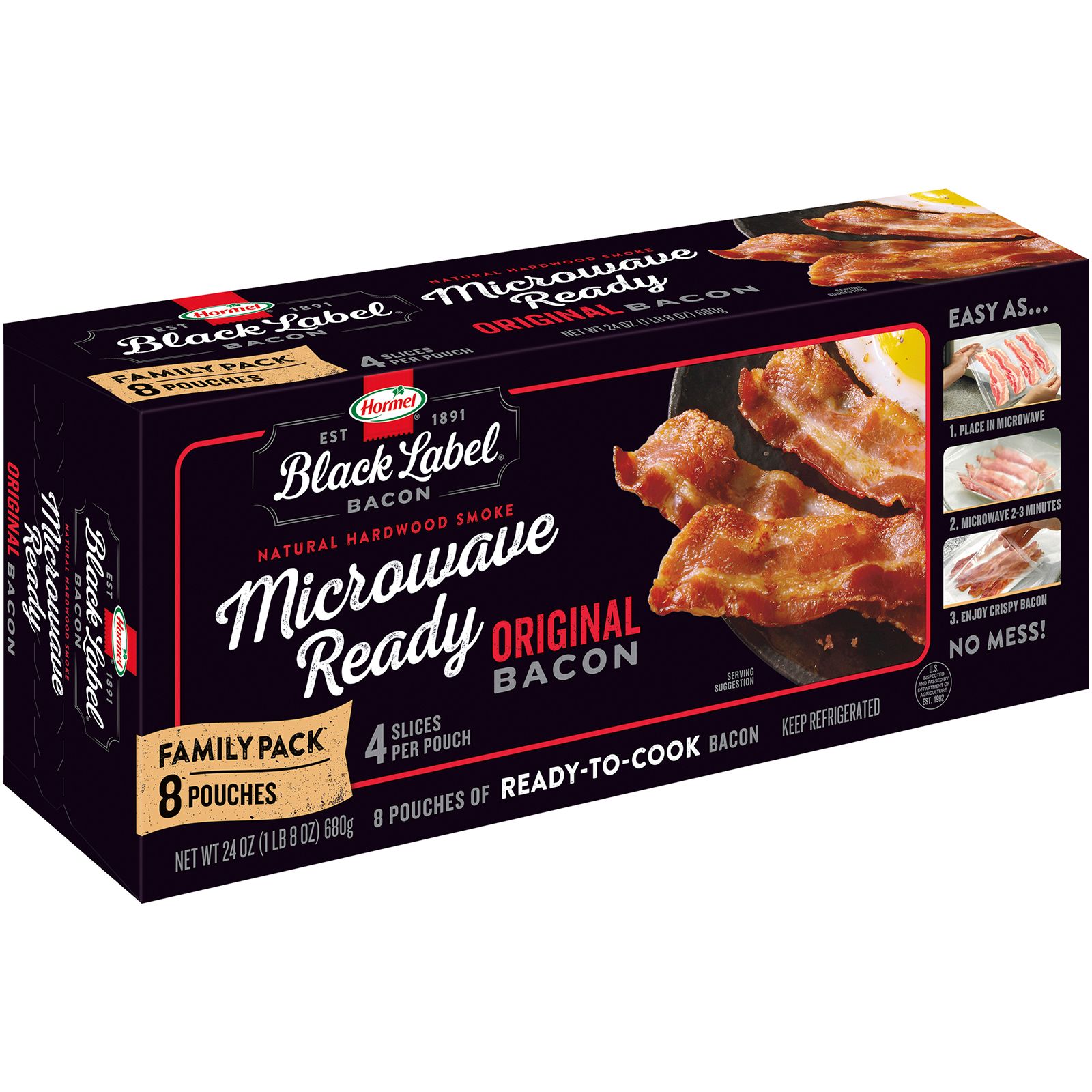 Hormel original bacon is microwave ready Enjoy great tasting bacon in a matter of minutes Great for breakfast for the whole family Unique cooking pack absorbs great No clean up required Keep refrigerated or frozen and refrigerate leftovers immediately or discard Includes 24 oz. of Hormel original microwave ready bacon
