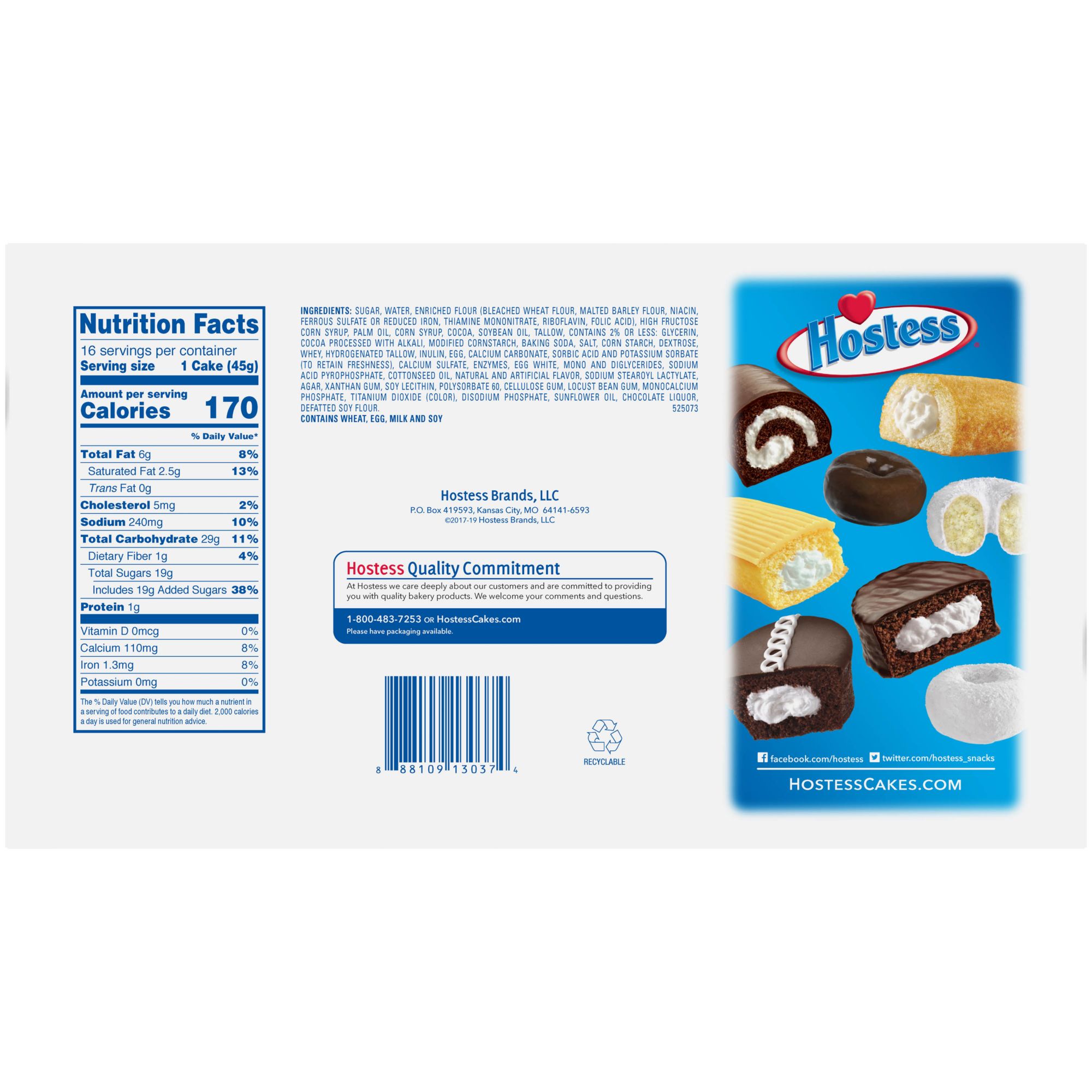 Ingredients: Sugar, Water, Enriched Flour (Bleached Wheat Flour, Malted Barley Flour, Niacin, Ferrous Sulfate or Reduced Iron, Thiamine Mononitrate, Riboflavin, Folic Acid), High Fructose Corn Syrup, Palm Oil, Corn Syrup, Cocoa, Soybean Oil, Tallow, Contains 2% or Less: Glycerin, Cocoa Processed with Alkali, Modified Cornstarch, Baking Soda, Salt, Corn Starch, Dextrose, Whey, Hydrogenated Tallow, Inulin, Egg, Calcium Carbonate, Sorbic Acid and Potassium Sorbate (to Retain Freshness), Calcium Sulfate, Enzymes, Egg White, Mono and Diglycerides, Sodium Acid Pyrophosphate, Cottonseed Oil, Natural and Artificial Flavor, Sodium Stearoyl Lactylate, Agar, Xanthan Gum, Soy Lecithin, Polysorbate 60, Cellulose Gum, Locust Bean Gum, Monocalcium Phosphate, Titanium Dioxide (Color), Disodium Phosphate, Sunflower Oil, Chocolate Liquor, Defatted Soy Flour.
