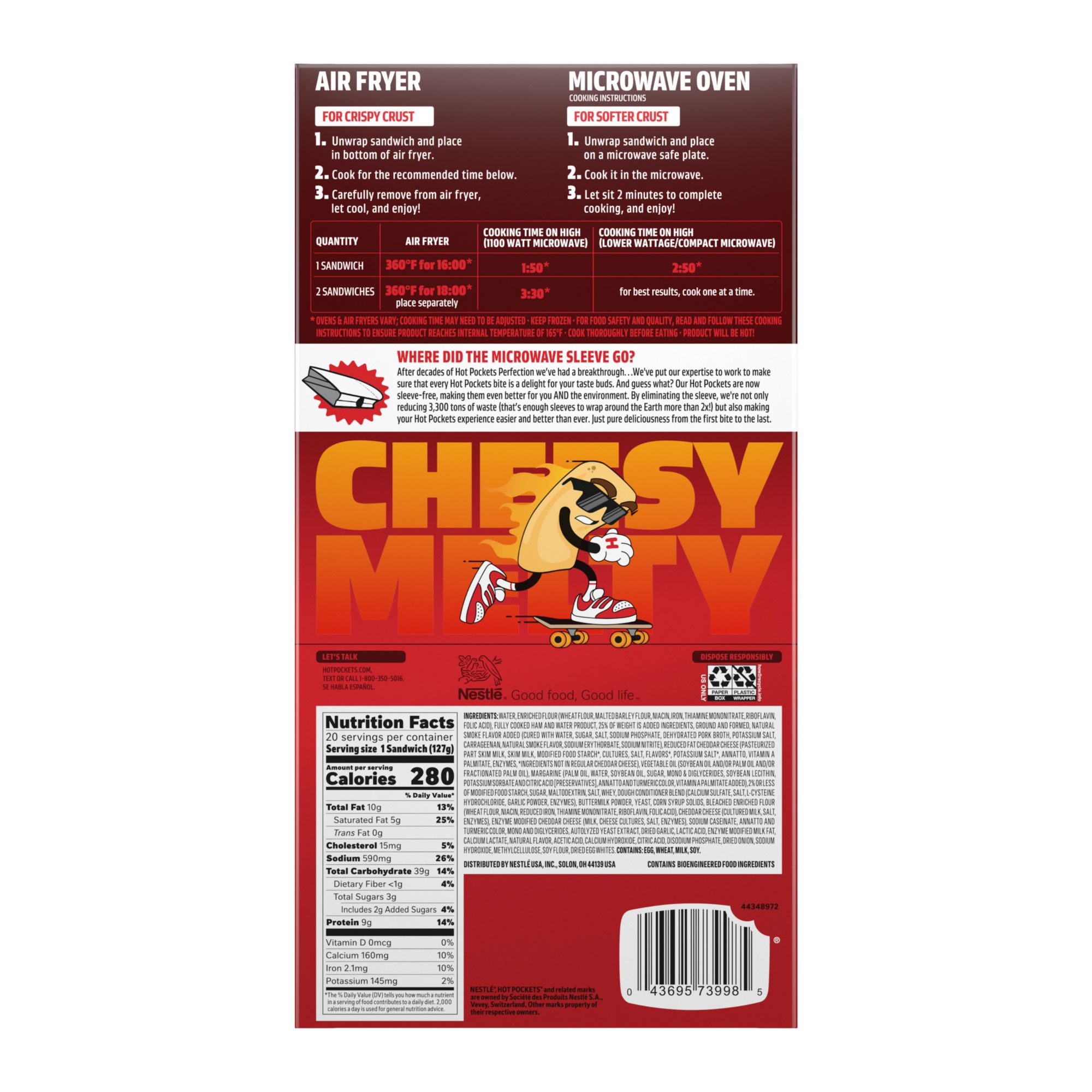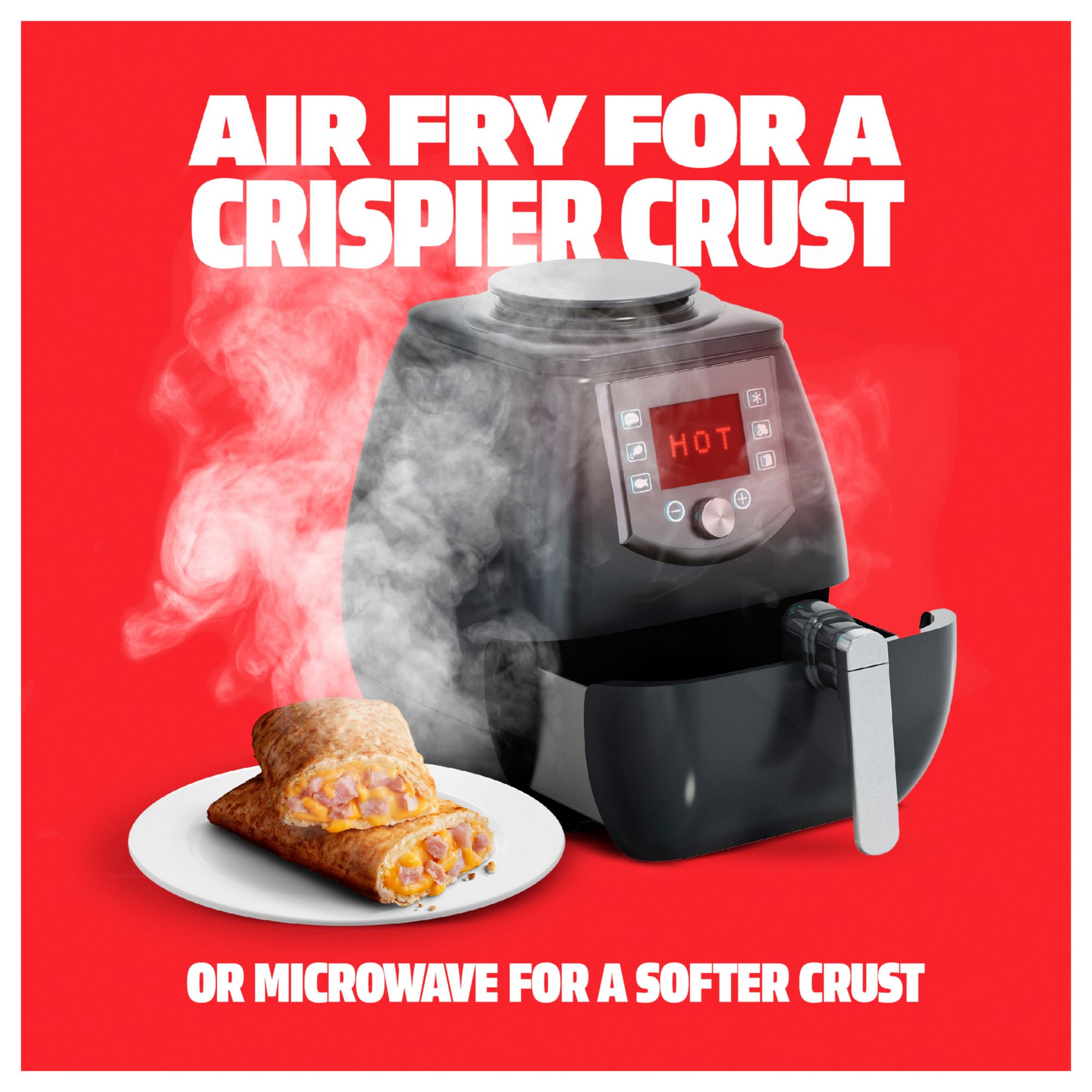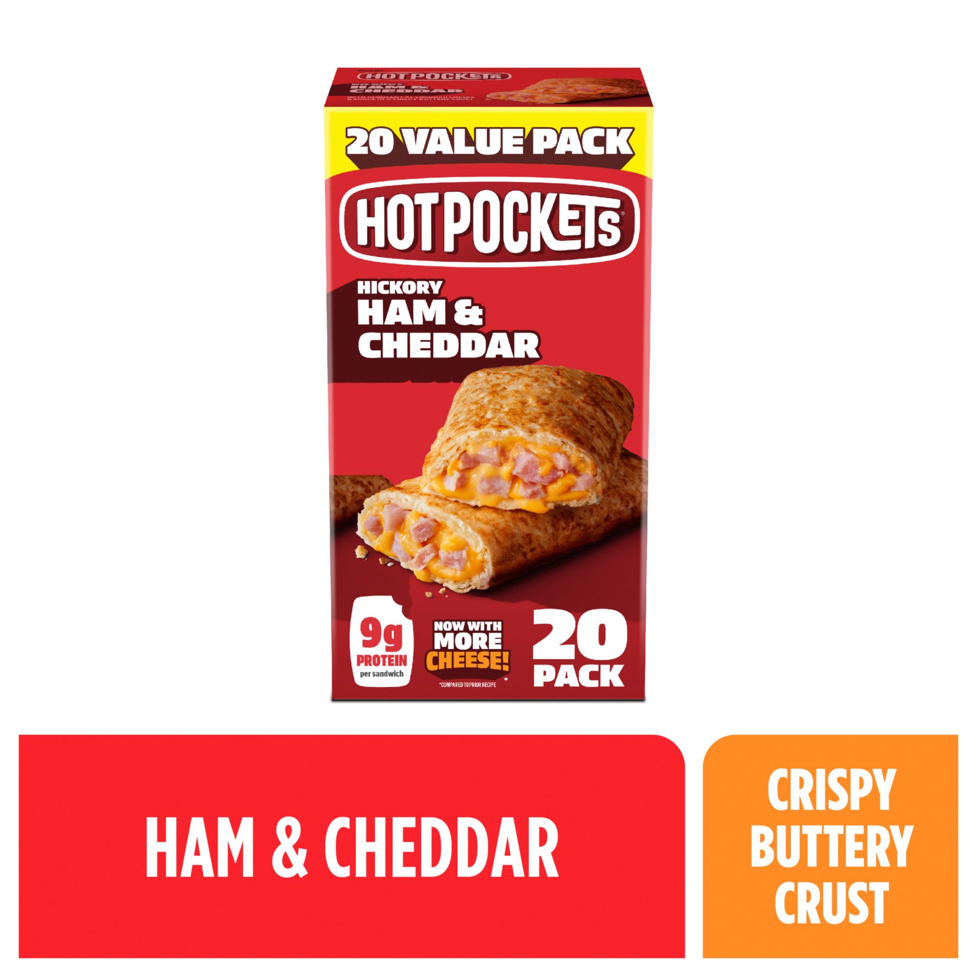 Hot Pockets Hickory Ham & Cheddar snack pockets make a perfect choice for an easy lunch, dinner, or between meal snack. Hot Pockets Ham & Cheddar sandwiches are stuffed with hickory ham and reduced fat cheddar cheese, and all of this deliciousness is wrapped in a crispy buttery crust. Each of these sandwiches is packed with 8 grams of protein, contain no artificial flavors, and use only 100% real cheese. This Hot Pocket sandwich is hot from the microwave in just two minutes and ten seconds, making them the perfect solution for when you are short on time and need a quick meal or snack. Keep frozen until ready to prepare.