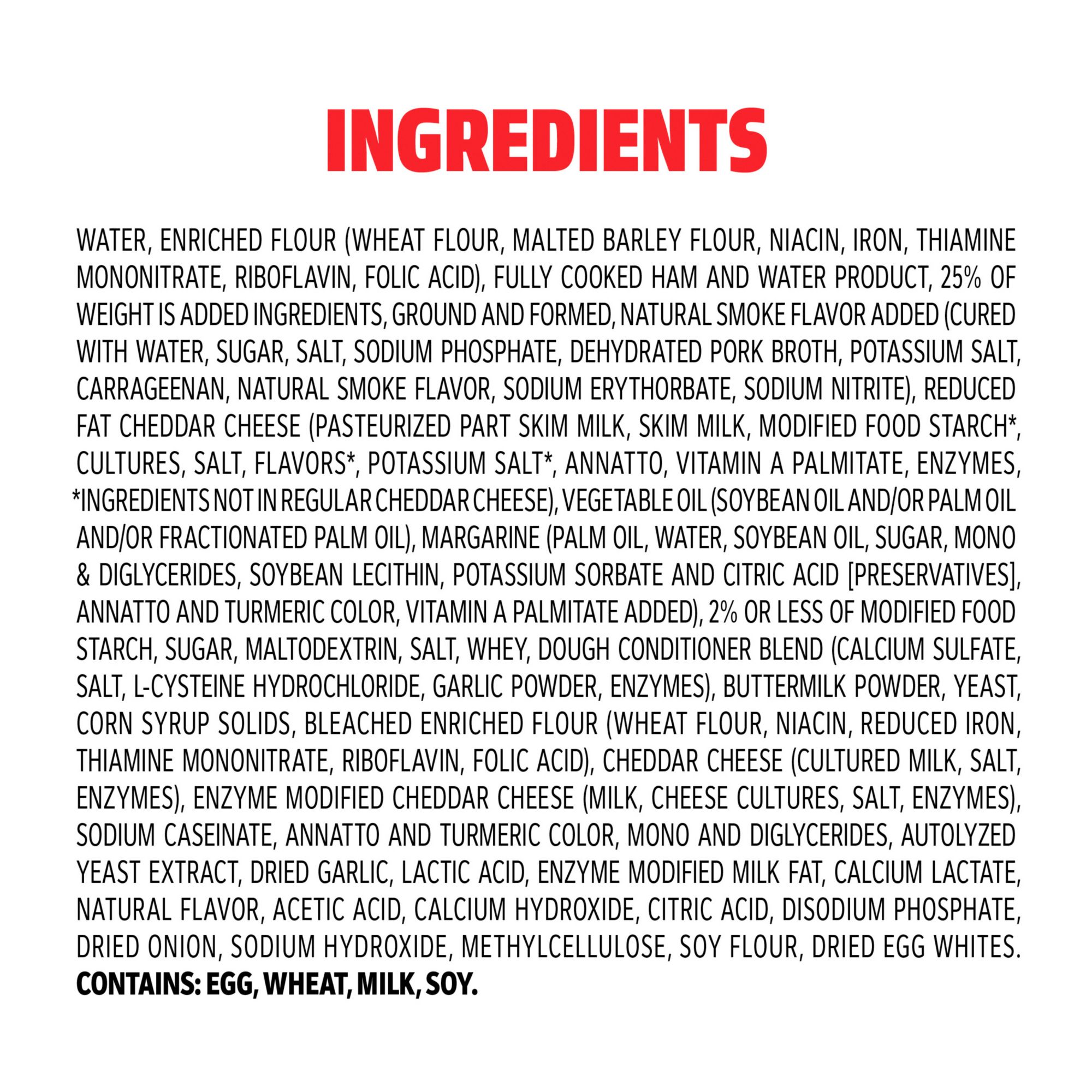 Ingredients: Unbleached Enriched Flour (Wheat Flour, Malted Barley Flour, Niacin, Iron, Thiamine Mononitrate, Riboflavin, Folic Acid), Water, Sugar, Salt, Dough Conditioner Blend (Calcium Sulfate, Salt, L-cysteine Hydrochloride, Garlic Powder, Tricalcium Phosphate, Enzymes [Wheat]), Soy Lecithin, Natural Butter Flavor, Palm Oil, Yeast, Vegetable Oil (Soybean Oil And/or Canola Oil), Fully Cooked Ham And Water Product, 25% Of Weight Is Added Ingredients, Ground And Formed, Natural Smoke Flavor Added (Cured With Water, Sugar, Salt, Sodium Phosphate, Dehydrated Pork Broth, Potassium Chloride, Carrageenan, Natural Smoke Flavor, Sodium Erythorbate, Sodium Nitrate), Water, Reduced Fat Cheddar Cheese (Pasteurized Part Skim Milk, Skim Milk, Modified Food Starch*, Cultures, Salt, Flavors*, Potassium Chloride*, Annatto, Vitamin A Palmitate, Enzymes, *Ingredients Not In Regular Cheddar Cheese), 2% Or Less Of Margarine (Palm Oil, Water, Soybean Oil, Sugar, Mono & Diglycerides, Soybean Lecithin, Potassium Sorbate And Citric Acid [Preservatives], Annatto And Turmeric Color, Vitamin A Palmitate Added), Modified Cornstarch, Maltodextrin, Fractionated Palm Oil, Whey, Creamer (Coconut Oil, Corn Syrup Solids, Sodium Caseinate [Milk], Mono And Diglycerides, Dipotassium Phosphate, Soy Lecithin), Buttermilk Powder, Bread Crumbs (Bleached Wheat Flour, Dextrose, Yeast, Salt), Salt, Seasoning (Flavoring, Cheddar Cheese [Cultured Milk, Salt, Enzymes], Whey, Maltodextrin, Whey Protein Concentrate, Buttermilk Fat, Enzyme Modified Yeast Extractives, Modified Cornstarch, Salt, Garlic Powder, 2% Or Less Of Disodium Phosphate, Citric Acid, Lactic Acid, Mixed Triglycerides, Onion Powder), Bleached Enriched Flour (Wheat Flour, Amylase, Ascorbic Acid, Niacin, Iron, Thiamine Mononitrate, Riboflavin, Folic Acid), Sugar, Annatto (Color), Seasoning (Cornstarch, Extractives Of Turmeric And Annatto, Natural Flavor), Lactic Acid Blend (Lactic Acid, Calcium Lactate), Methylcellulose, Soy Flour, Dried Egg Whites.