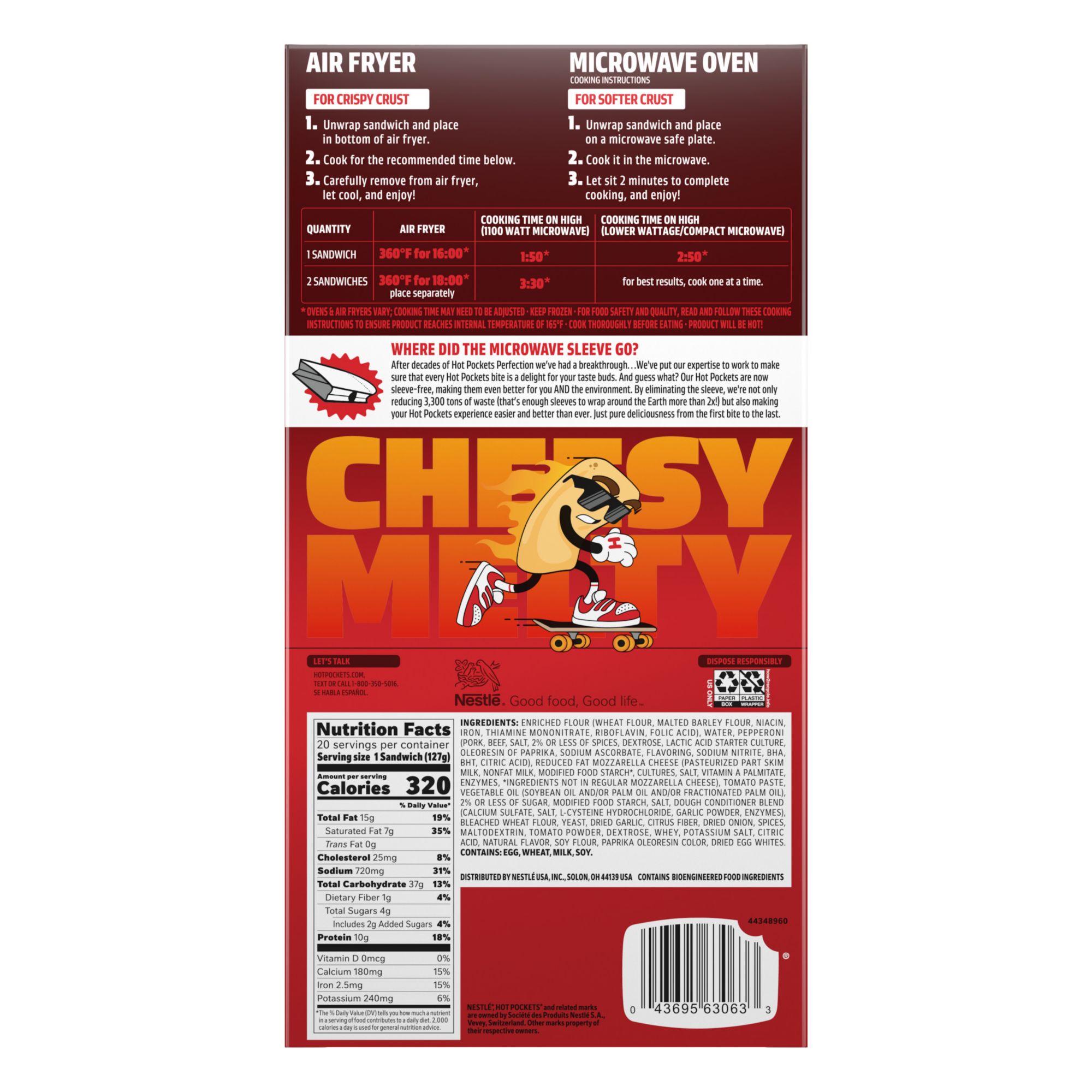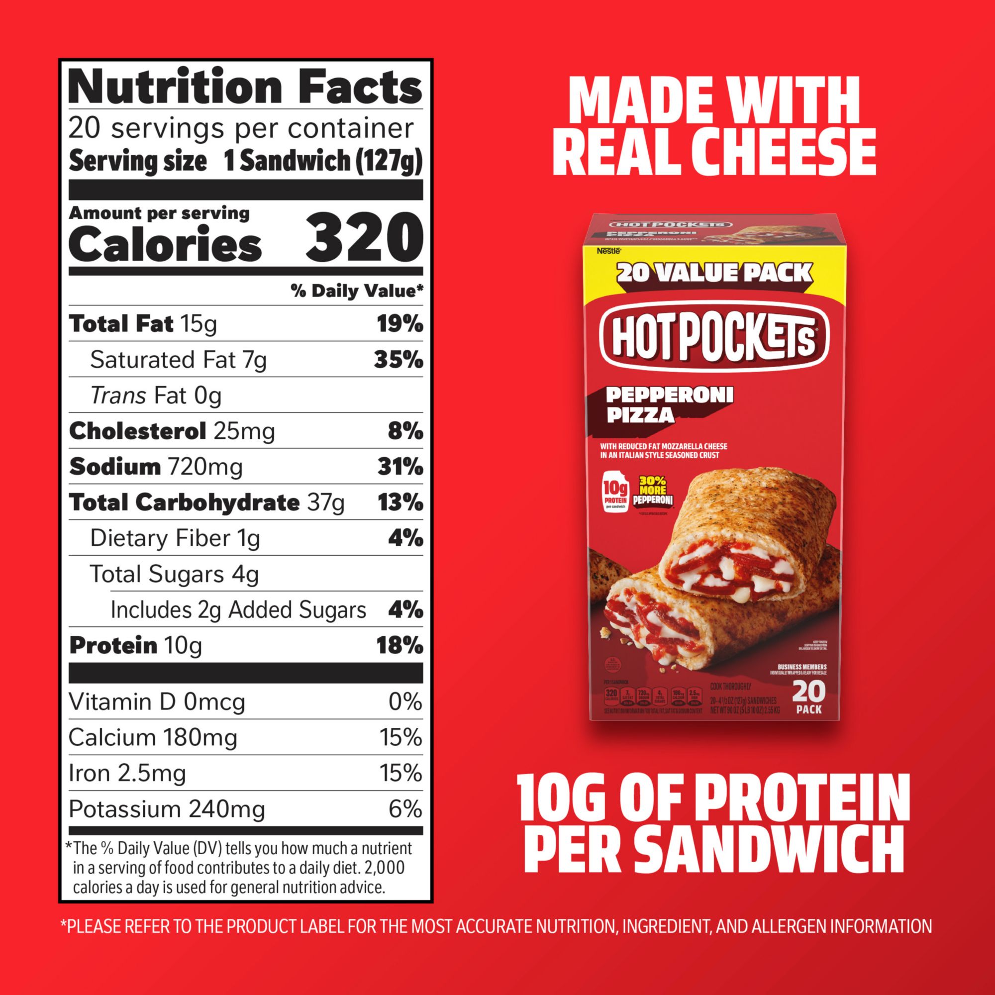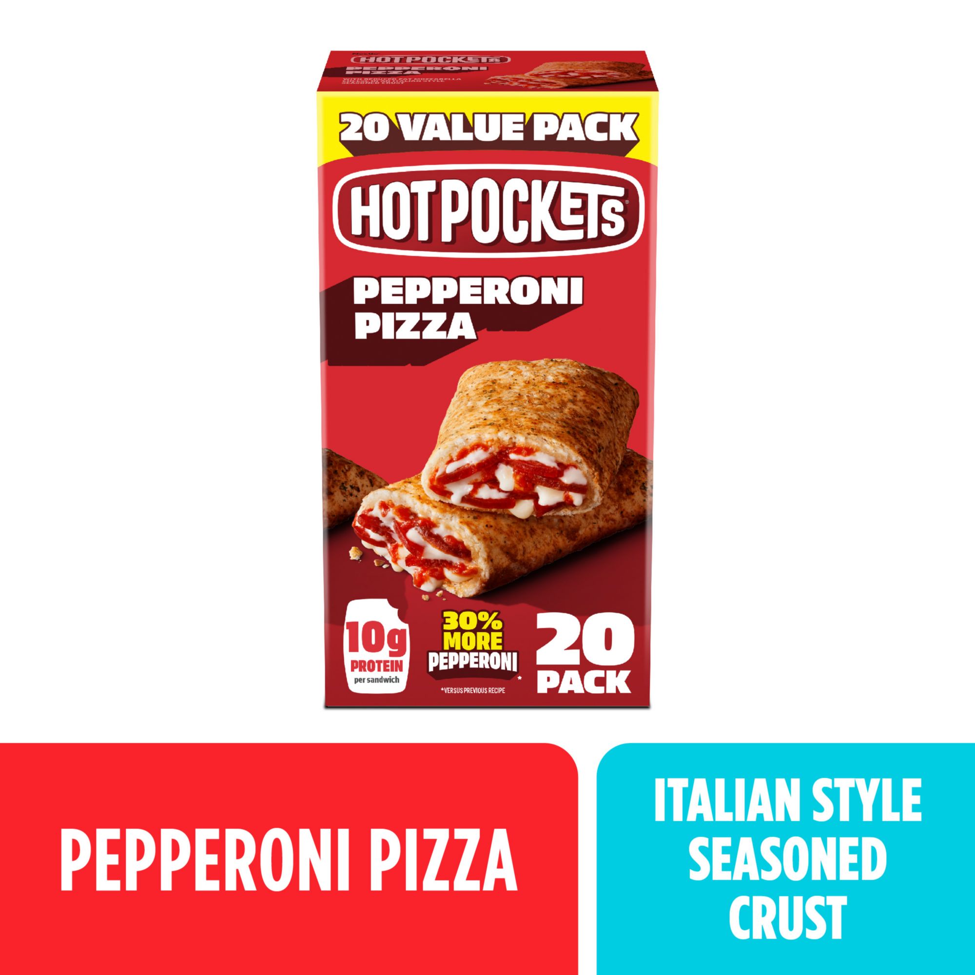 Hot Pockets Pepperoni Pizza snack pockets make a perfect choice for an easy lunch, dinner, or between meal snack. Hot Pockets Pepperoni Pizza pockets are sandwiches stuffed with pepperoni made from both beef and pork, 100% real reduced fat mozzarella cheese, and a perfectly flavored pizza sauce. All of this craveable deliciousness is wrapped in a crispy buttery crust. Each of these sandwiches is packed with 10 grams of protein, contain no artificial flavors, and use only 100% real cheese. This Hot Pocket sandwich is hot from the microwave in just 2 minutes, or you can air fry or bake them if preferred. They make the perfect solution for late night gaming, after school snack, or a quick and easy meal. This is true comfort food that is ready in a matter of minutes! Keep frozen until ready to prepare.