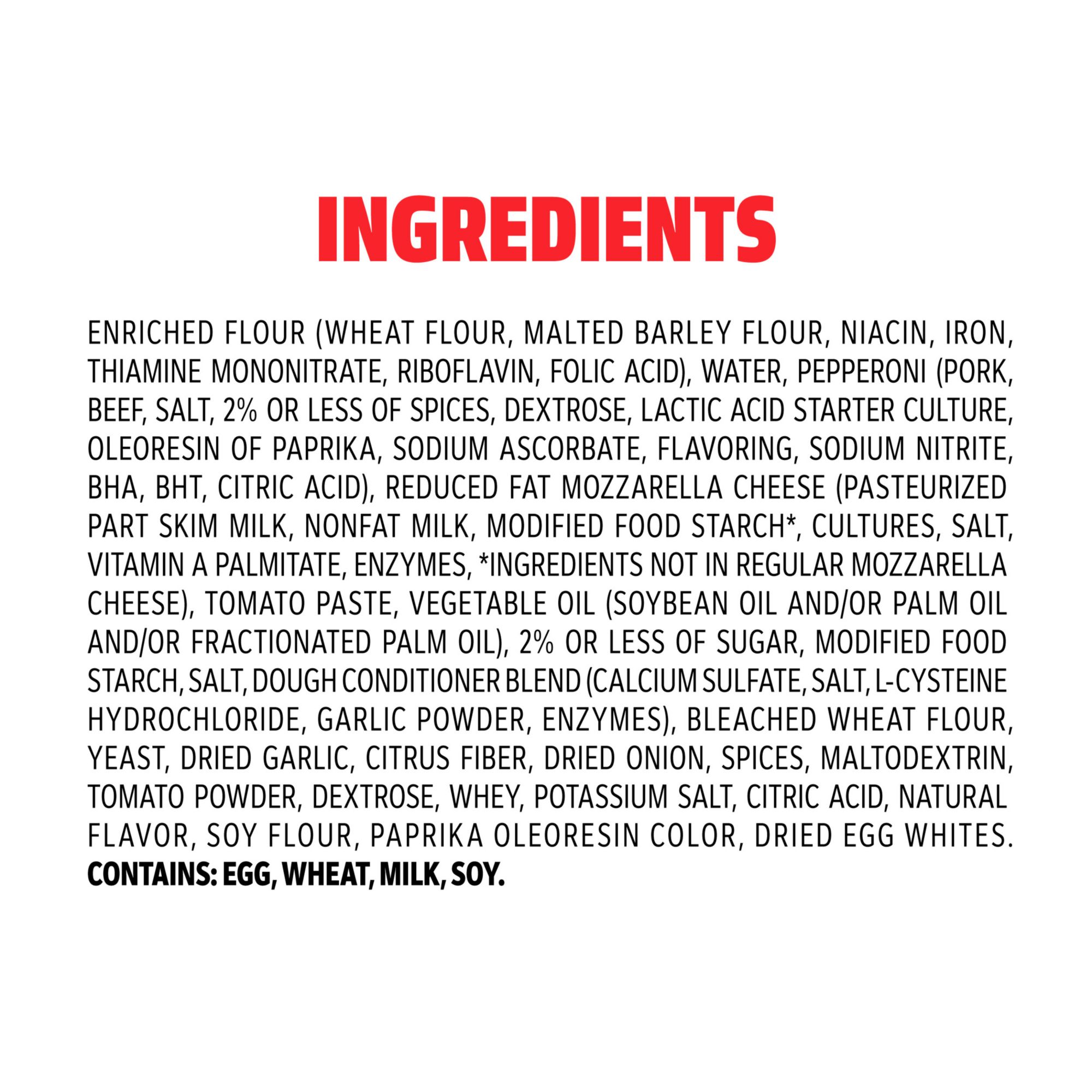 Ingredients: Enriched Flour (Wheat Flour, Malted Barley Flour, Niacin, Iron, Thiamine Mononitrate, Riboflavin, Folic Acid), Water, Reduced Fat Mozzarella Cheese (Pasteurized Part Skim Milk, Nonfat Milk, Modified Food Starch*, Cultures, Salt, Vitamin A Palmitate, Enzymes, *Ingredients Not In Regular Mozzarella Cheese), Pepperoni Made With Pork, Chicken, And Beef (Pork, Mechanically Separated Chicken, Beef, Salt, Contains 2% Or Less Of Spices, Dextrose, Lactic Acid Starter Culture, Oleoresin Of Paprika, Sodium Ascorbate, Flavoring, Sodium Nitrite, Bha, Bht, Citric Acid), Tomato Paste, Soybean Oil, 2% Or Less Of Salt, Sugar, Seasoning (Bread Crumb [Bleached Wheat Flour, Dextrose, Yeast, Salt], Dried Garlic, Tomato Powder, Spice, Salt, Dextrose, Dried Onion, Maltodextrin, Citric Acid, Natural Flavor), Modified Cornstarch, Fractionated Palm Oil, Yeast, Dough Conditioner Blend (Calcium Sulfate, Salt, L-cysteine Hydrochloride, Garlic Powder, Tricalcium Phosphate, Enzymes, [Wheat]), Soy Lecithin, Dried Garlic, Sodium Stearoyl Lactylate, Seasoning (Maltodextrin, Modified Corn Starch, Butter Flavor), Methylcellulose, Flavor (Maltodextrin, Modified Corn Starch, Natural Flavors, Datem, Medium Chain Triglycerides), Dried Onions, Spices, Whey, Maltodextrin, Potassium Chloride, Citric Acid, Soy Flour, Egg Whites.