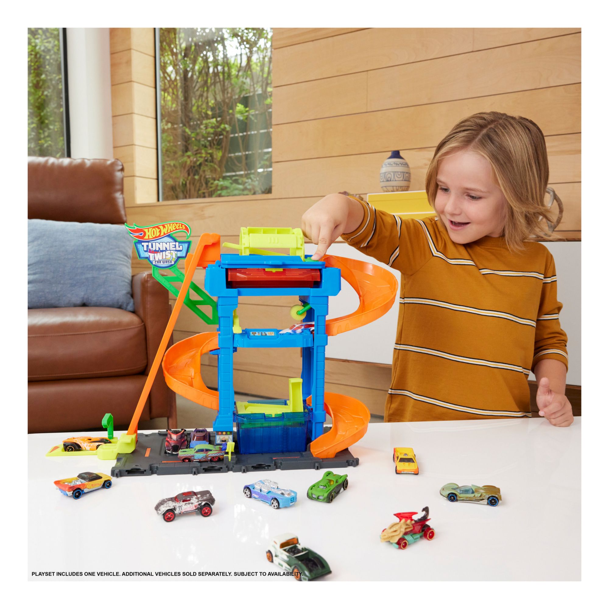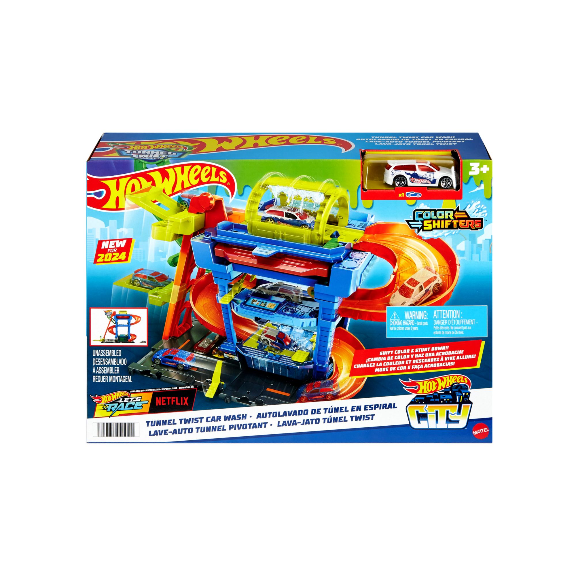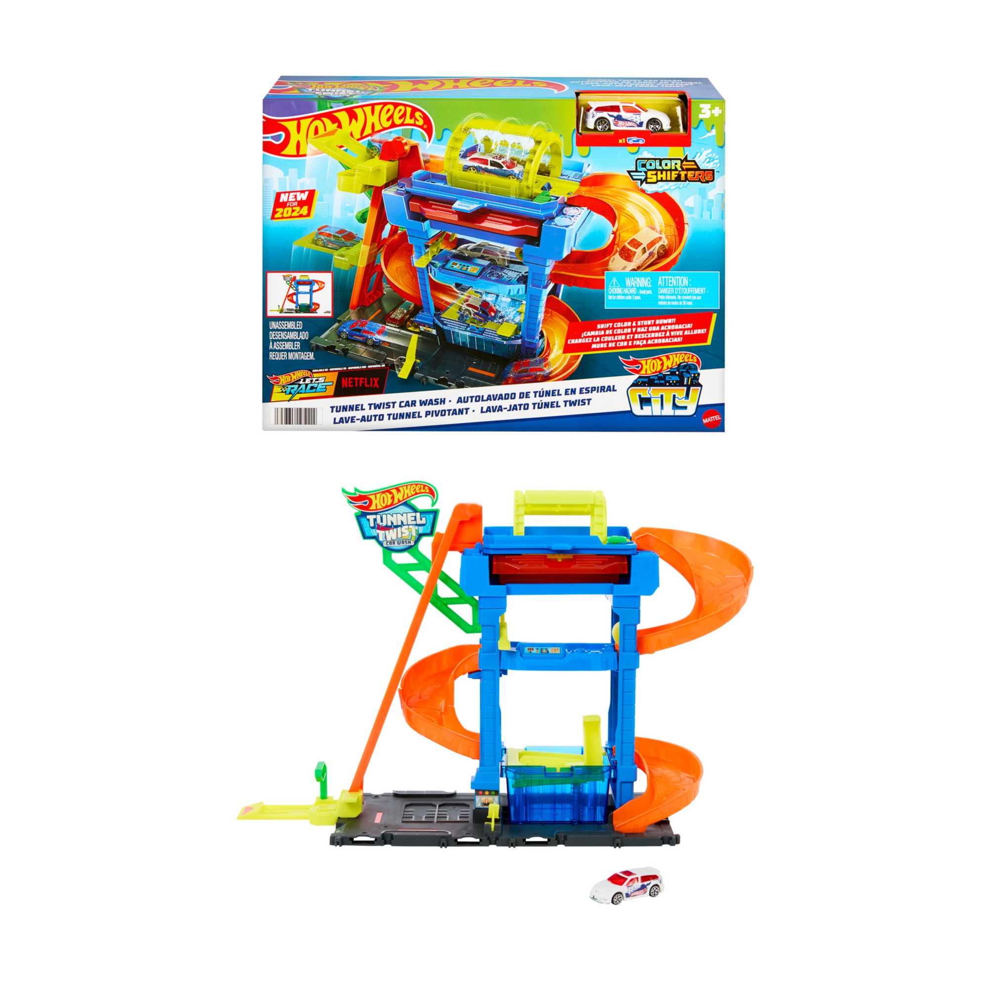 Includes a Hot Wheels city tunnel twist car wash and one Hot Wheels color shifters car in 1:64 scale